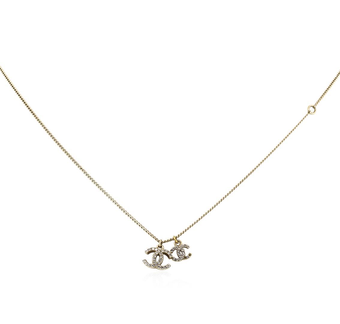 100% Authentic Chanel Double Logo Long Necklace. This beautiful designer necklace is made form a gold toned chain and features two signature Chanel interlocking CC logo charms. Both charms are adorned with shimmering crystals. The back of the necklace is beautiful as well. It features two ornate Chanel charms and an easy to use lobster claw clasp. Necklace can be worn long or clasped on the offered o-rings for different variations. This item was cared for by a previous owner but due to its vintage nature, the item shows signs of normal wear. Please see pictures. Comes with original Chanel box and tag.