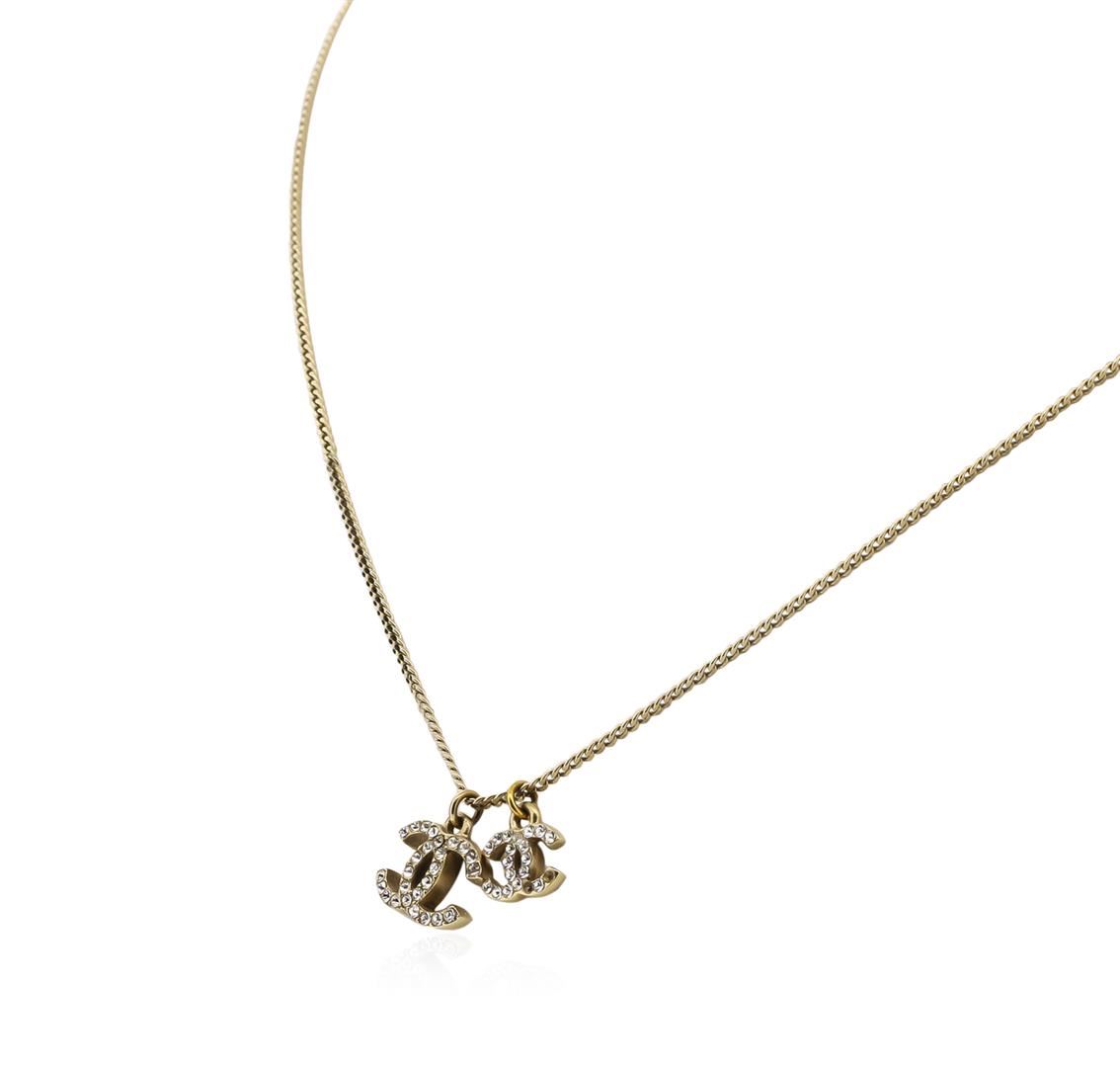 100% Authentic Chanel Double Logo Long Necklace. This beautiful designer necklace is made form a gold toned chain and features two signature Chanel interlocking CC logo charms. Both charms are adorned with shimmering crystals. The back of the necklace is beautiful as well. It features two ornate Chanel charms and an easy to use lobster claw clasp. Necklace can be worn long or clasped on the offered o-rings for different variations. This item was cared for by a previous owner but due to its vintage nature, the item shows signs of normal wear. Please see pictures. Comes with original Chanel box and tag.