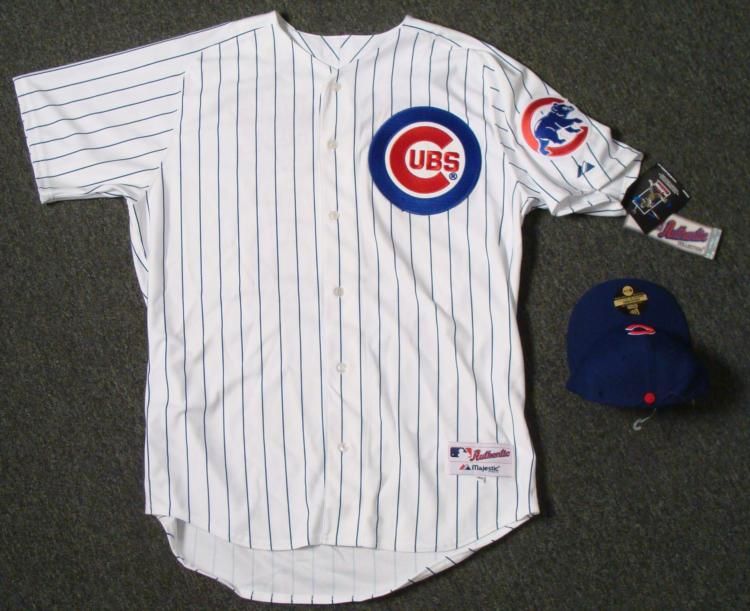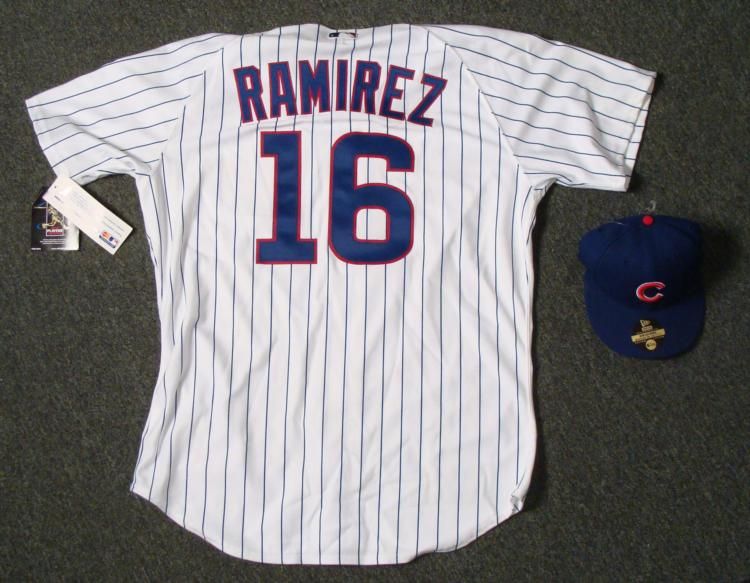 The Chicago Cubs are in the rebuilding stage; new management, new owner, and a few faces. They have some pieces to build their franchise around, but are not quite there yet. Offered here is a Chicago Cubs jersey and hat. The jersey is from Majestic, is authentic, is a size 48, and comes with its original tags. It is all white with blue pin stripes, has the Cubs logo on front and left sleeve, and Aramis's name and number are on the back. The hat is all blue with the Cubs logo on front, is a size 6 7/8, and is from New Era. Both items are in mint condition. What's a better way to start your very own Chicago Cubs collection than bidding on these great items today!! *
