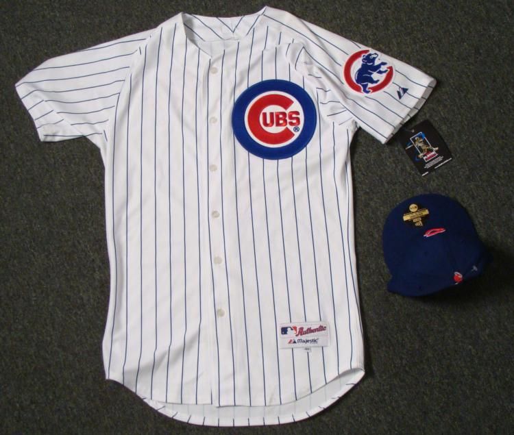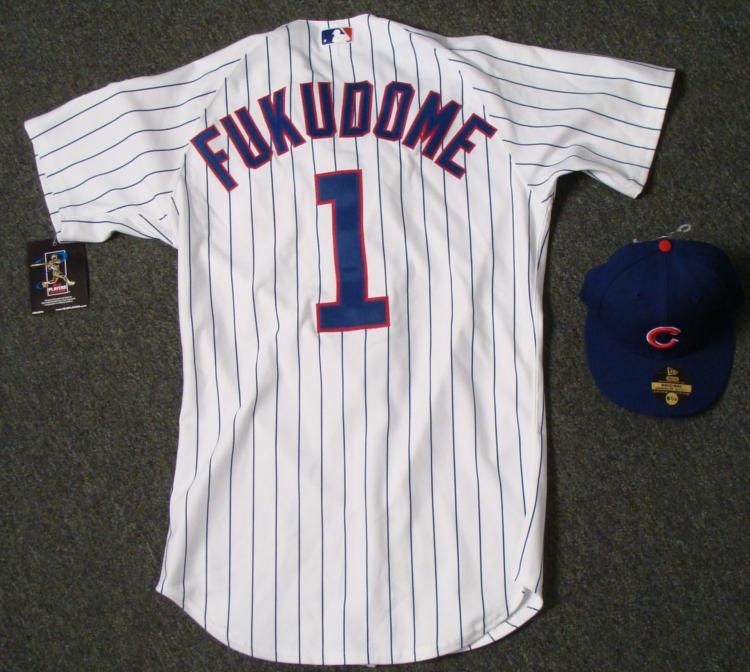 The Chicago Cubs are in the rebuilding stage; new management, new owner, and a few faces. They have some pieces to build their franchise around, but are not quite there yet. Offered here is a Chicago Cubs jersey and hat. The jersey is from Majestic, is authentic, is a size 48, and comes with its original tags. It is all white with blue pin stripes, has the Cubs logo on front and left sleeve, and Kosuke's name and number are on the back. The hat is all blue with the Cubs logo on front, is a size 6 7/8, and is from New Era. Both items are in mint condition. What's a better way to start your very own Chicago Cubs collection than bidding on these great items today!!