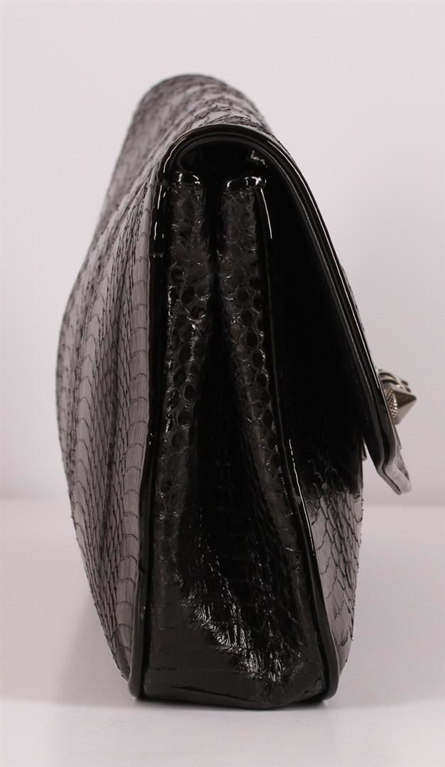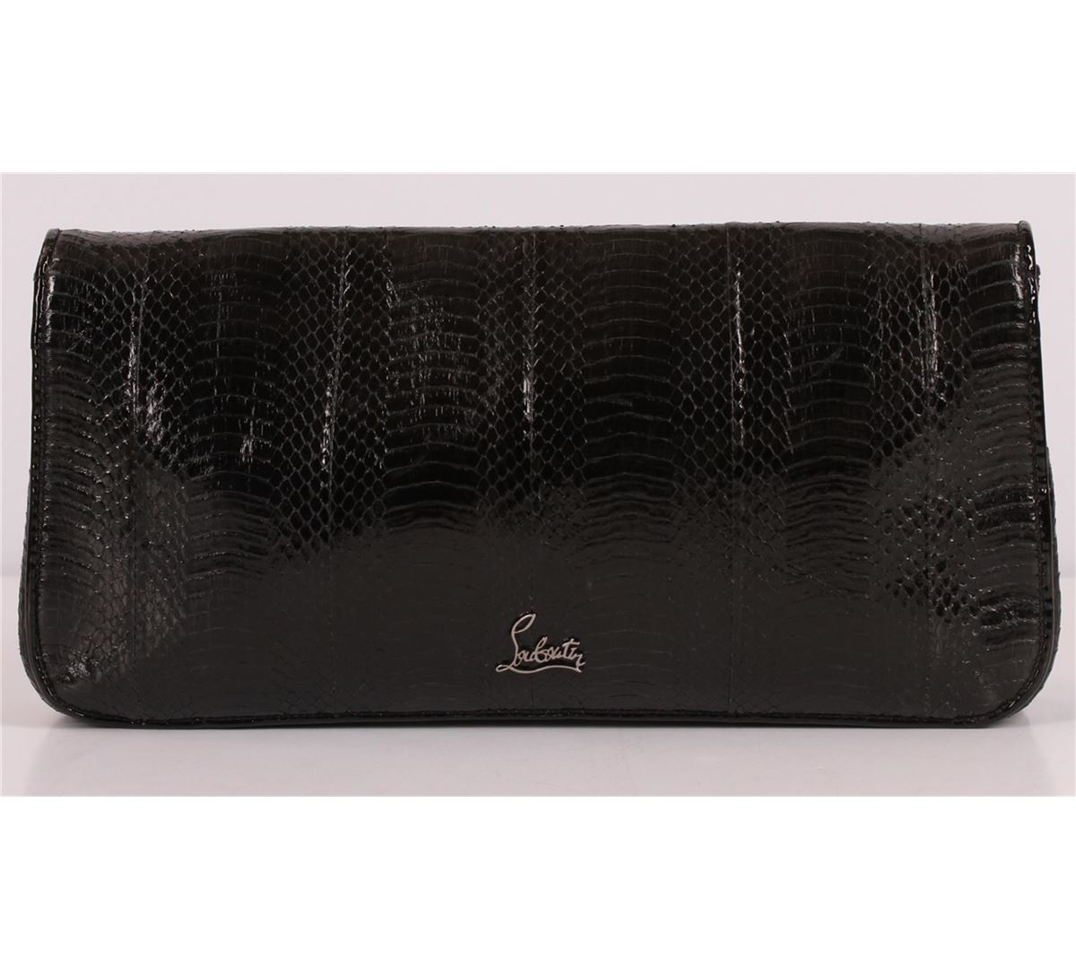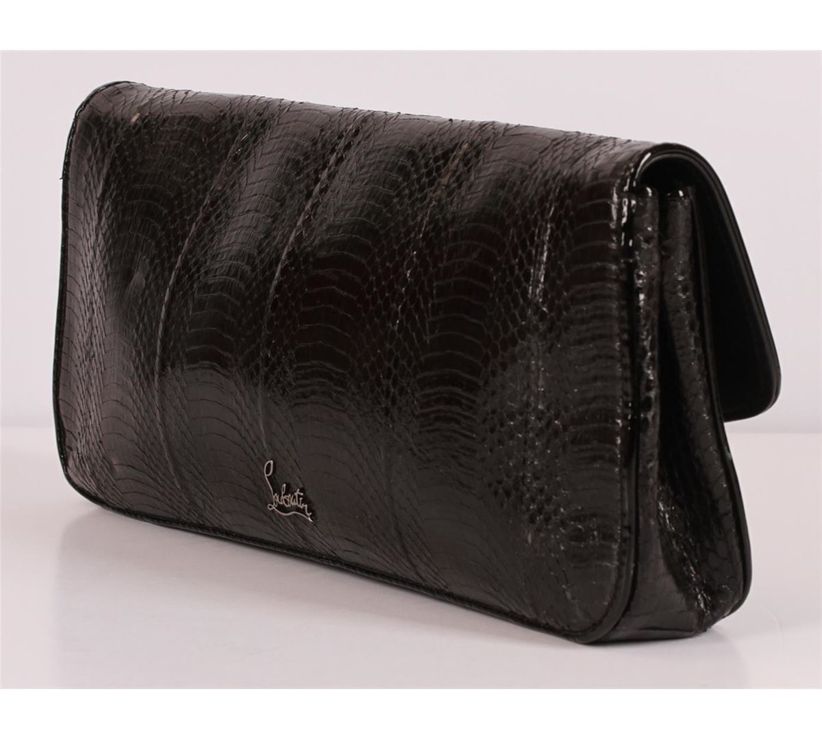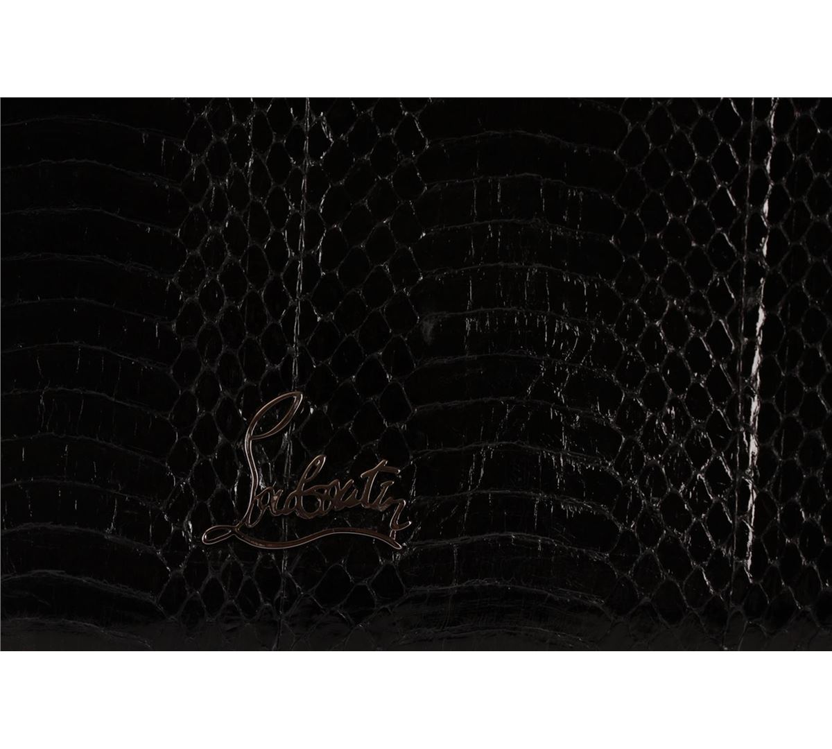 100% authentic Christian Louboutin Black Python Clutch. Luxurious black glazed snakeskin covers the exterior of this stunning evening bag. Three gunmetal spikes pinch together for access and closure of the purse. Features include the Christian Louboutin signature red fabric lined interior with zipped pocket and logo detail at back. Condition is good with some signs of wear on hardware, lining and edges of bag. Please see pictures. This rare Christian Louboutin Python Clutch is the perfect way to add texture and luxury to any outfit.