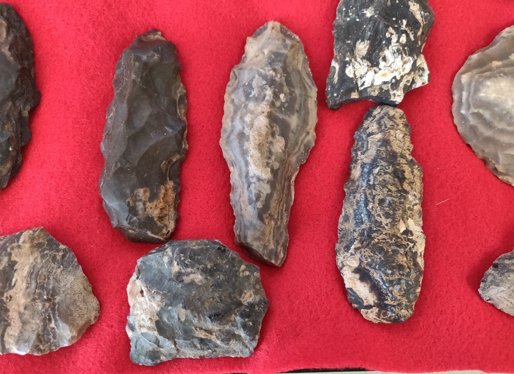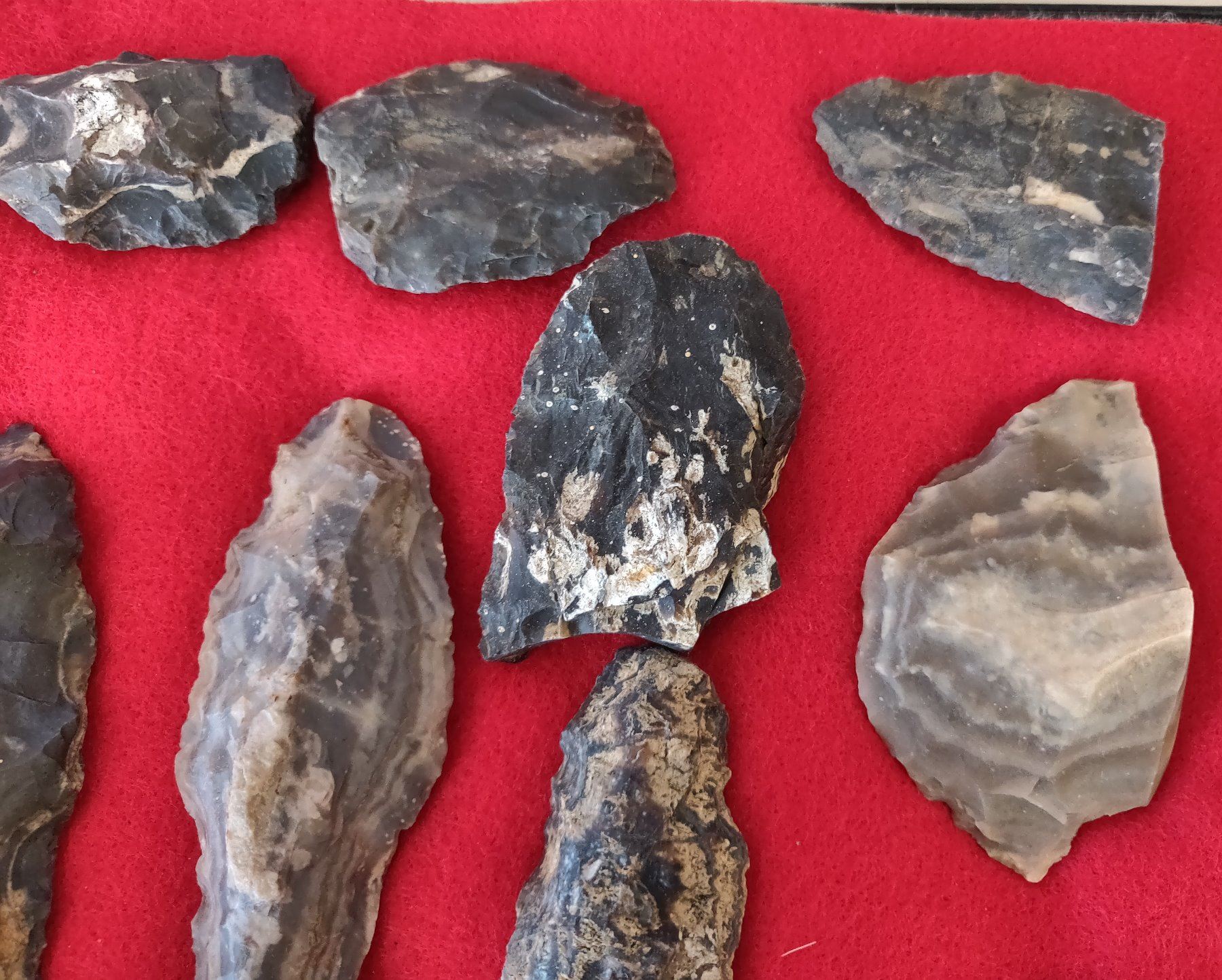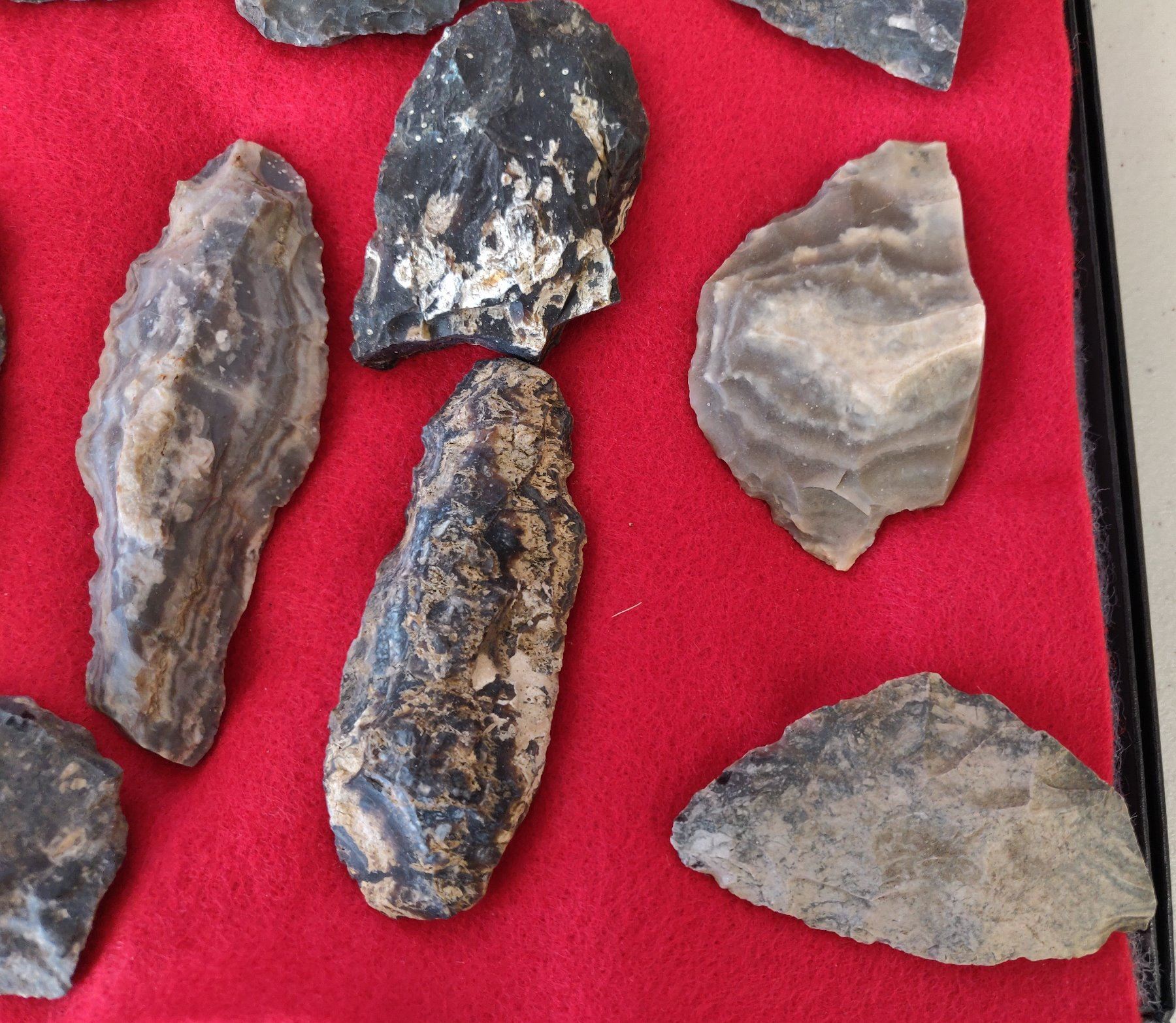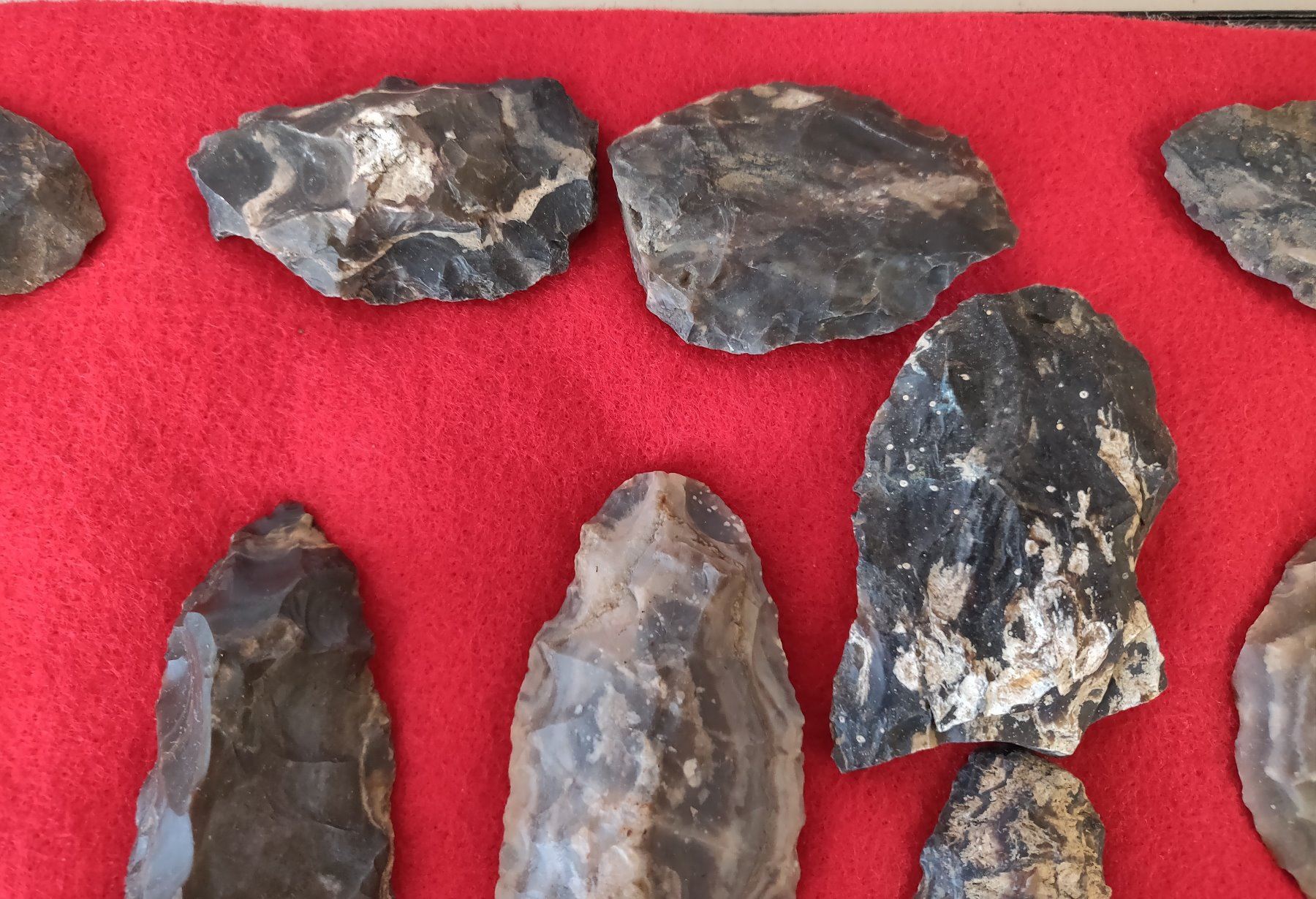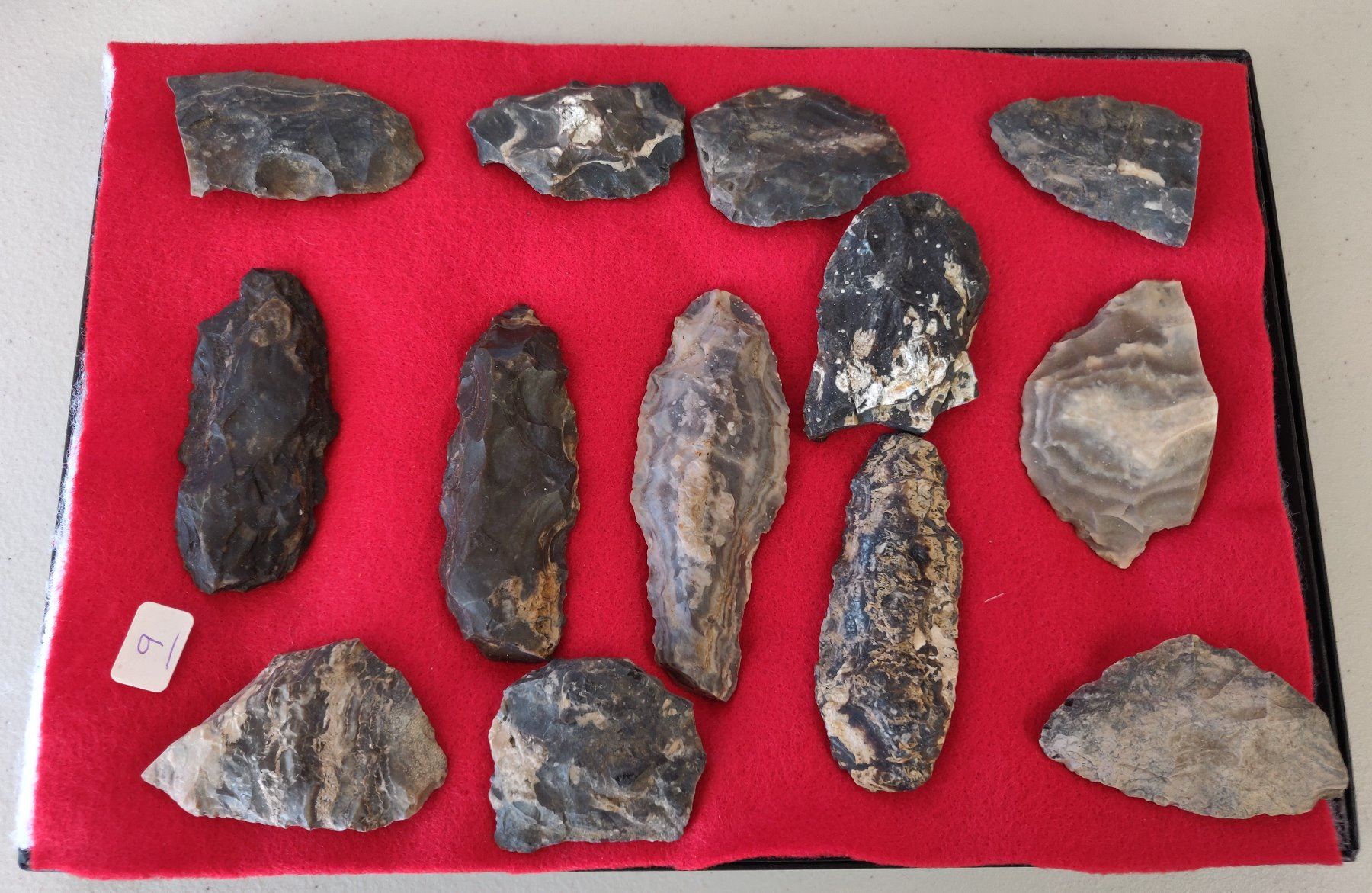 Authentic Chumash Collection, pre-historic items. Made of chert, flint and obsidian, the longest item measures 4" long. Santa Barbara County, California. Good study pieces, frame not included. Condition: As found, see images. Shipping: $22.50 w/insurance and signature.