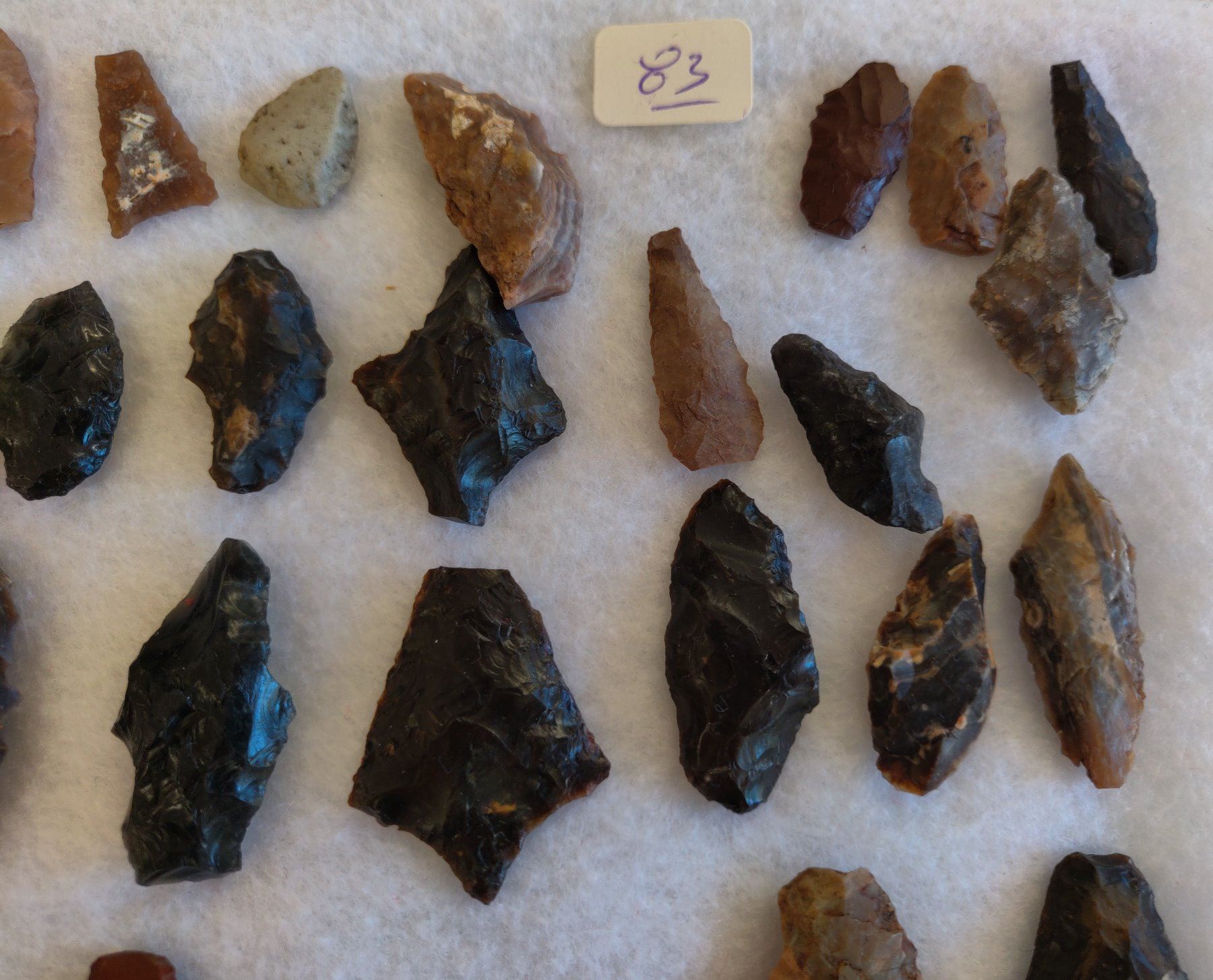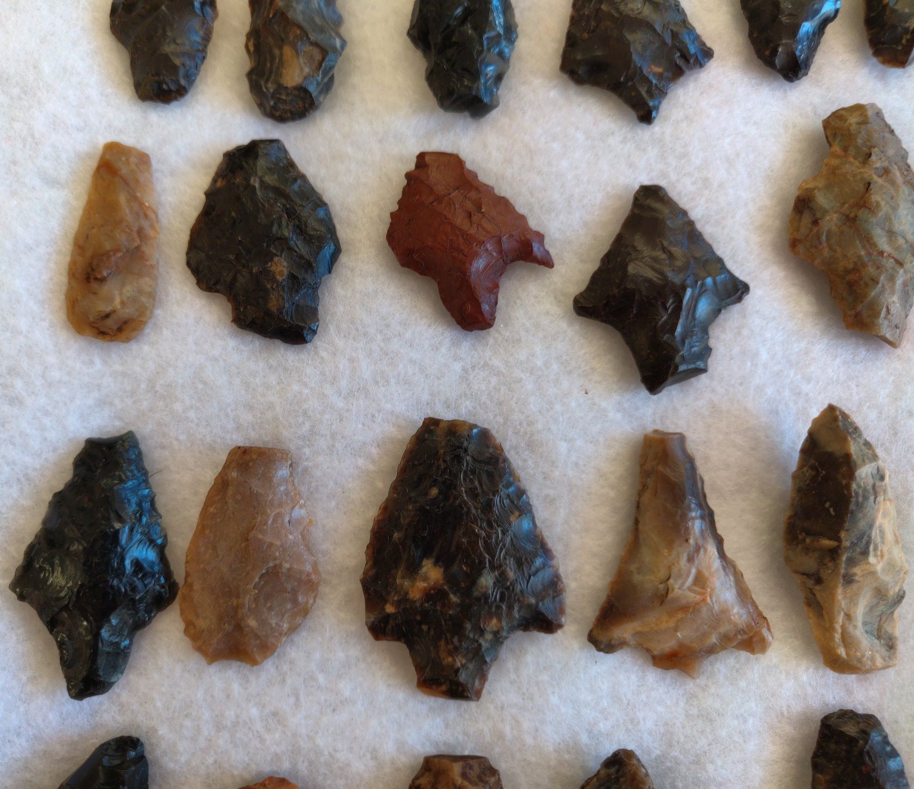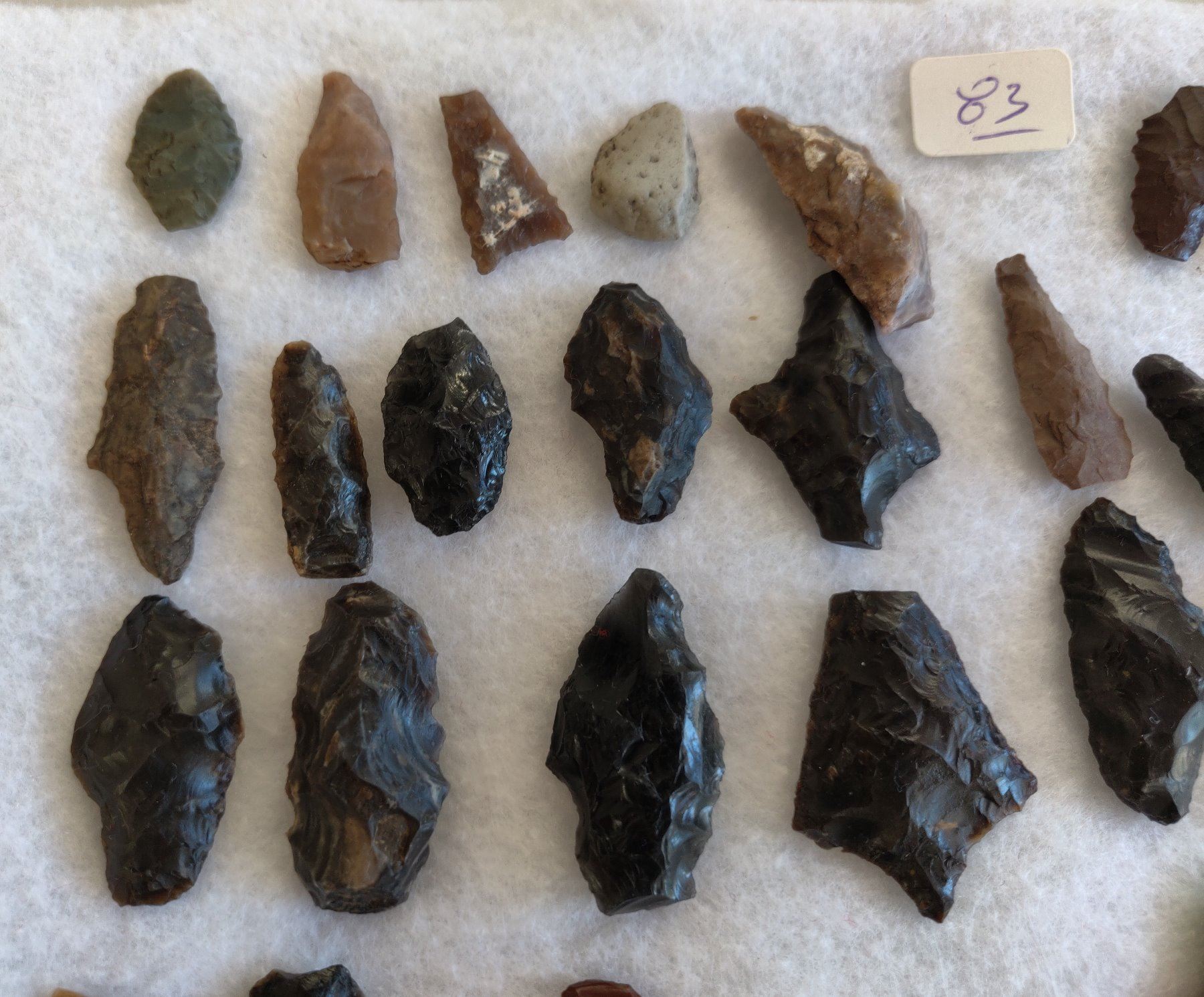 Authentic Chumash Collection, pre-historic items. Made of chert, flint and obsidian, the longest item measures 2 1/2" long. Santa Barbara County, California. Good study pieces, frame not included. Condition: As found, see images. Shipping: $26.50 w/insurance and signature.