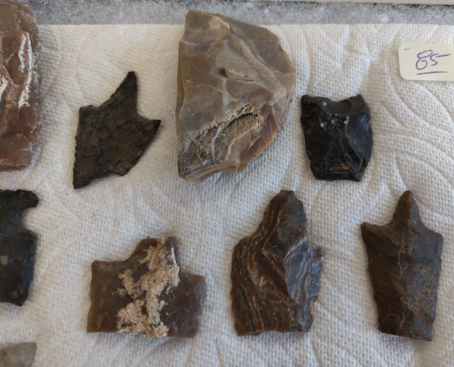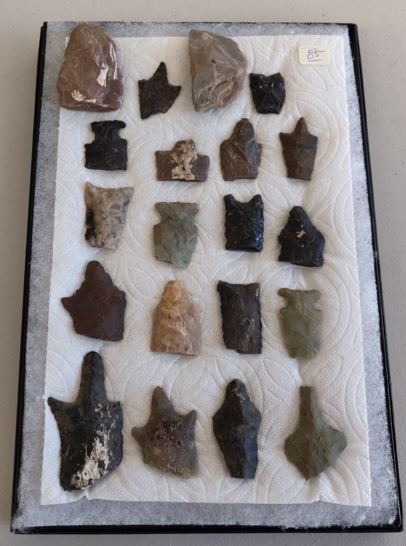 Authentic Chumash Collection, pre-historic items. Made of chert, flint and obsidian, the longest item measures 3 1/2" long. Santa Barbara County, California. Good study pieces, frame not included. Condition: As found, see images. Shipping: $22.50 w/insurance and signature.