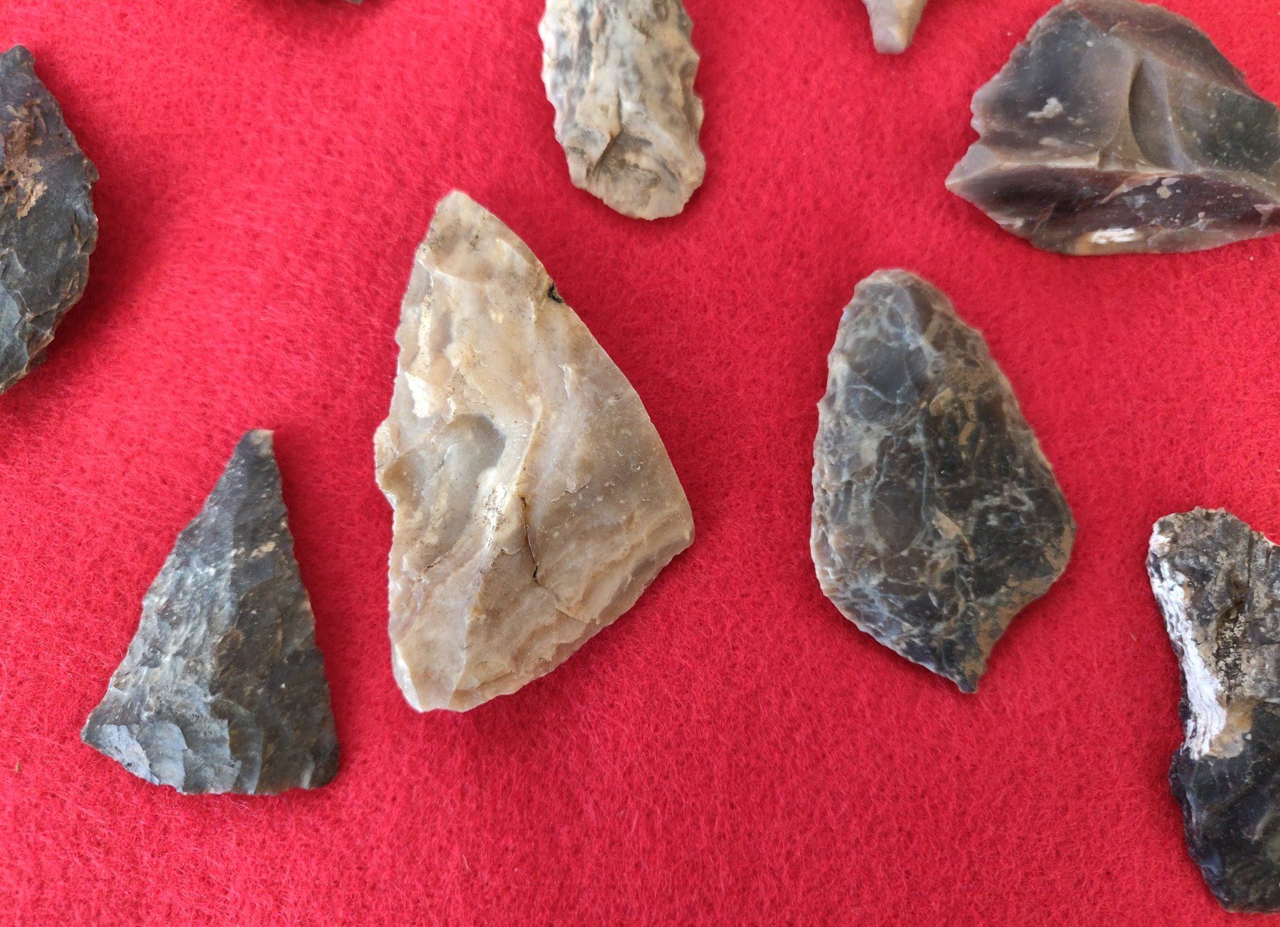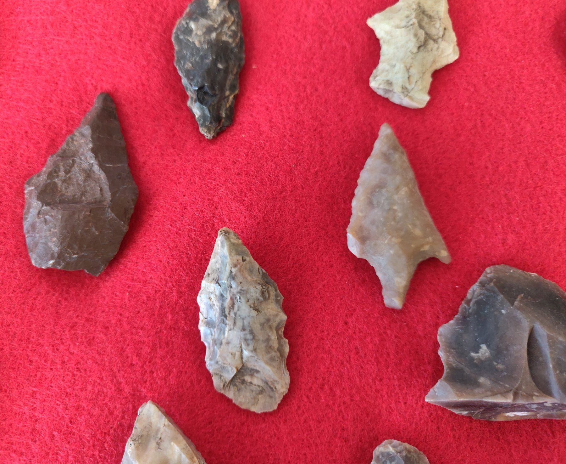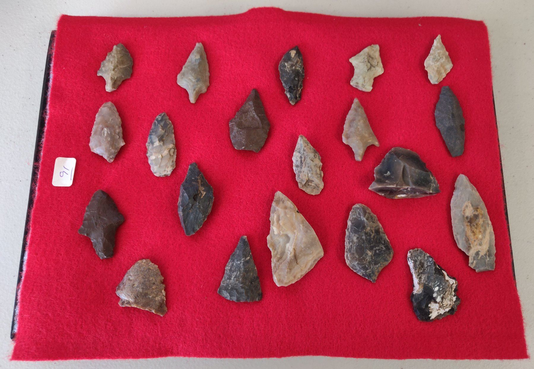 Authentic Chumash Collection, pre-historic items. Made of chert, flint and obsidian, the longest item measures 2 1/2" long. Santa Barbara County, California. Good study pieces, frame not included. Condition: As found, see images. Shipping: $20.00 w/insurance and signature.