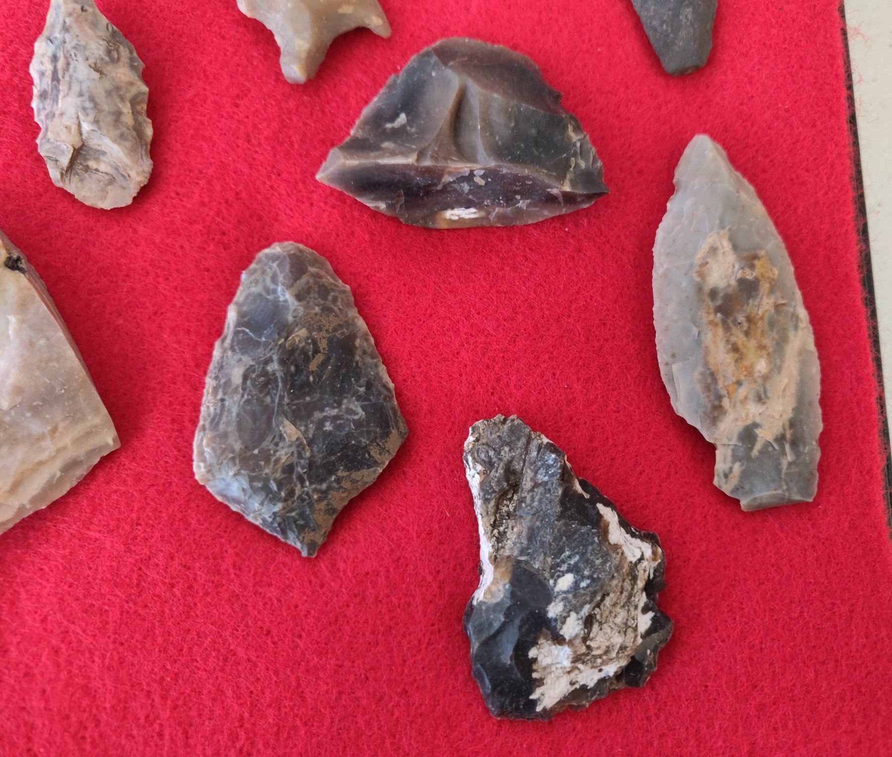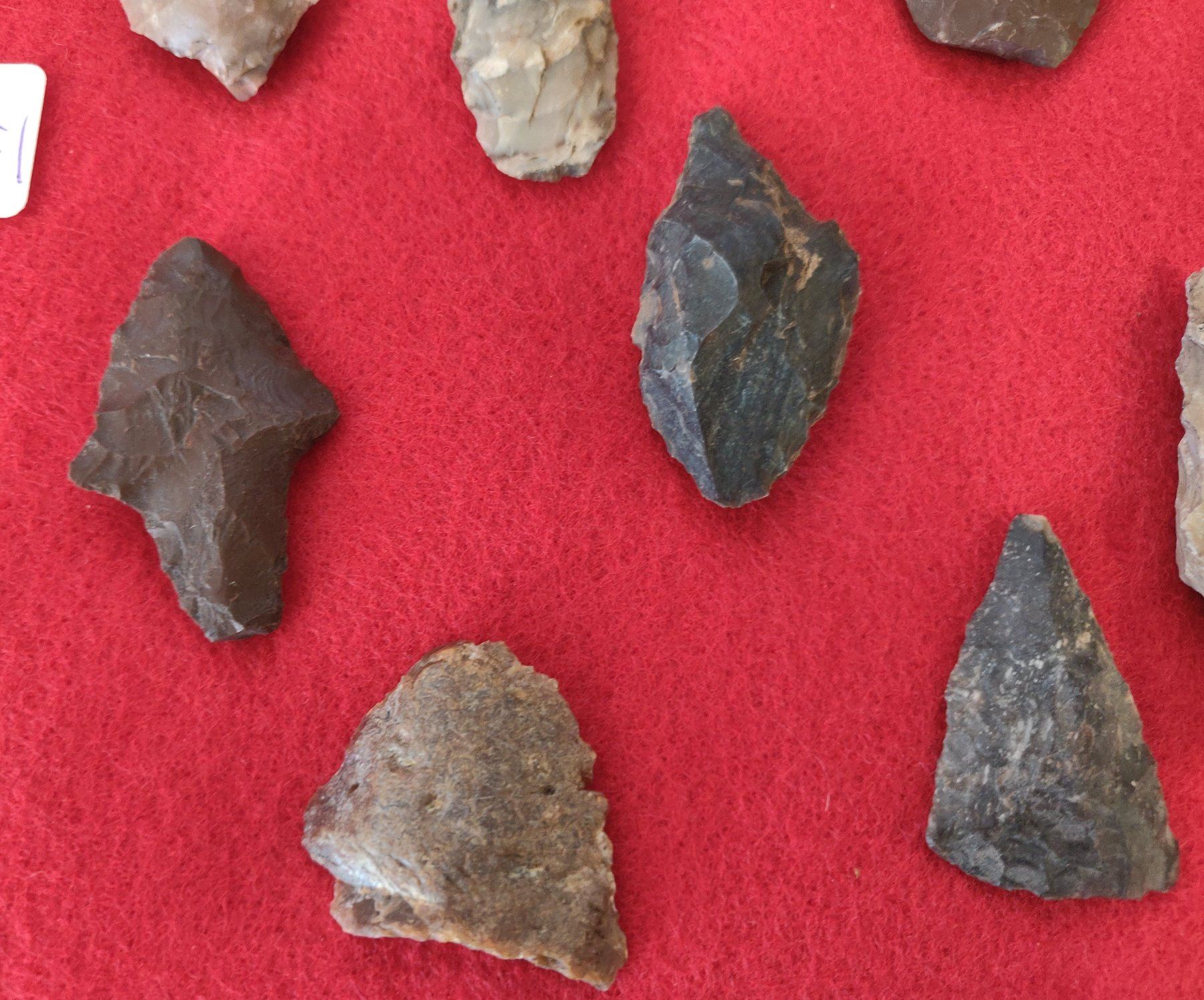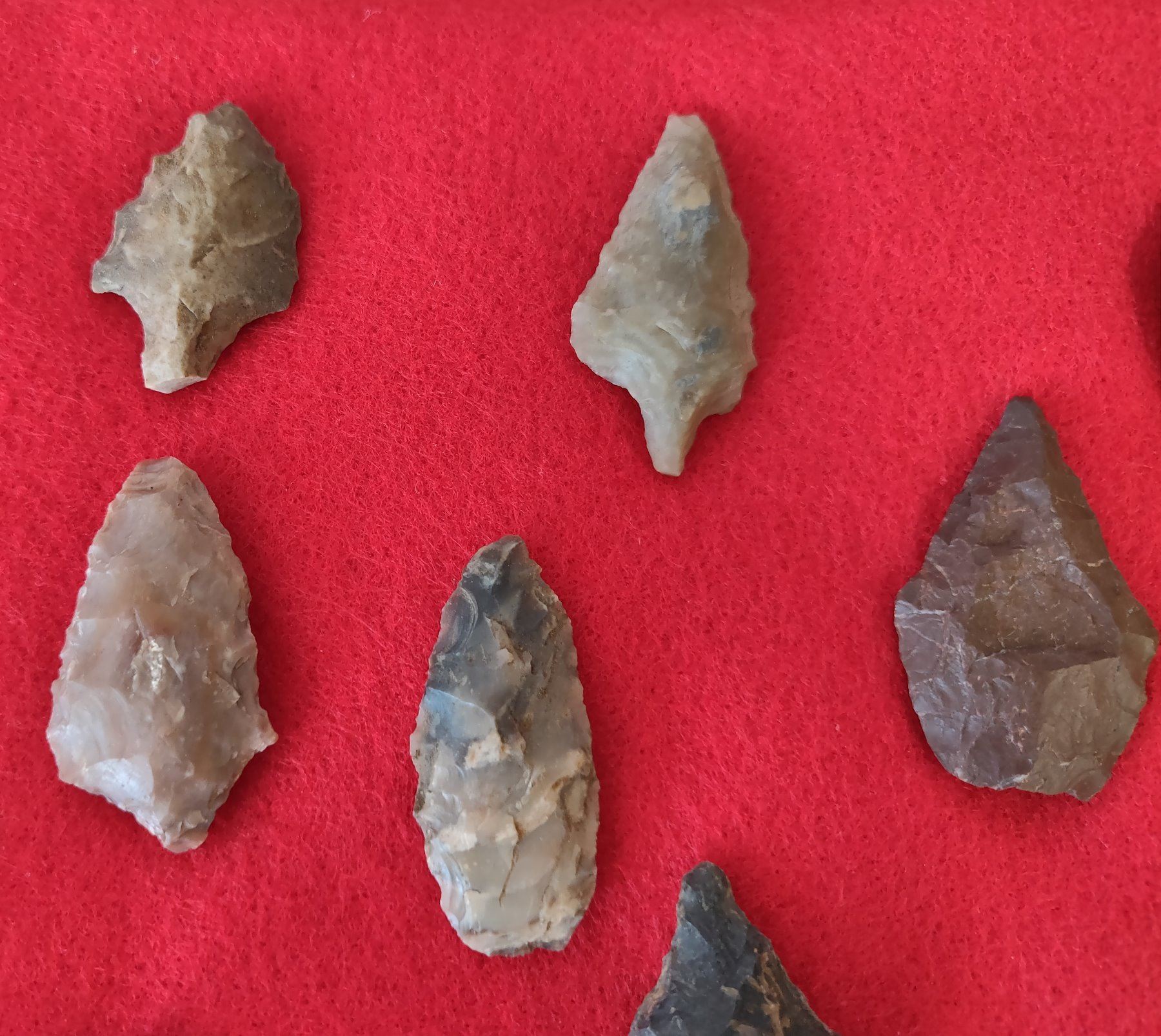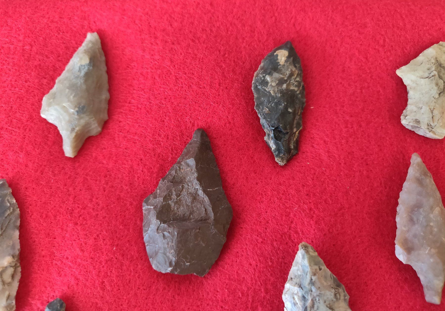 Authentic Chumash Collection, pre-historic items. Made of chert, flint and obsidian, the longest item measures 2 1/2" long. Santa Barbara County, California. Good study pieces, frame not included. Condition: As found, see images. Shipping: $20.00 w/insurance and signature.