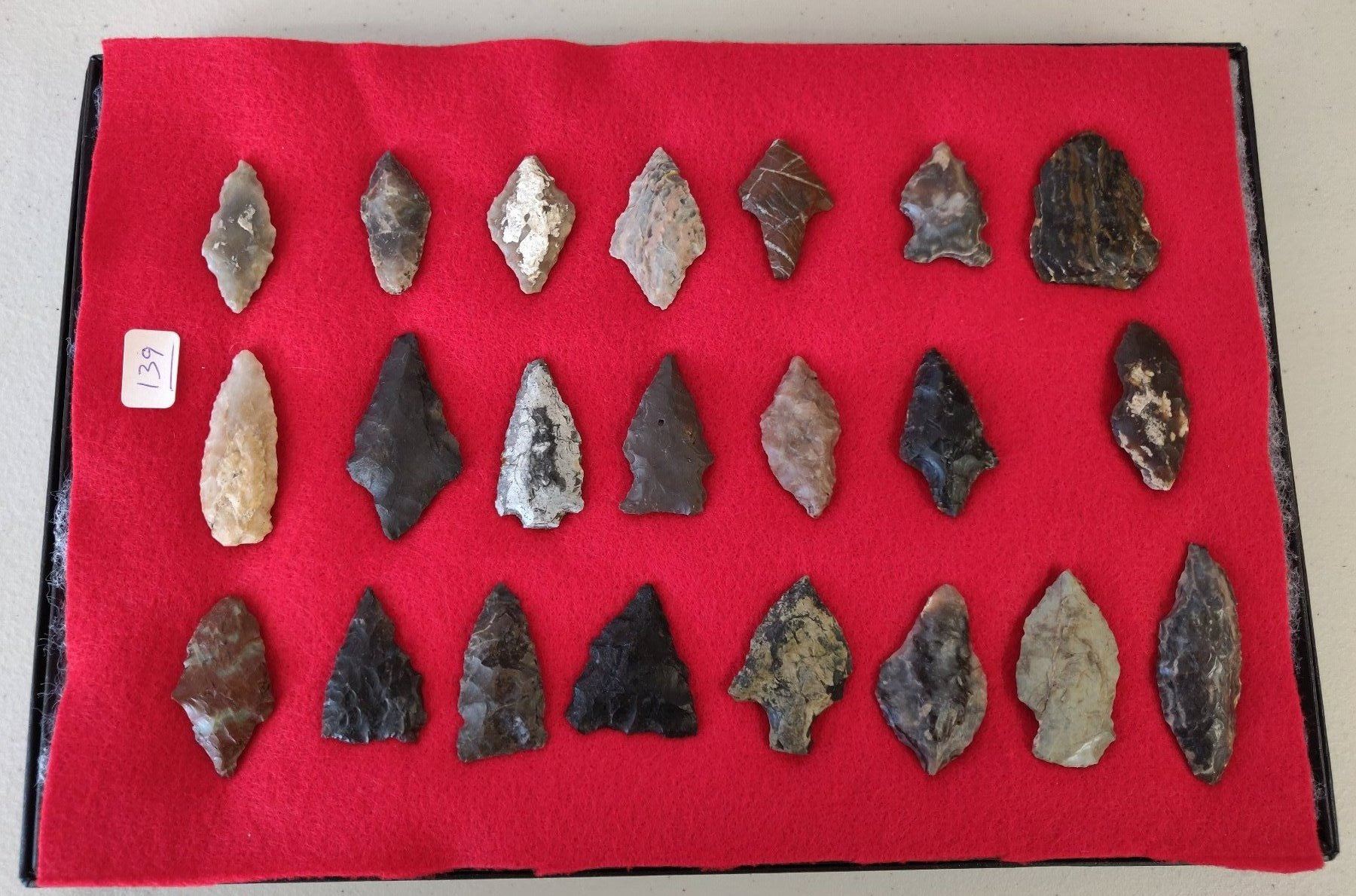 Authentic Chumash Collection, pre-historic items. Made of chert, flint and obsidian, the longest item measures 2 1/2" long. Santa Barbara County, California. Good study pieces, frame not included. Condition: As found, see images. Shipping: $24.50 w/insurance and signature.