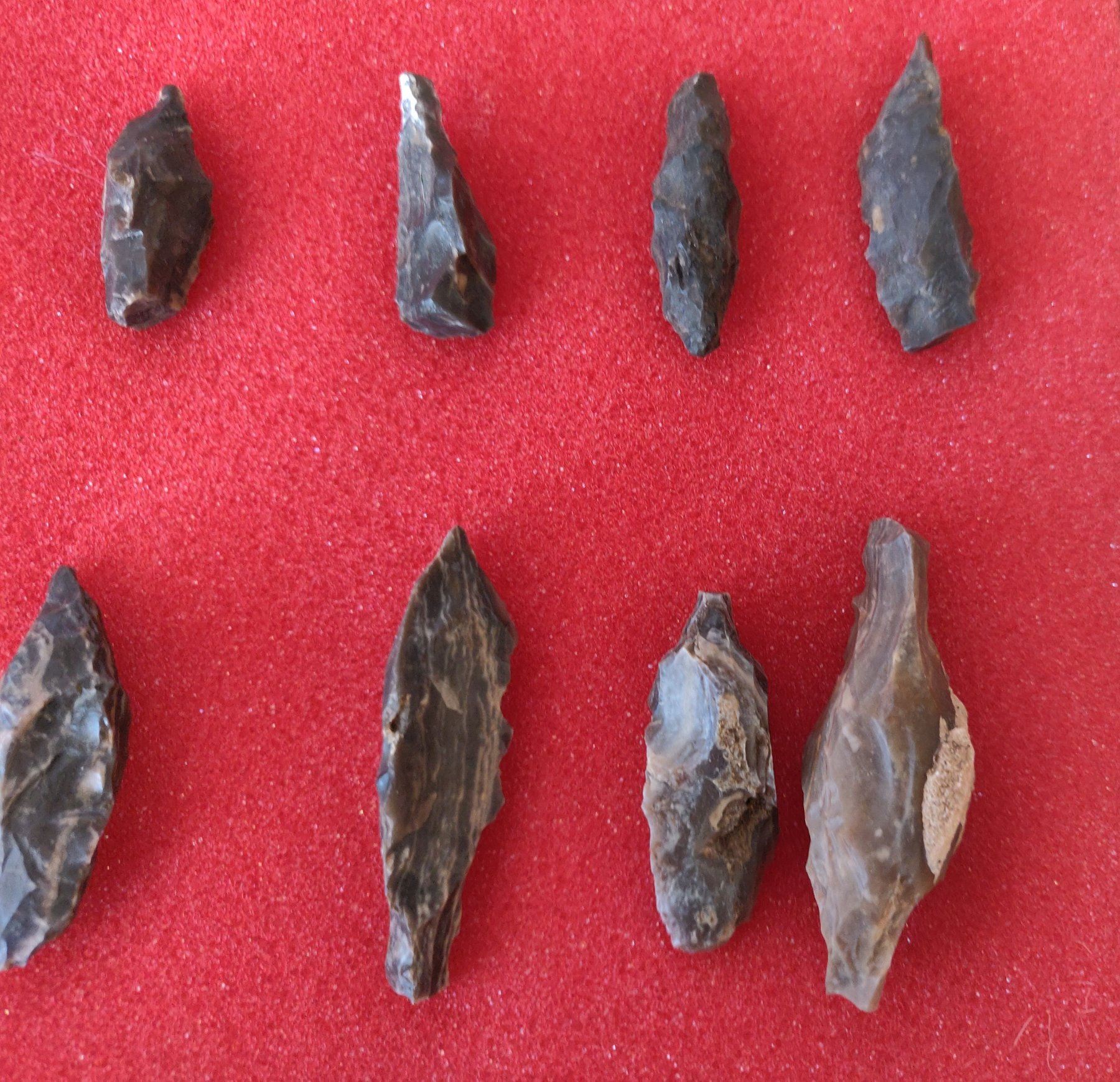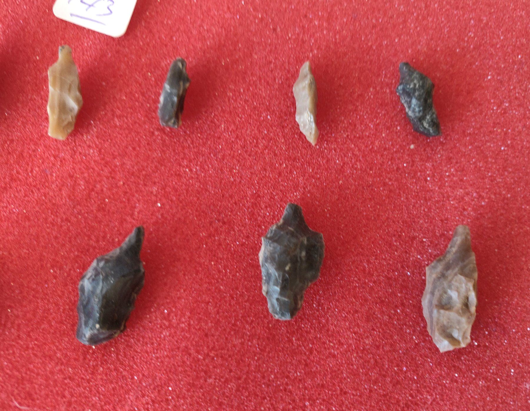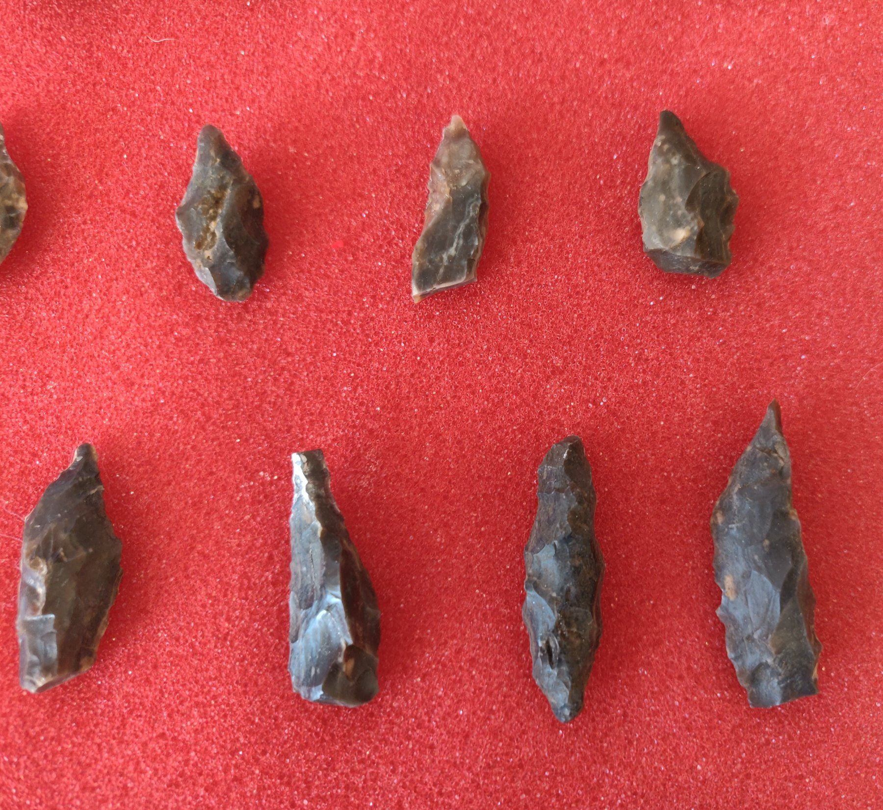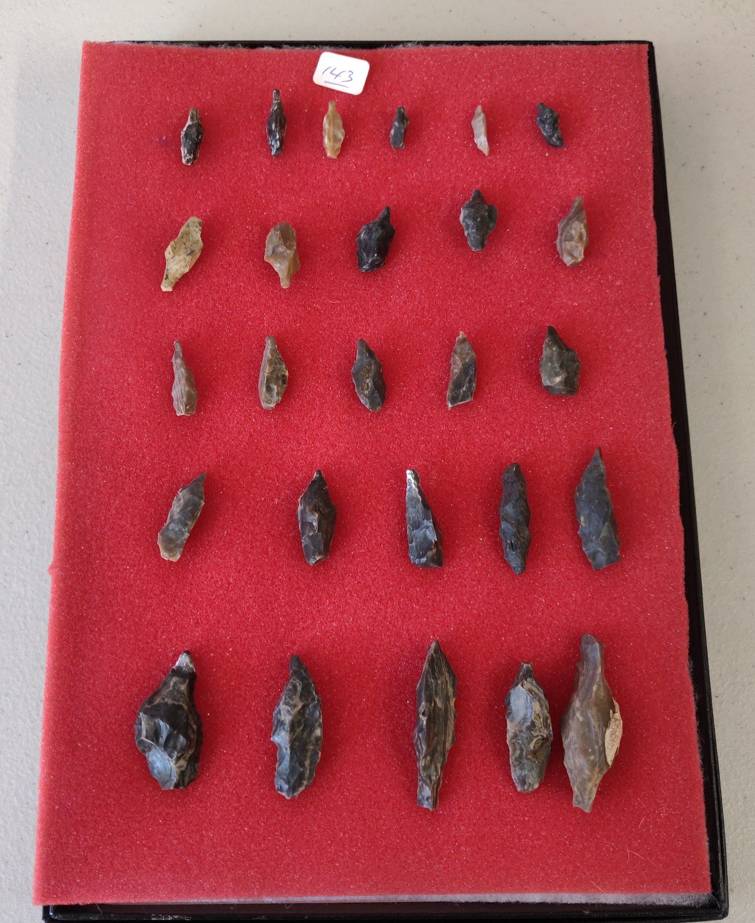 Authentic Chumash Collection, pre-historic items. Made of chert, flint and obsidian, the longest item measures 2 1/2" long. Santa Barbara County, California. Good study pieces, frame not included. Condition: As found, see images. Shipping: $18.50 w/insurance and signature.