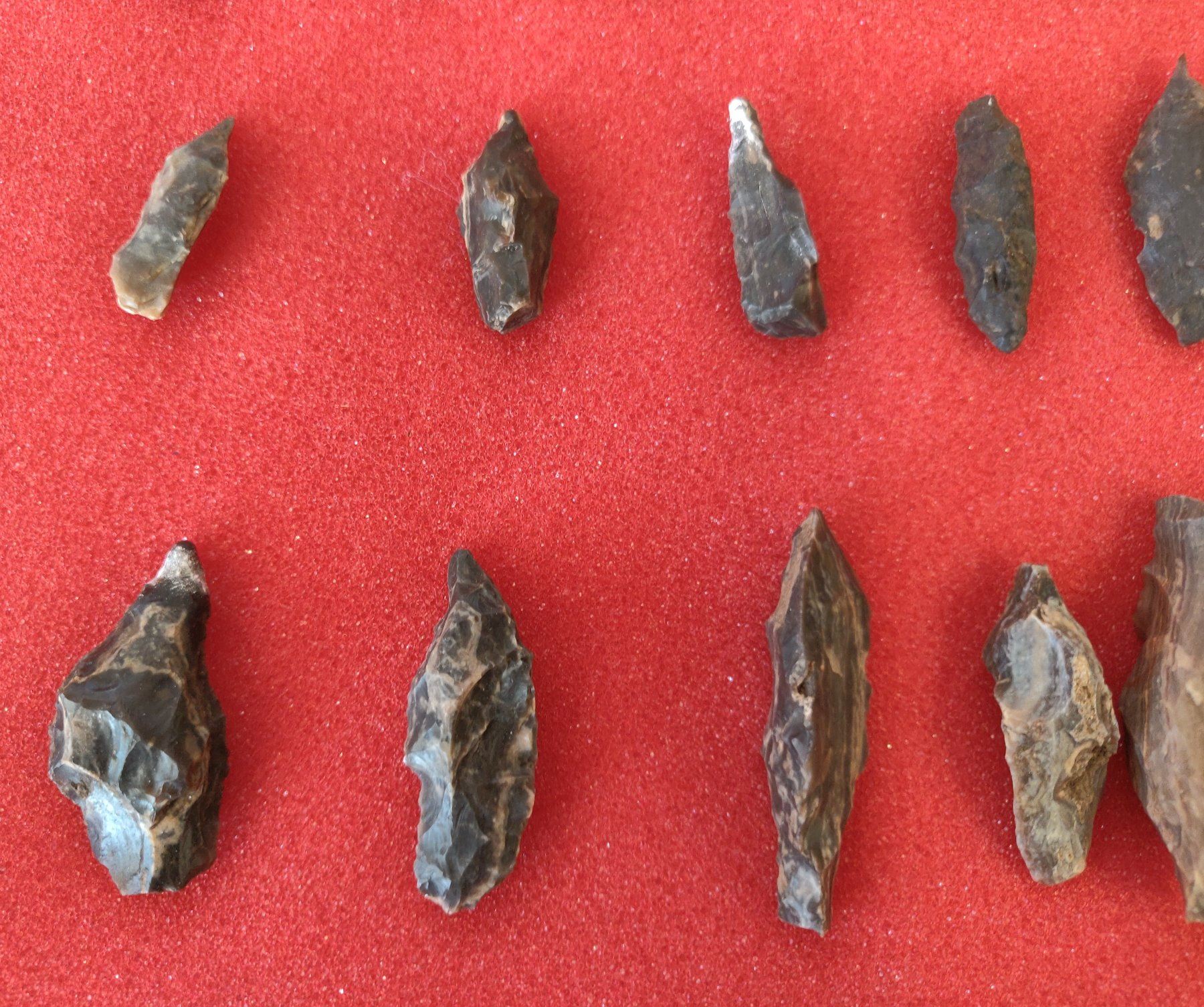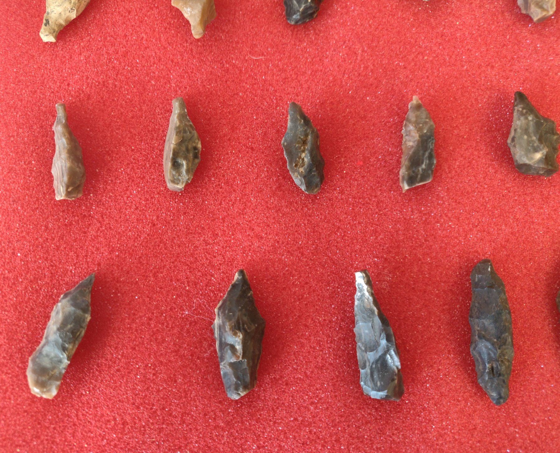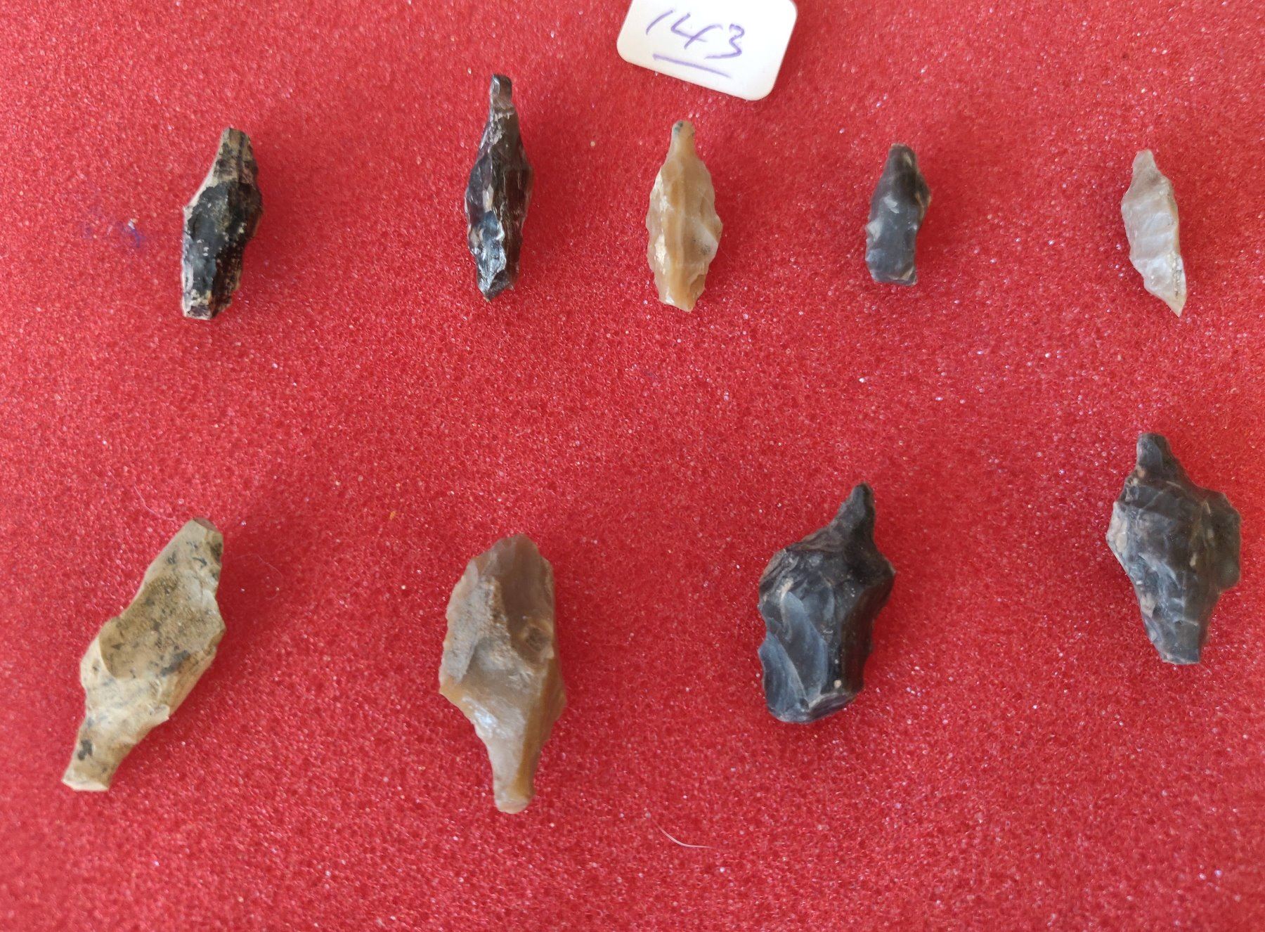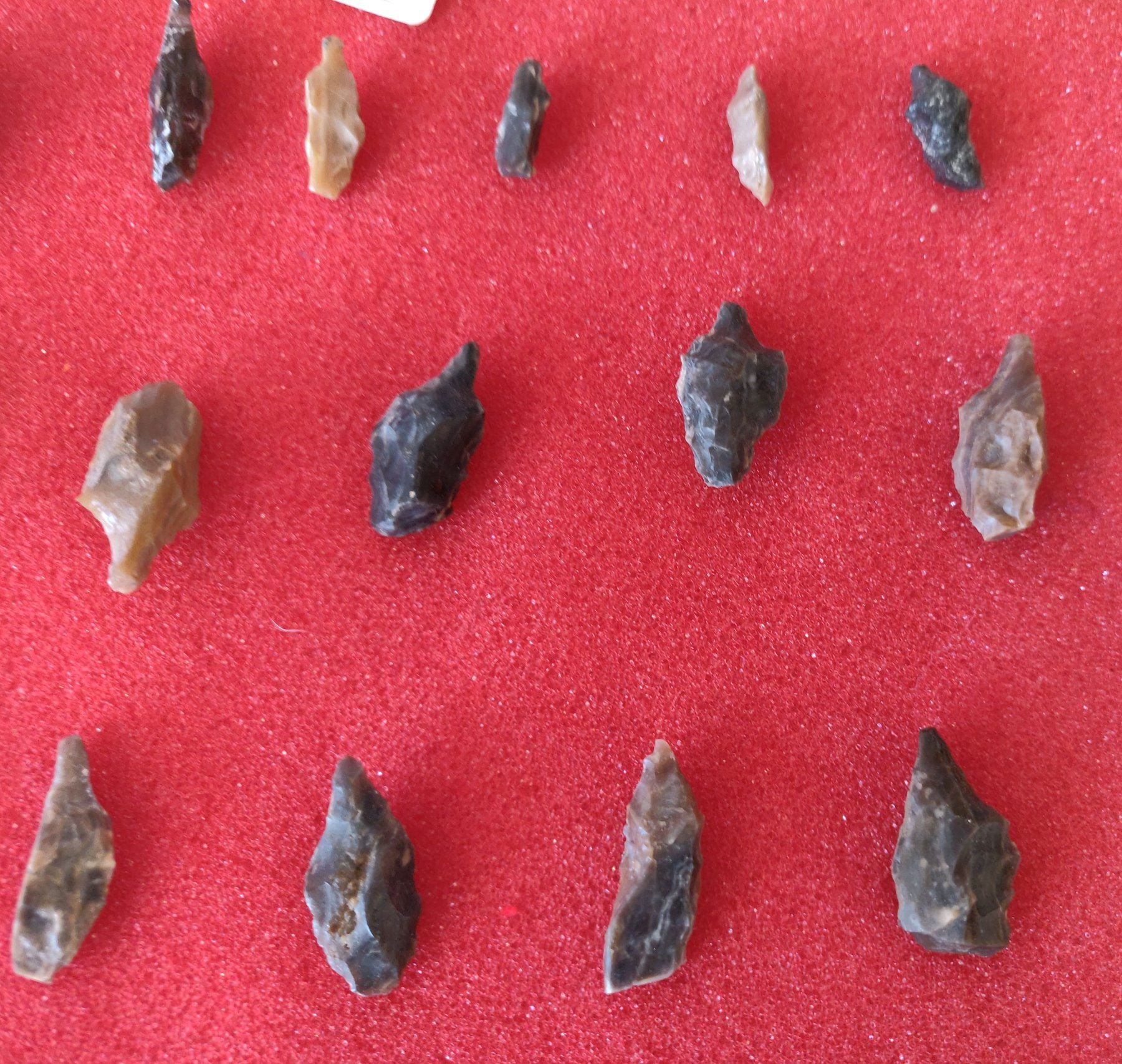 Authentic Chumash Collection, pre-historic items. Made of chert, flint and obsidian, the longest item measures 2 1/2" long. Santa Barbara County, California. Good study pieces, frame not included. Condition: As found, see images. Shipping: $18.50 w/insurance and signature.