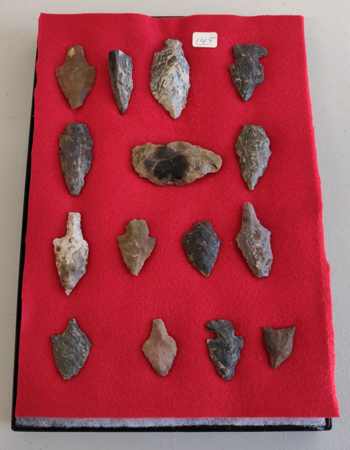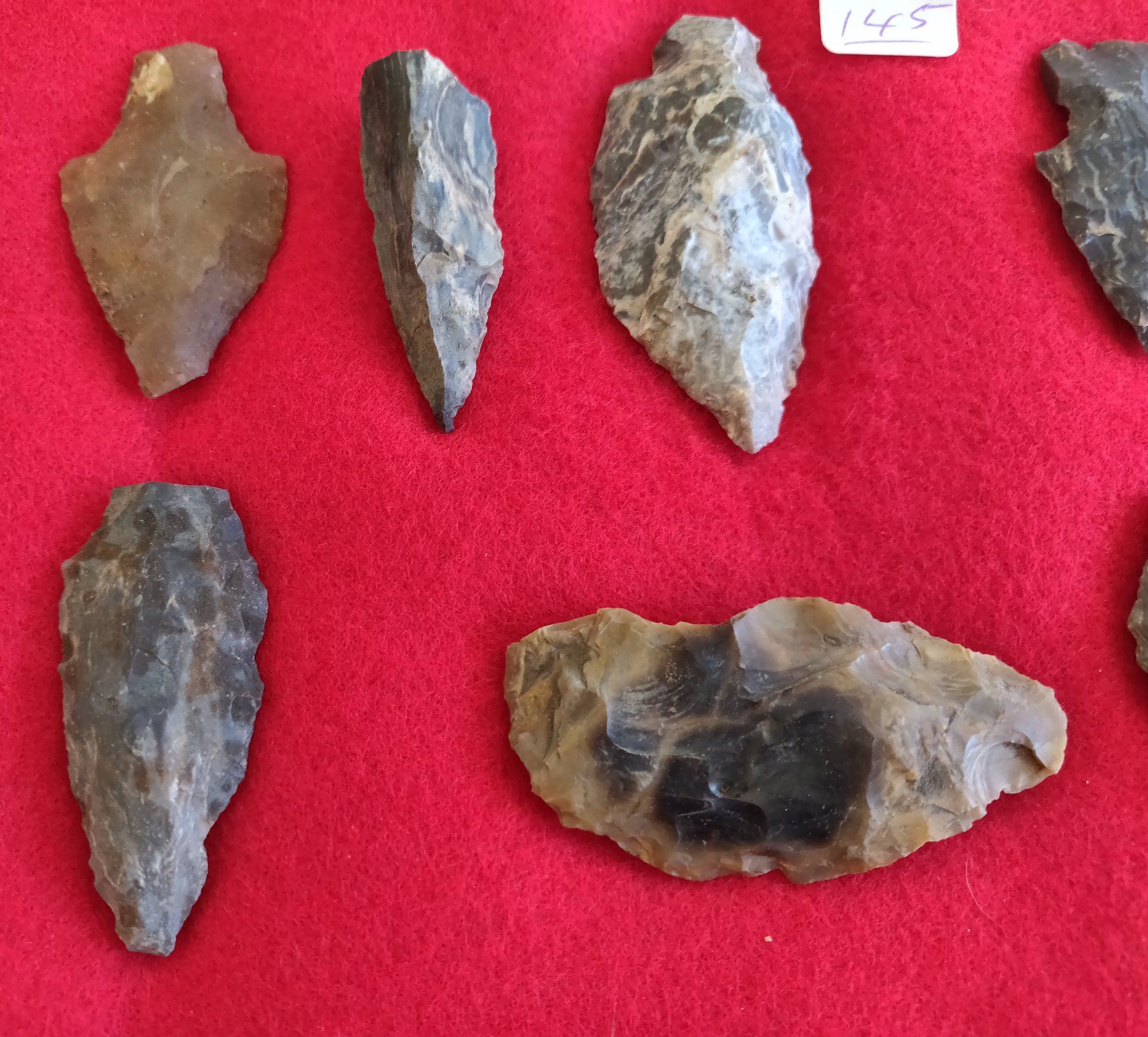 Authentic Chumash Collection, pre-historic items. Made of chert, flint and obsidian, the longest item measures 3" long. Santa Barbara County, California. Good study pieces, frame not included. Condition: As found, see images. Shipping: $22.50 w/insurance and signature.