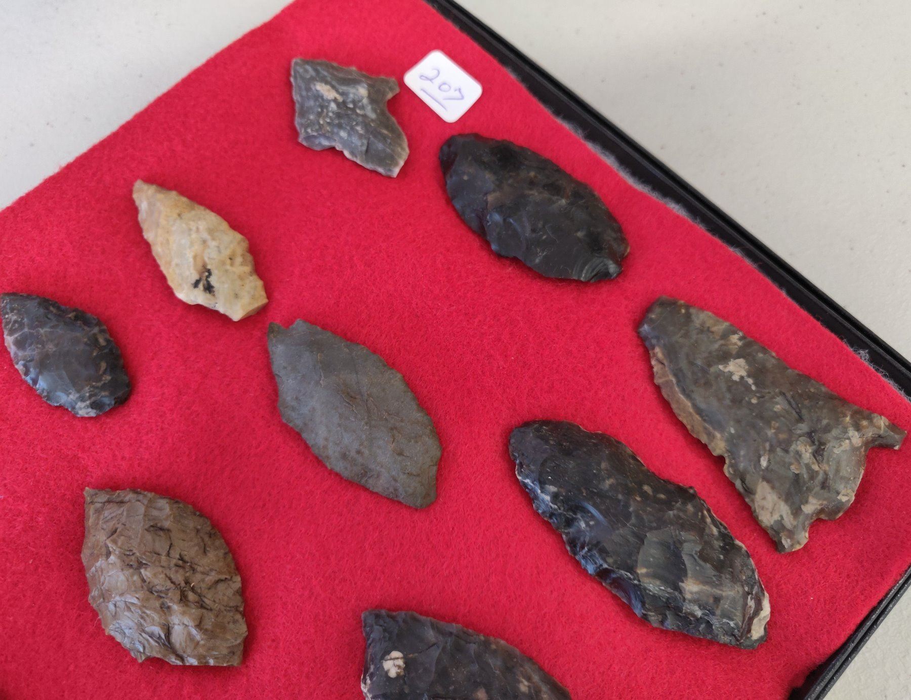Authentic Chumash Collection, pre-historic items. Made of chert, flint and obsidian, the longest item measures 2 3/4" long. Santa Barbara County, California. Good study pieces, frame not included. Condition: As found, see images. Shipping: $24.50 w/insurance and signature.