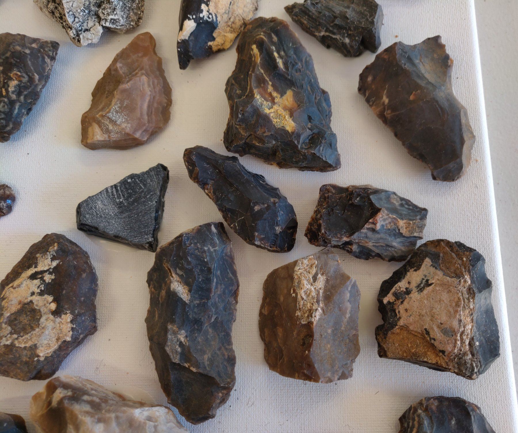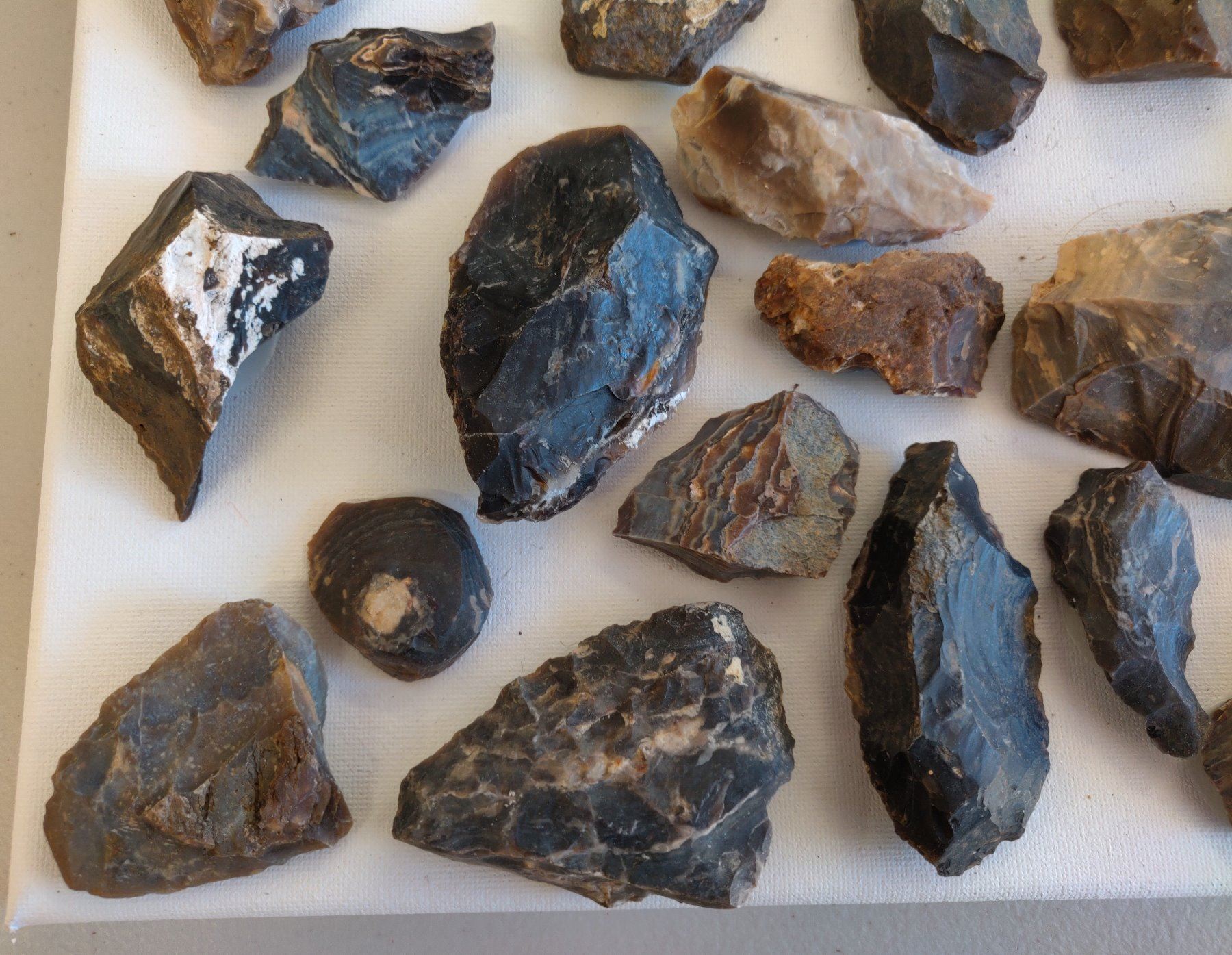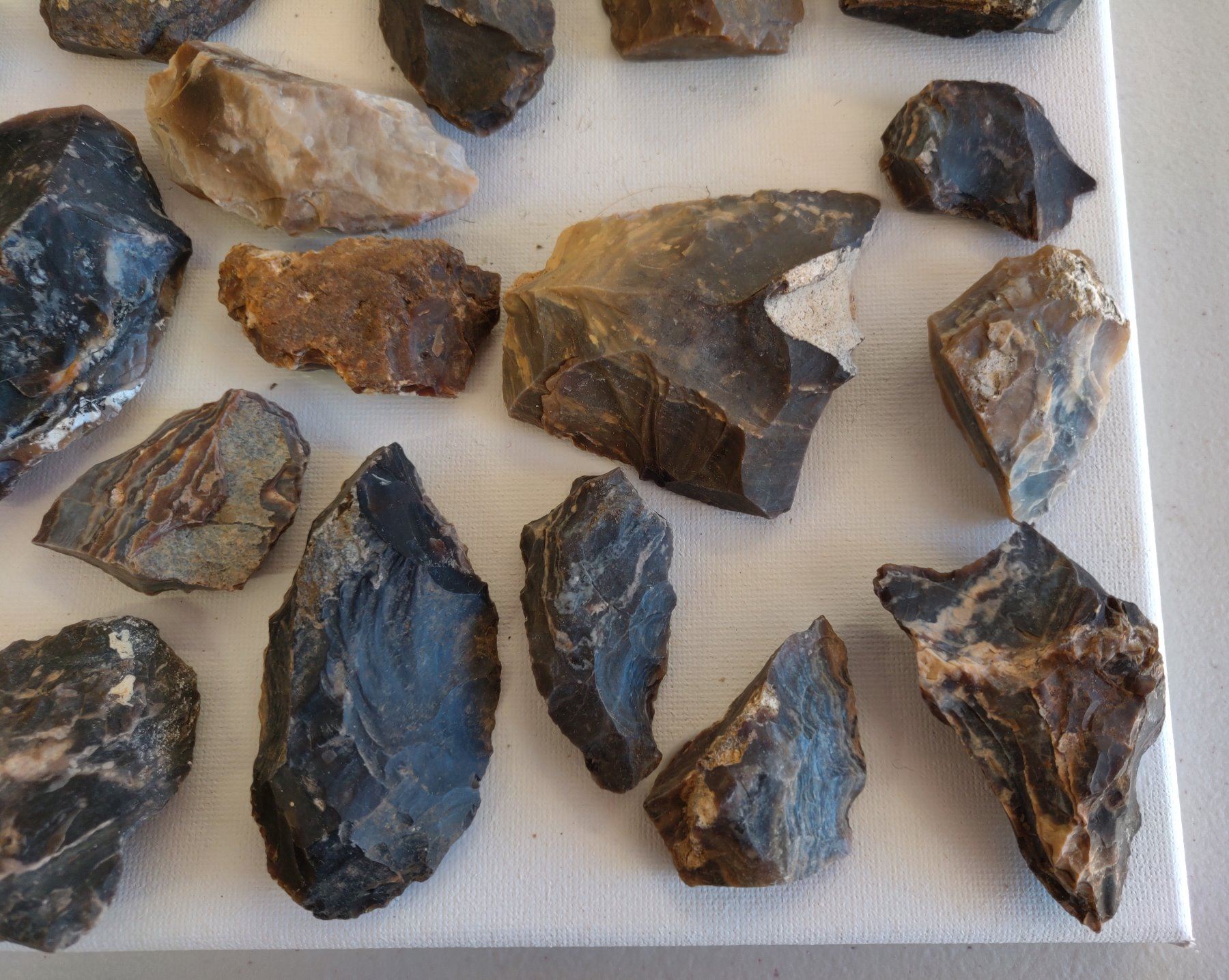 Authentic Chumash Collection, pre-historic items. Made of chert, flint and obsidian, the longest item measures 3" long. Santa Barbara County, California. Good study pieces, frame not included. Condition: As found, see images. Shipping: $20.00 w/insurance and signature.