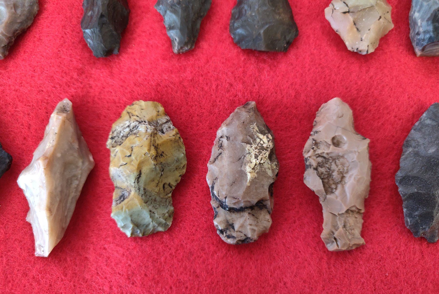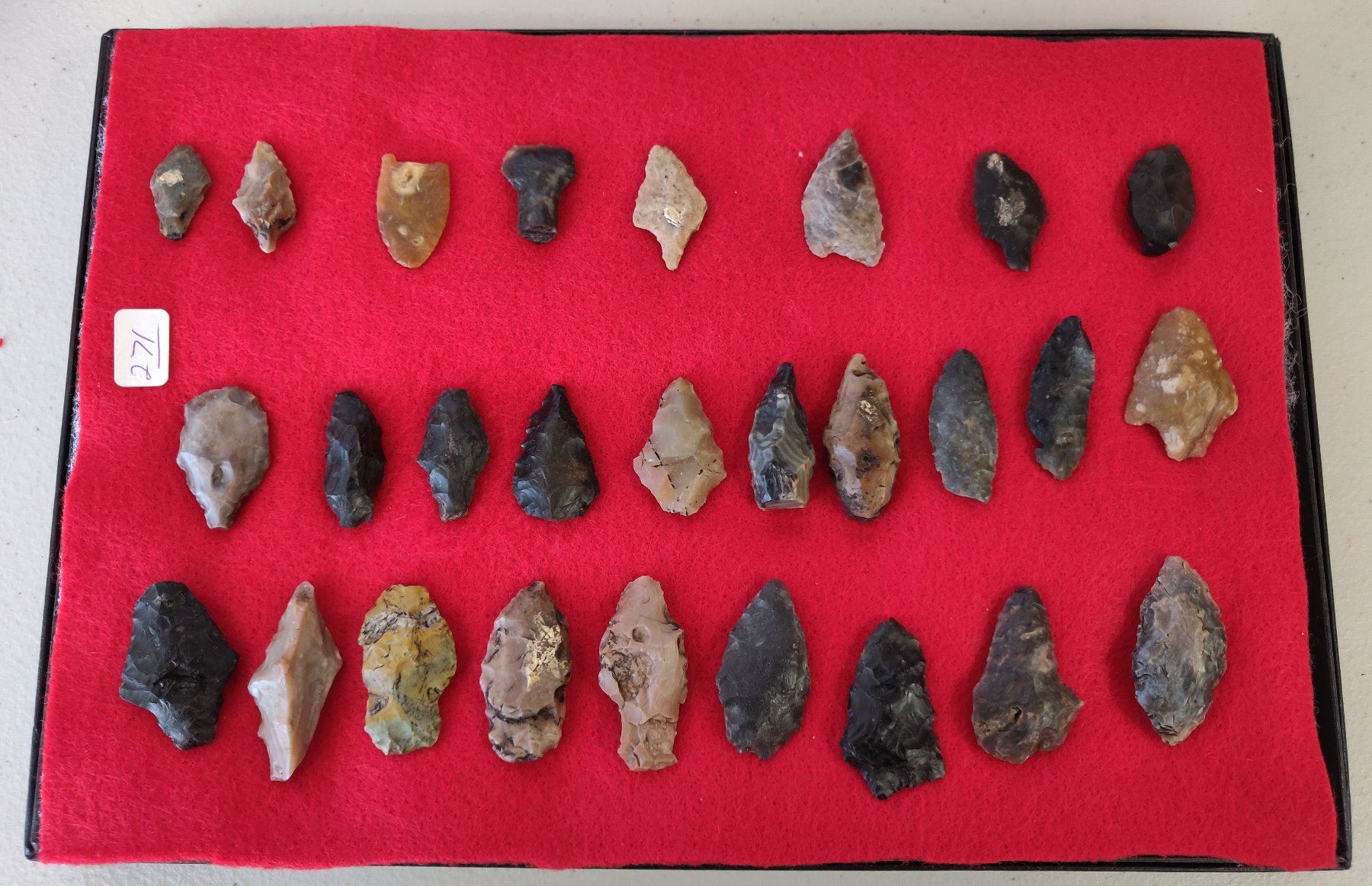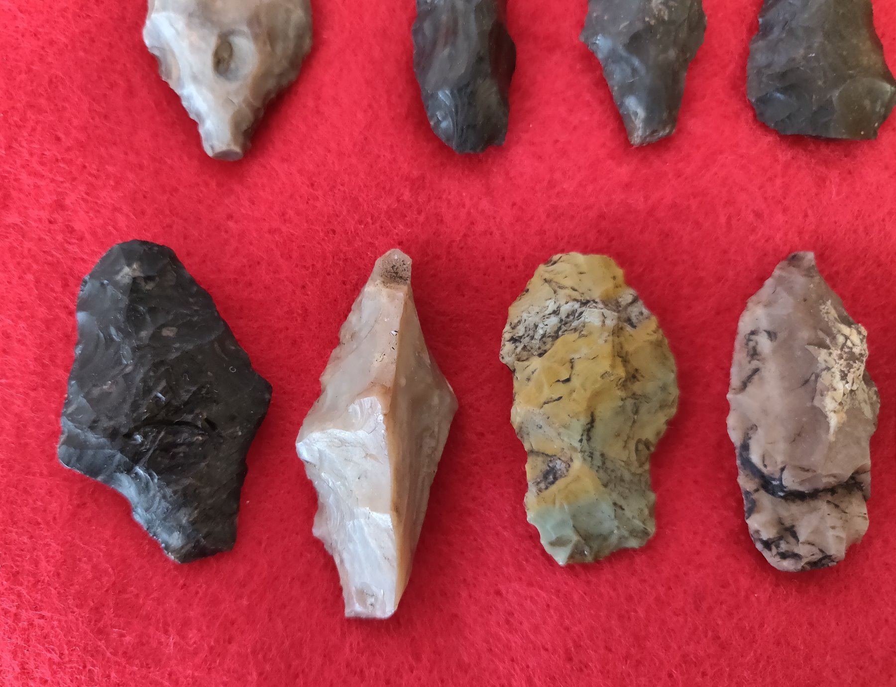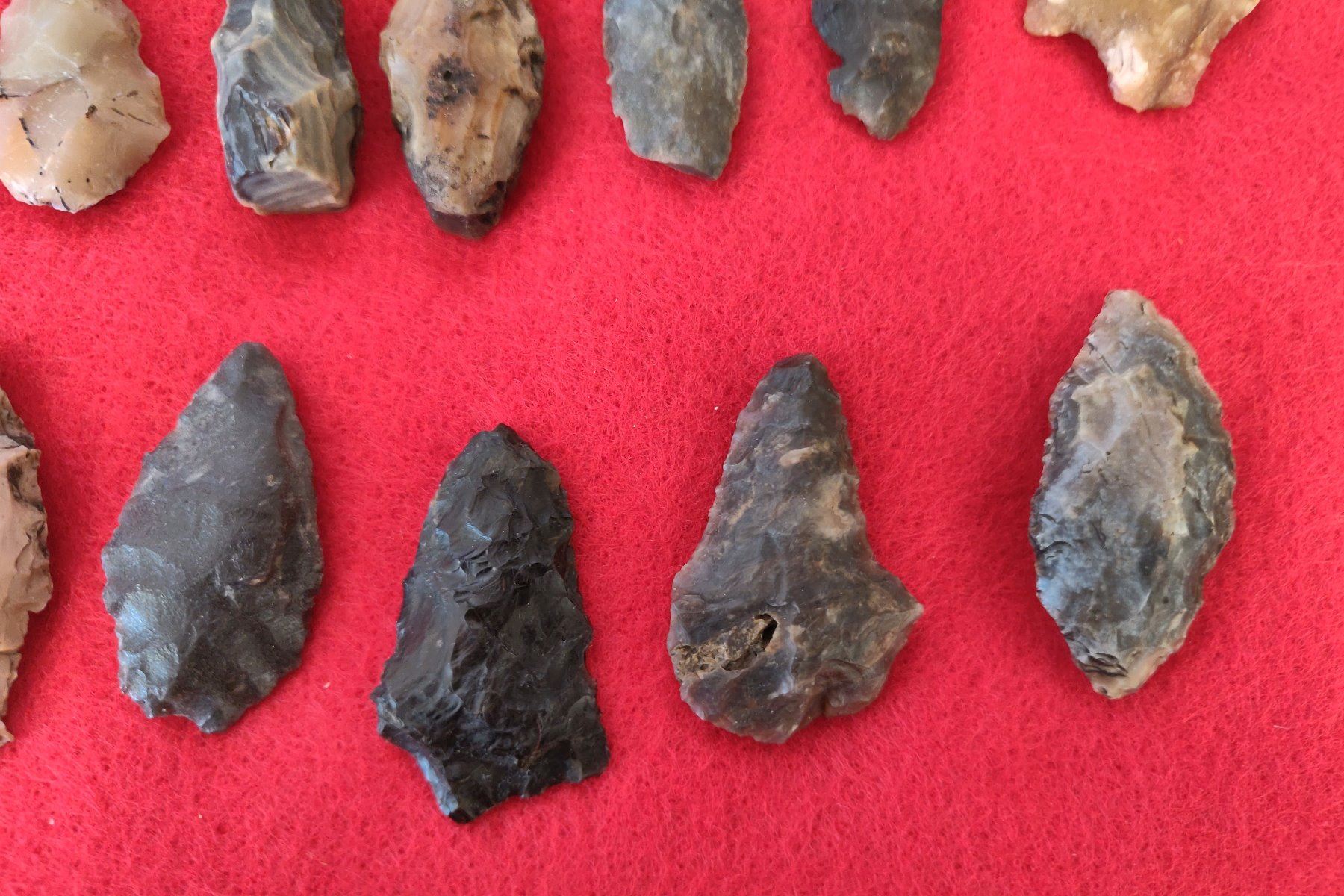 Authentic Chumash Collection, pre-historic items. Made of chert, flint and obsidian, the longest item measures 2" long. Santa Barbara County, California. Good study pieces, frame not included. Condition: As found, see images. Shipping: $22.50 w/insurance and signature.