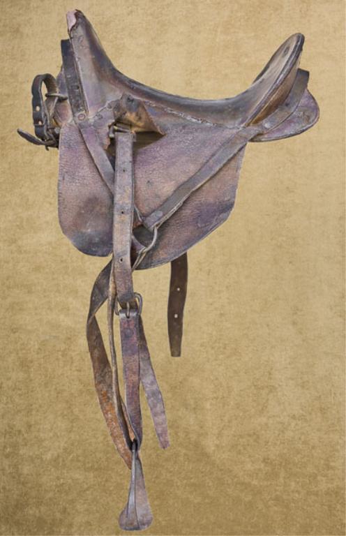 Authentic Confederate Officer’s style leather saddle in overall fair condition showing considerable use and wear, majority of leather cover on the seat remaining, left side leather stirrup and strap attached with right side stirrup needing re-attachment; saddle skirts are present but show drying, crazing of surface leather and some losses and tears. In overall untouched condition. Est.: $2,000-$4,000.