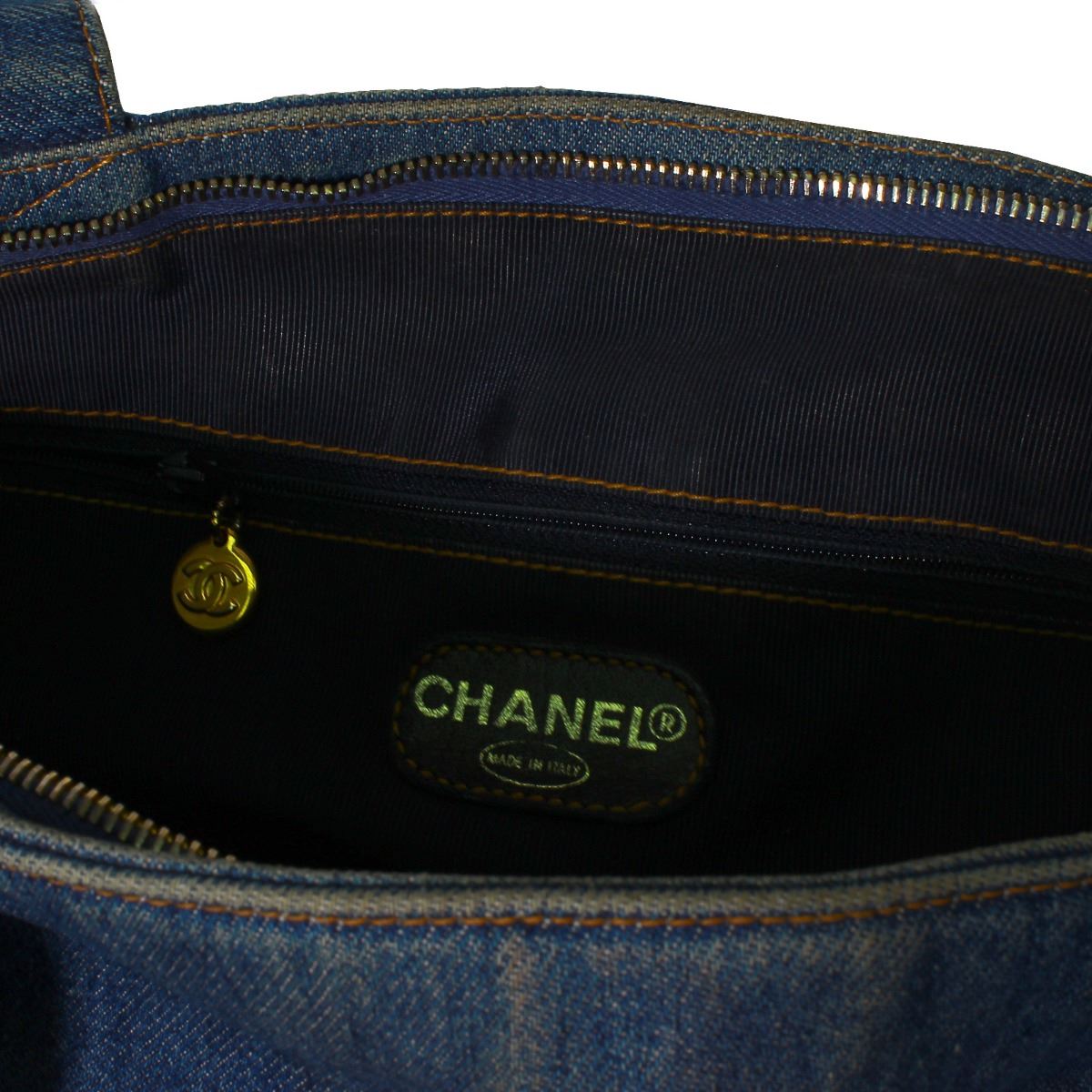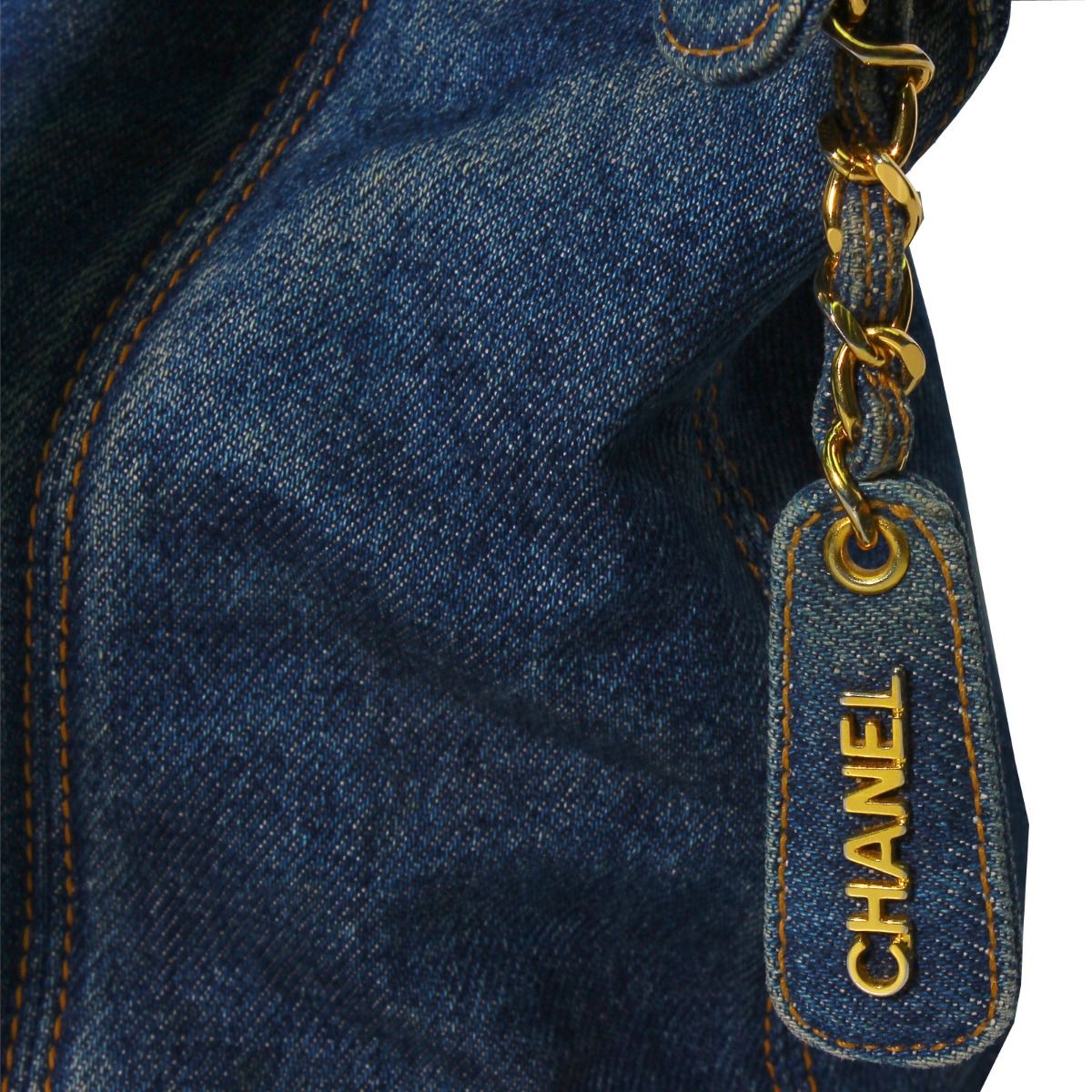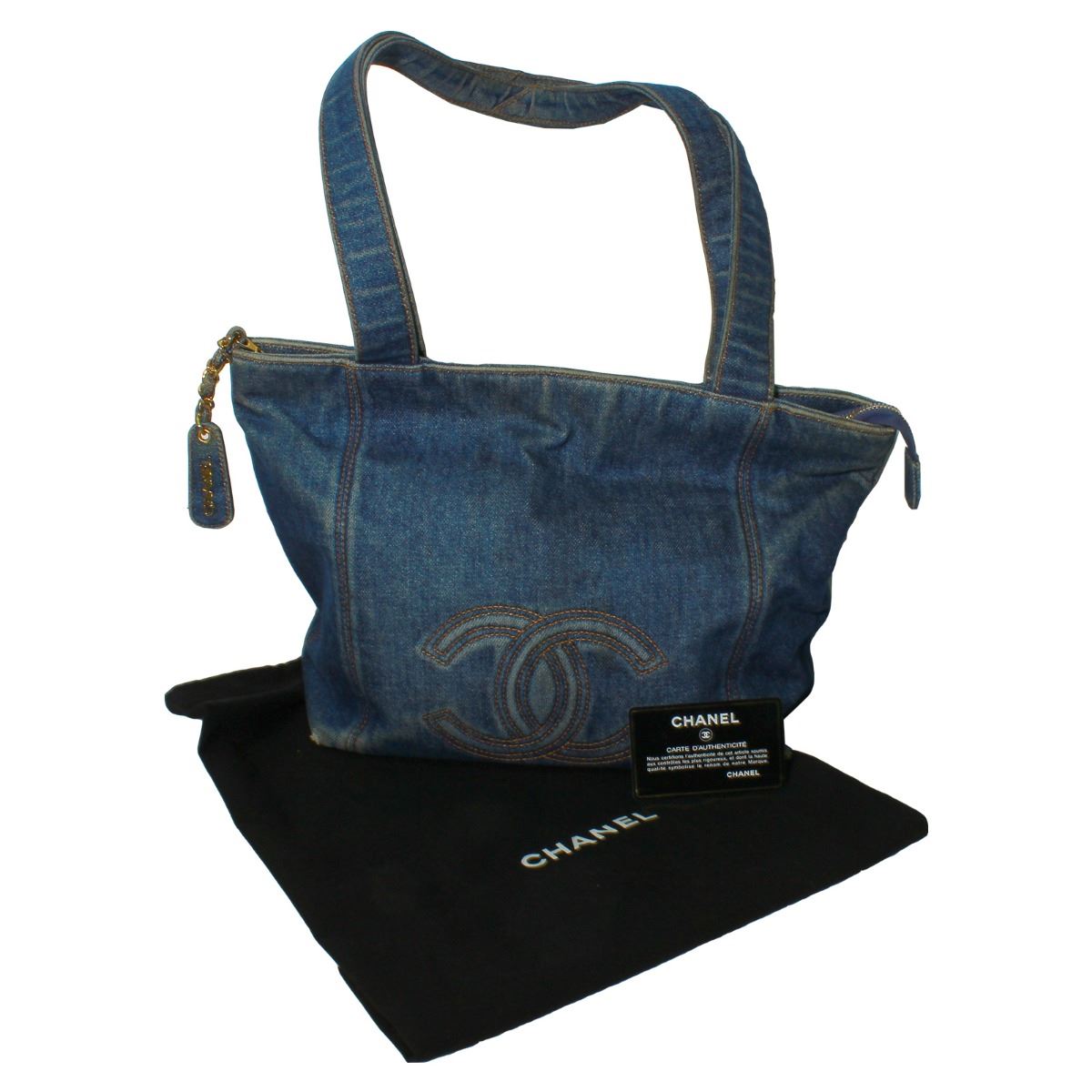 Chanel tote has measurements as follows: Top Width 14 inches, High 11 inches, Depth 5 inches. This authentic Chanel tote shows noticeable wear and tear in various areas (pictured) but this doesn't detract from it's prestige as a Chanel designer bag. Two shoulder straps for your hand or your shoulder is all you need. Closes with a zipper tag that has the trademark braided metal design, finished with a hanging gold-toned denim Chanel charm, which lays beautifully outside the zipper line. Embroidered in the front with the world famous interlocking double CC logo. Tote has a smaller zippered pocket inside with a hanging CC logo zipper tag. Darker shaded interior. Chanel is also on a tag stitched inside, showcasing this tote's authenticity. Serial # 1634046. Comes with a black dust bag with white lettering logo CHANEL, in addition to cards of authenticity. WE SHIP WORLDWIDE!