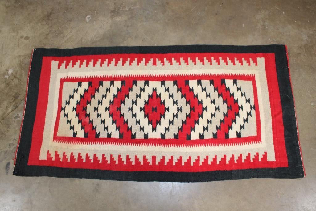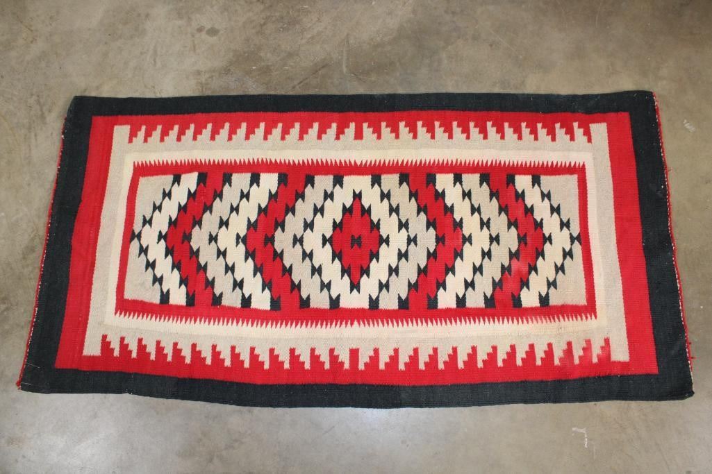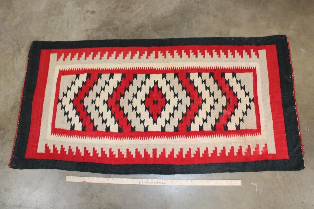 Authentic Early 1900's Hand Woven NAVAJO Rug, the Exact Age is Unknown. It measures 62" Long x 31" Wide. It is in Very Good Condition for its age. *We as the auction company are not going to get into a protracted discussion about age and authenticity. This collector has no paperwork or COA as to age or authenticity. We are wholly uncomfortable with an argument with qualified and unqualified, alleged authorities. All of that to say; we are not guaranteeing age or authenticity* NATIVE AMERICAN TEXTILES
