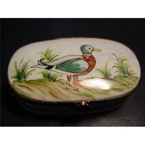 Here is a "Duck" hand-painted Porcelain box. Excellent condition, hinges and clasps work fine.