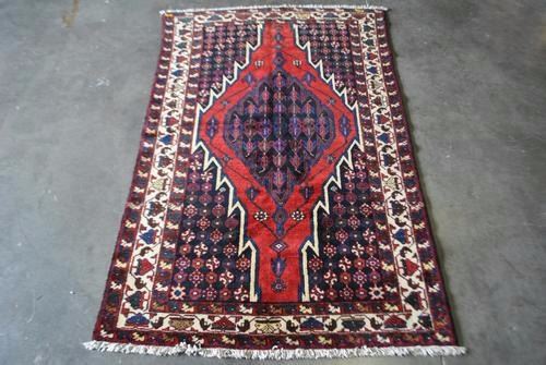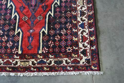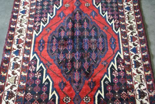 This semi-antique authentic Persian mazlaghan rug is hand knotted of 100% natural. Size 3.10 X 6.2 feet, colors found in this rug include: red, cream, navy blue, blue. The primary color is red. This rug is in very good condition, with minor blemishes (low pile spots). Further details can be seen in the pictures