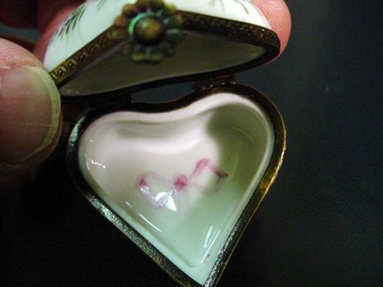 Authentic hand-painted Limoges box signed by artist from a famous studio! This box was created by an artist, graduate of one of the most prestigious French Fine Porcelain schools. Here is a SUPERB Heart with "Dent de lait" in French for "First tooth" hand-painted Porcelain box. Excellent condition, hinges and clasps work fine. This Limoges box is marked "Peint main" (Hand-painted) Limoges France, signed: A-M, as shown in picture. It is in mint condition (No chips, cracks or repairs). Would be a great value to any Limoges box collection. For the shipping...don't worry, we ship from Texas (not from France)! 1.25x1.75x1.75