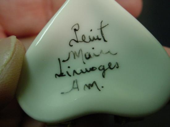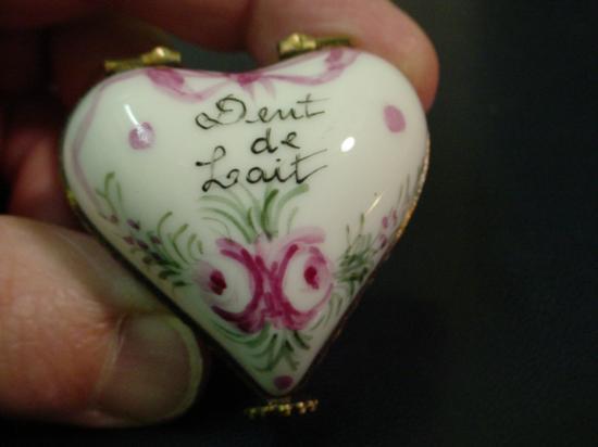 Authentic hand-painted Limoges box signed by artist from a famous studio! This box was created by an artist, graduate of one of the most prestigious French Fine Porcelain schools. Here is a SUPERB Heart with "Dent de lait" in French for "First tooth" hand-painted Porcelain box. Excellent condition, hinges and clasps work fine. This Limoges box is marked "Peint main" (Hand-painted) Limoges France, signed: A-M, as shown in picture. It is in mint condition (No chips, cracks or repairs). Would be a great value to any Limoges box collection. For the shipping...don't worry, we ship from Texas (not from France)! 1.25x1.75x1.75