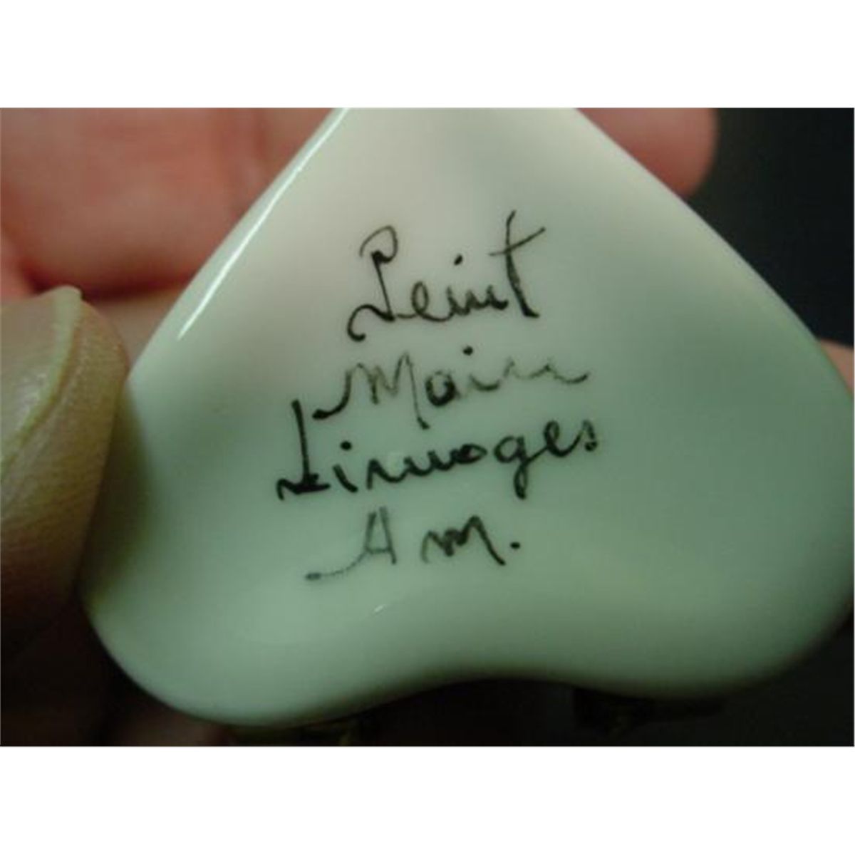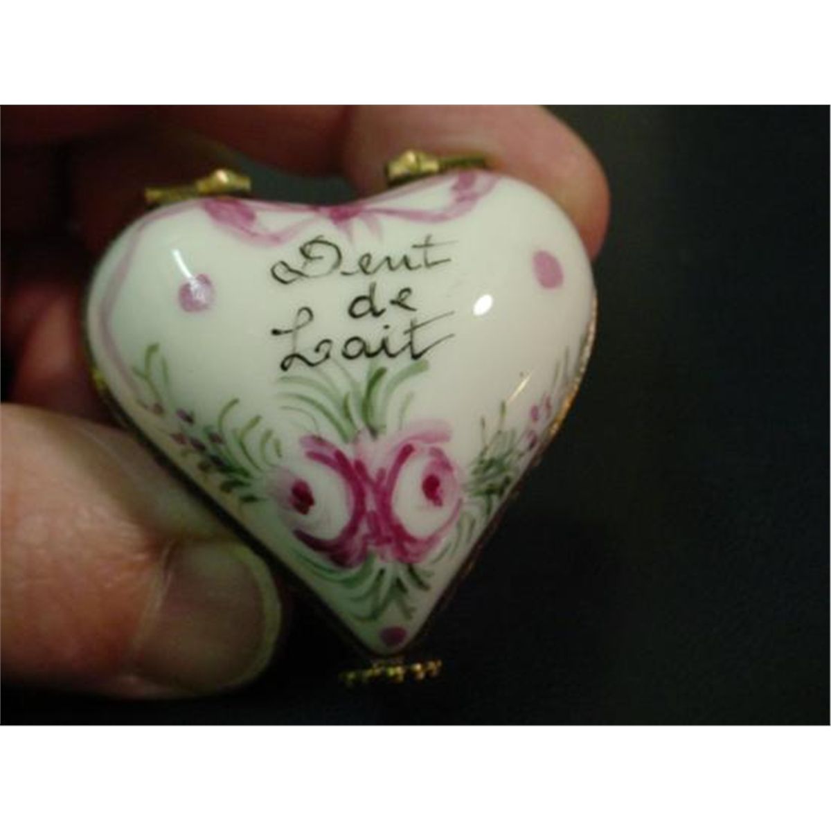 Authentic hand-painted Limoges box signed by artist from a famous studio! This box was created by an artist, graduate of one of the most prestigious French Fine Porcelain schools. Here is a SUPERB Heart with "Dent de lait" in French for "First tooth" hand-painted Porcelain box. Excellent condition, hinges and clasps work fine. This Limoges box is marked "Peint main" (Hand-painted) Limoges France, signed: A-M, as shown in picture. It is in mint condition (No chips, cracks or repairs). Would be a great value to any Limoges box collection. For the shipping...don't worry, we ship from Texas (not from France)!1.25x1.75x1.75