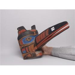 Signed and incised painted cedar. Raven Transformation Mask. Beak pegged and detachable.