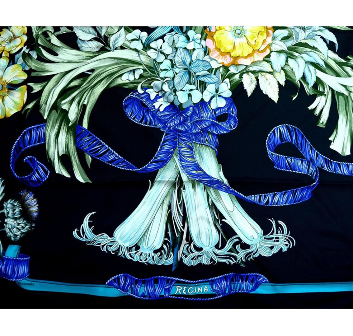 Gorgeous black Hermes scarf with ornate floral design complete with royal blue and turquoise ribbon frame motif. Perfect for a splash of color for any outfit or show it off daily by tying it to the handle of your favorite handbag!