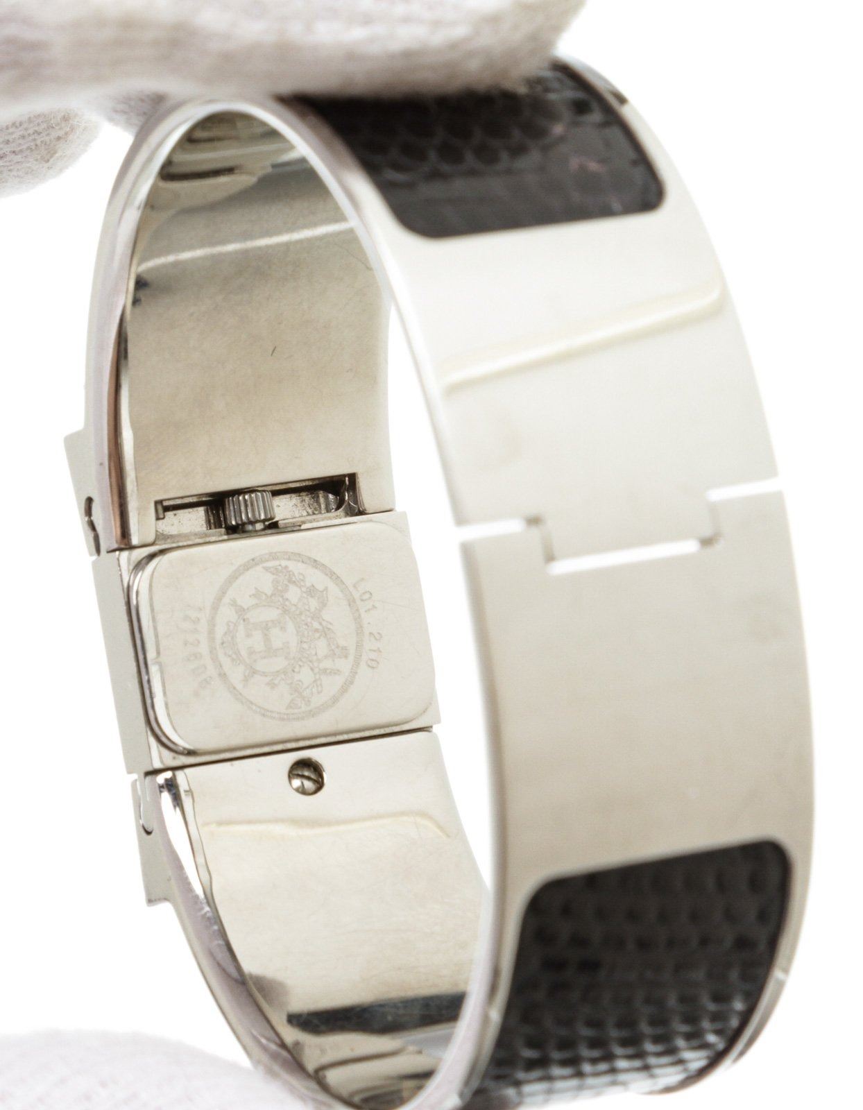 Stainless Steel Hermès Loquet watch featuring a quartz movement, smooth bezel, white dial and black lizard bracelet with slide lock closure.