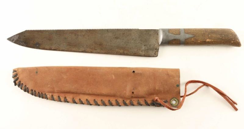 The blade has been fashioned from a saw blade and the handle has been crafted from the saws handle & decorated/inlayed with pewter. Measures 17" overall with an 11" sawback blade. From the 19th to early 20th century. Includes a handmade leather scabbard made later during use. Good condition with staining, rust and aging. Great patina on grip and pewter!