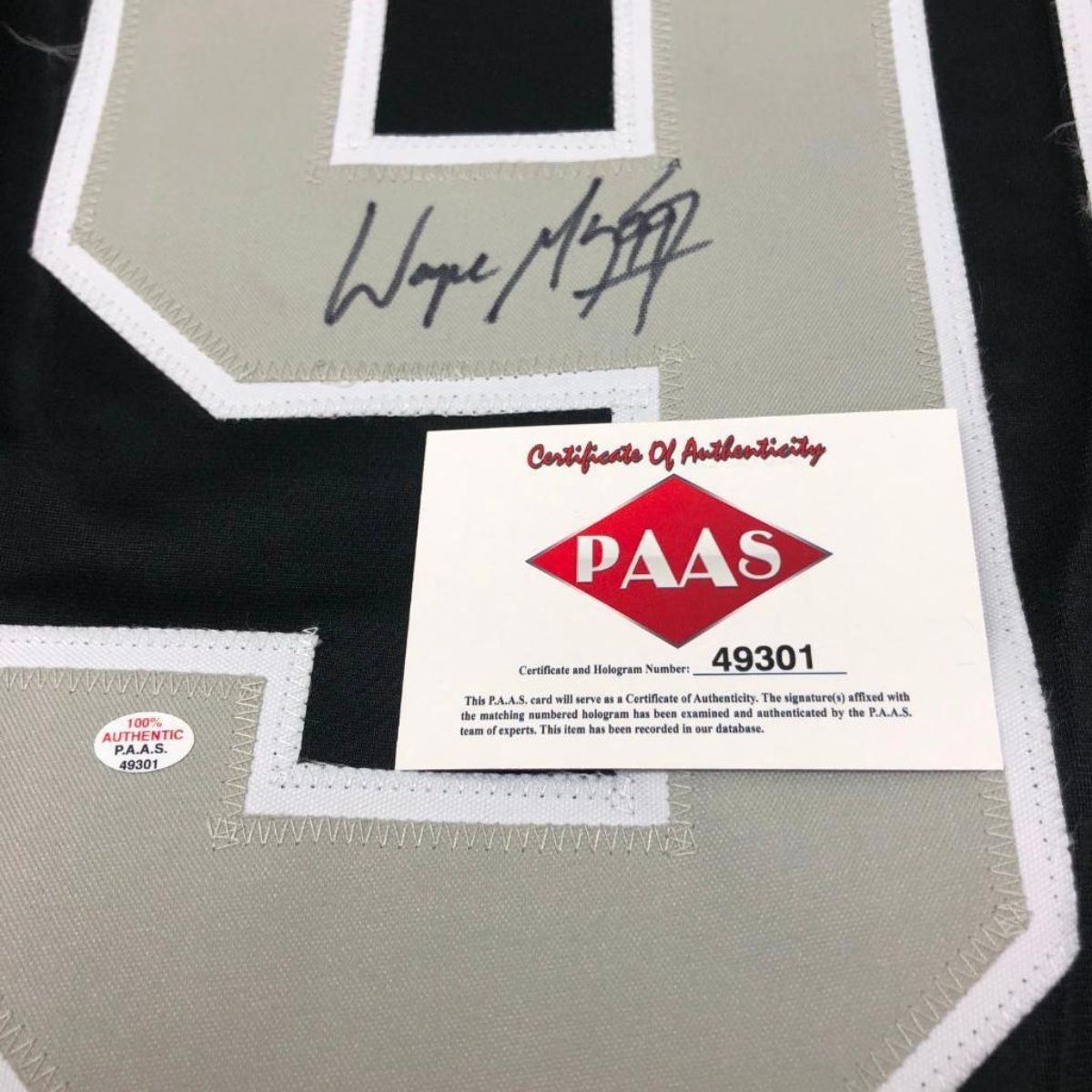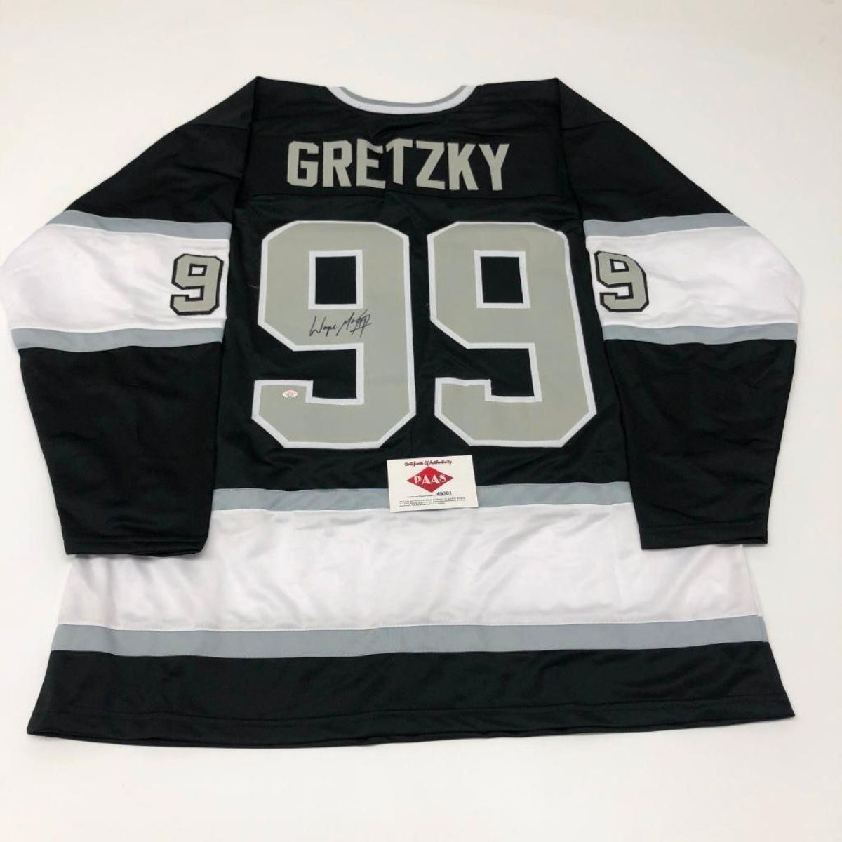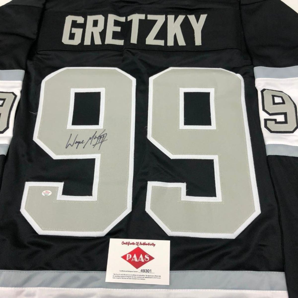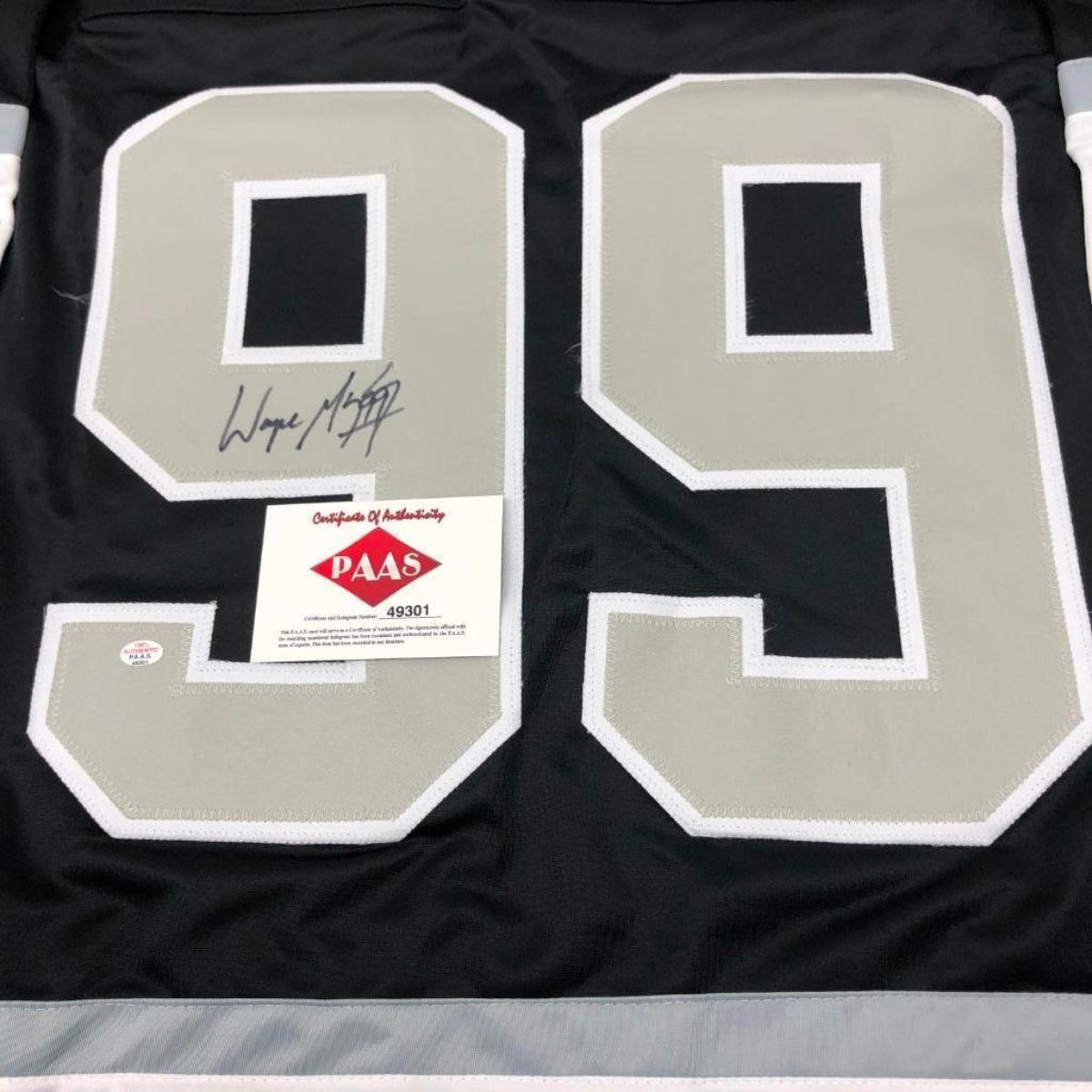 An Authentic L.A Kings Wayne Gretzky #99 Autographed Jersey With COA. A Remarkable Signature From The "Great ONE" Himself. Certified Authentic NL.A Kings #99 Jersey. An Excellent Addition To Any Sports Collection & A Must Have For A NHL Sports Collector. This is a list of career achievements by Wayne Gretzky in the National Hockey League (NHL). Upon his retirement on 18 April 1999, Gretzky held or shared 61 NHL records. These records include 40 Regular Season, 15 Playoff and 6 All-Star records. View Photos For Further Details. Gretzky set records in both regular season and post-season play, holding the record for most career regular season goals (894), assists (1,963), points (2,857) and hat-tricks (50). The next closest player in total points for the regular season is Jaromir Jagr at 1,921, thus Gretzky had more career assists than any other player has total points. Gretzky scored his first 1000 points faster (424 games) than any other player in NHL history, and scored a second 1,000 points (point number 1,001 through 2,000) faster (433 games) than any player other than himself. Gretzky's point total including regular season and playoffs stands at an imposing 3,239 (1,016 goals, 2,223 assists). His 47 playoff points in 1985 and 31 assists in 1988 are still records for a single post-season round, and he holds the record for career playoff goals (122), assists (260), points (382), hat-tricks (10) and game-winning goals (24). View Photos For Further Details.