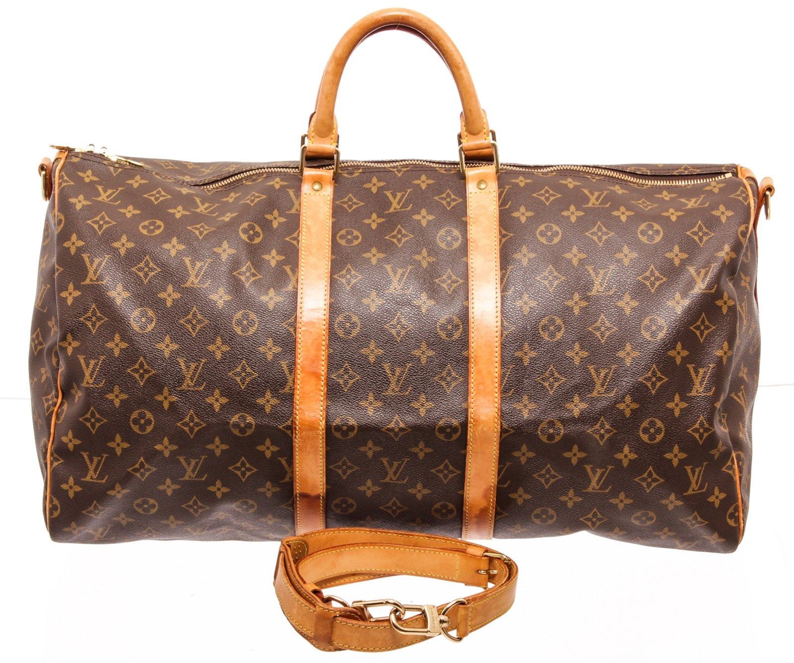 Detail: Brown and tan Monogram coated canvas Louis Vuitton Keepall Bandouliere 50 with brass hardware, tan vachetta leather trim, dual rolled top handles, luggage tag, brown canvas lining, single interior compartment and two-way zip closure at top. Detachable shoulder strap.