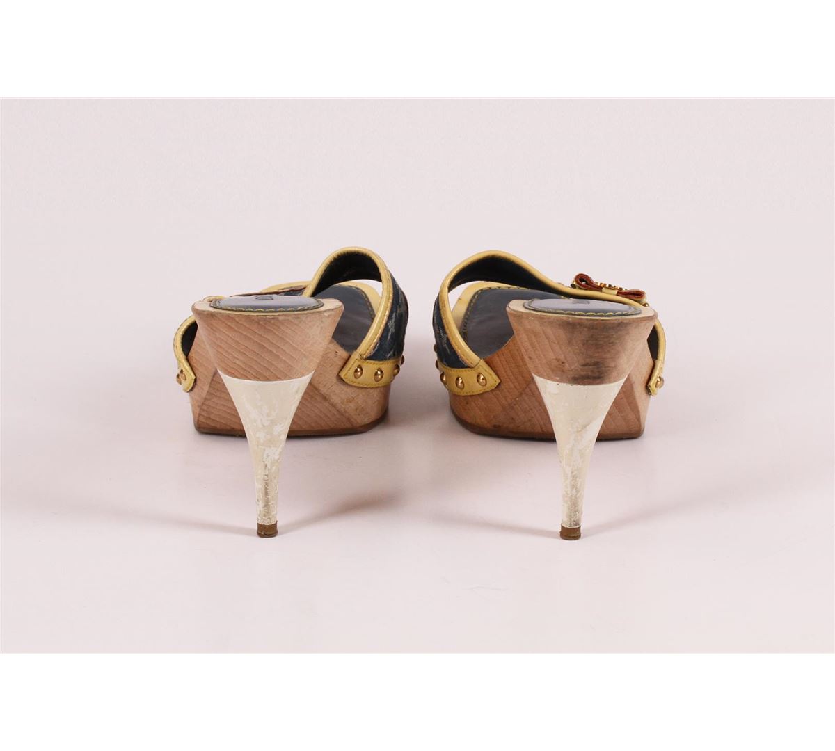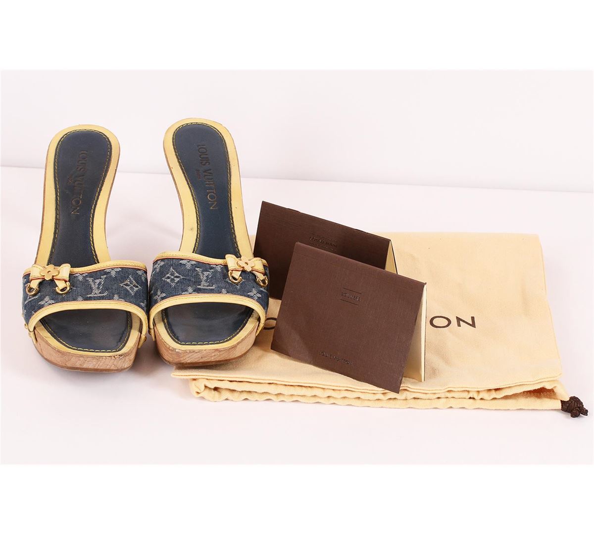 100% Authentic Louis Vuitton Monogram Denim heels. These adorable heels are made form beautiful solid wood; they feature an adorable leather and bronze bow accent and a cushiony navy blue and off white leather foot bed with "Louis Vuitton Paris" imprinted. The Louis Vuitton monogramed denim material is very versatile and the heel is classified as a kitten heel making these heels comfortable and a great option for most occasions. Wear is visible in the form of scratches, fading and stains. Please see pictures. Comes with Louis Vuitton shoe drawstring sleeper bag and two Louis Vuitton shoes booklets. European Size 38.5 equivalent to a US size 7.5-8.