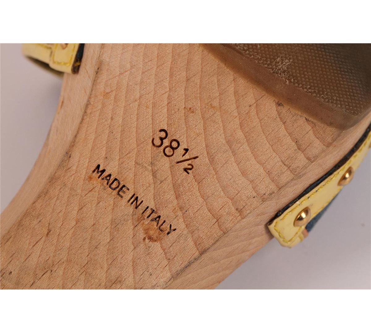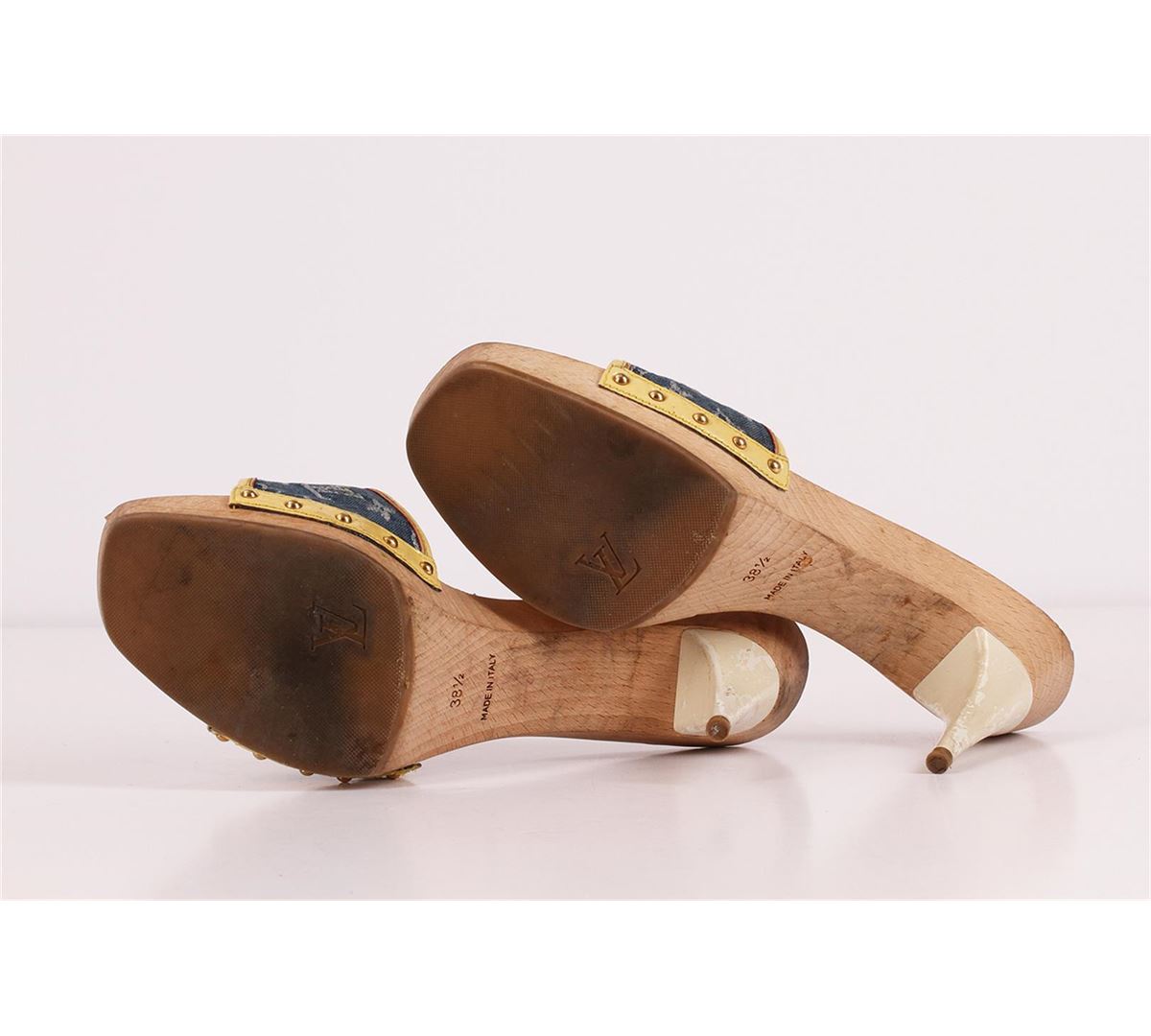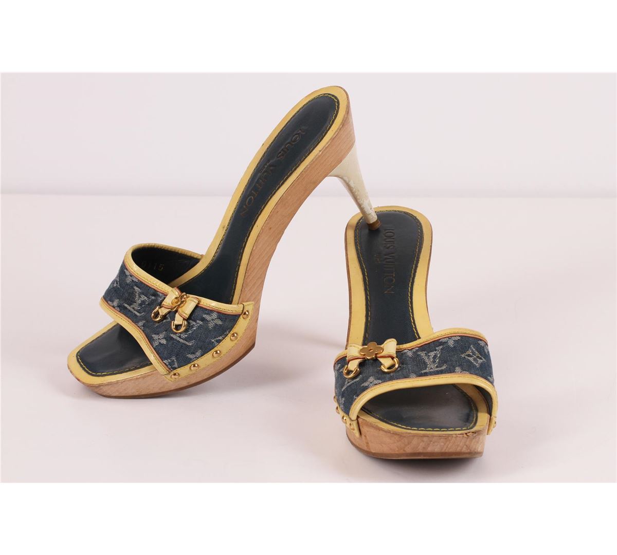 100% Authentic Louis Vuitton Monogram Denim heels. These adorable heels are made form beautiful solid wood; they feature an adorable leather and bronze bow accent and a cushiony navy blue and off white leather foot bed with "Louis Vuitton Paris" imprinted. The Louis Vuitton monogramed denim material is very versatile and the heel is classified as a kitten heel making these heels comfortable and a great option for most occasions. Wear is visible in the form of scratches, fading and stains. Please see pictures. Comes with Louis Vuitton shoe drawstring sleeper bag and two Louis Vuitton shoes booklets. European Size 38.5 equivalent to a US size 7.5-8.