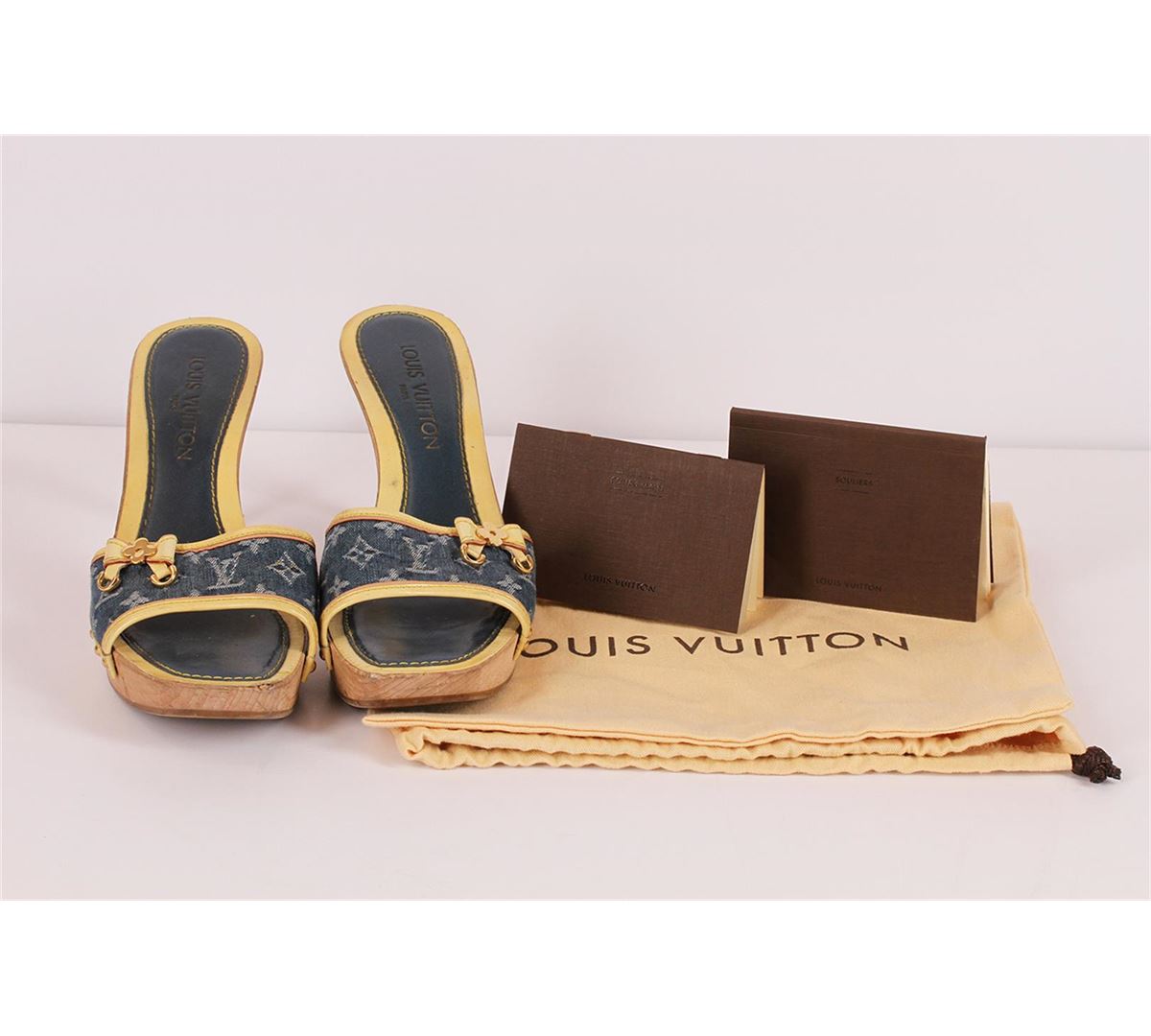100% Authentic Louis Vuitton Monogram Denim heels. These adorable heels are made form beautiful solid wood; they feature an adorable leather and bronze bow accent and a cushiony navy blue and off white leather foot bed with "Louis Vuitton Paris" imprinted. The Louis Vuitton monogramed denim material is very versatile and the heel is classified as a kitten heel making these heels comfortable and a great option for most occasions. Wear is visible in the form of scratches, fading and stains. Please see pictures. Comes with Louis Vuitton shoe drawstring sleeper bag and two Louis Vuitton shoes booklets. European Size 38.5 equivalent to a US size 7.5-8.