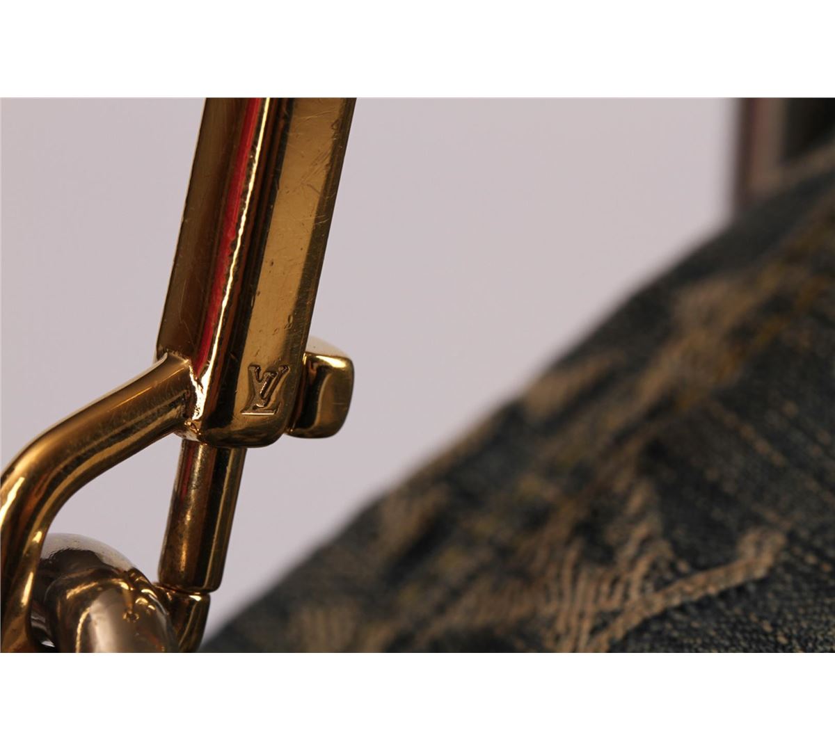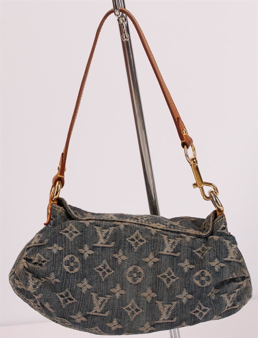 100% Authentic Louis Vuitton denim pleaty bag handbag is perfect for anyone who loves fashion and a lightweight small purse. This versatile Louis Vuitton bag can be worn on the shoulder or as a wrist clutch. The denim has a natural distressed denim look, somewhat washed out, like the 80's acid wash jeans. This is the way the Louis Vuitton bags were designed in this collection, and is not only from wear. Wear is visible on the natural cowhide leather which has turned to its beautiful patina. There are scratches and fading visible on the hardware and some stains on the interior. Please see the pictures. The Safran Alcantara interior features one small pocket, which the date is imprinted within. The interior is small, yet it can easily carry your small wallet, cell phone, lipstick, keys and more! Approximate Measurements: length 10" x width 3" x height 7".