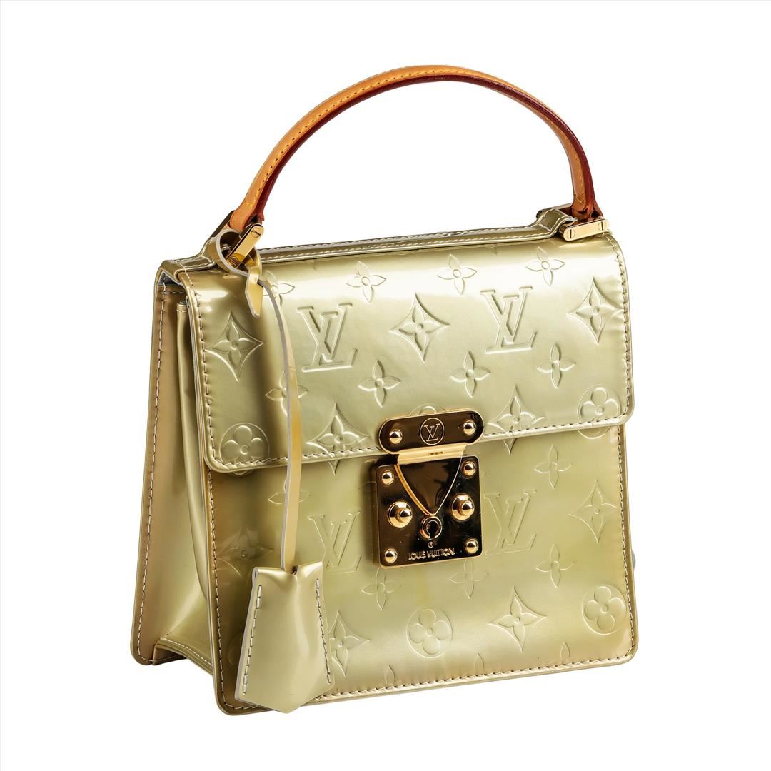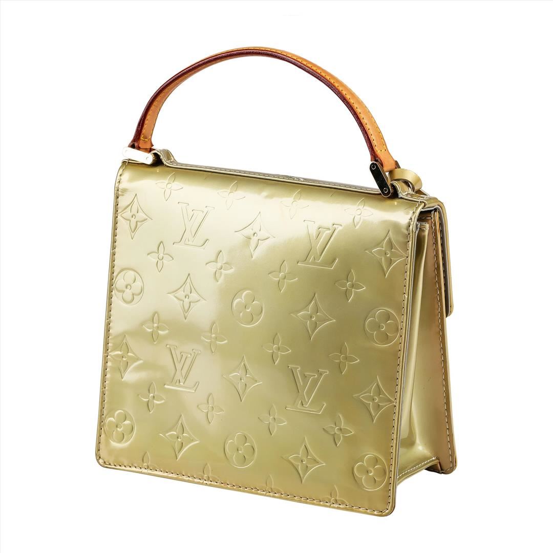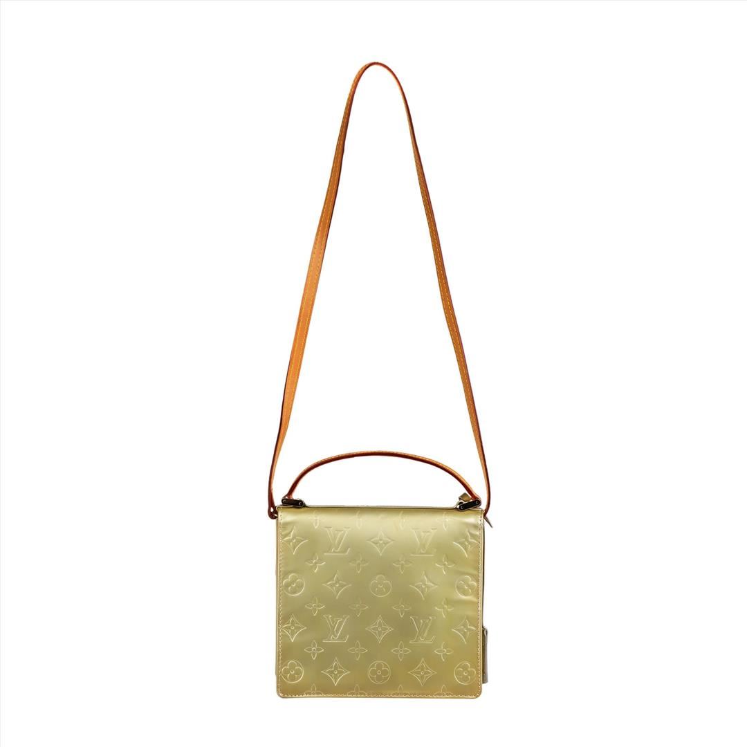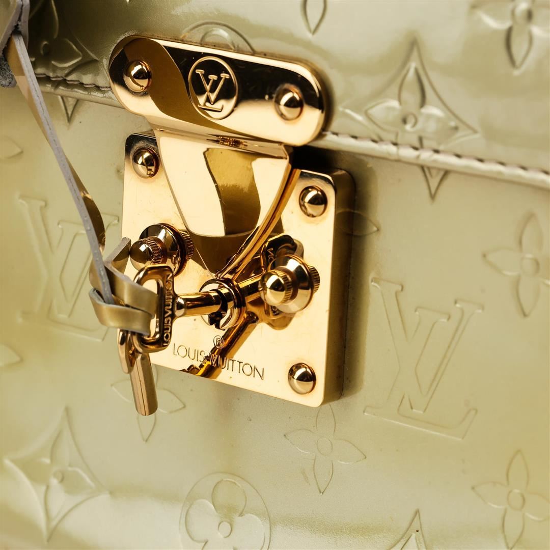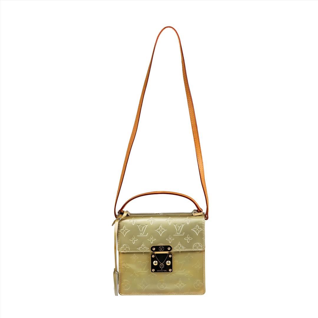 100% Authentic Louis Vuitton top handle purse in iconic Gold Vernis Leather. This versatile bag features gold-tone brass hardware, muted gold LV monogram patent leather with natural leather top handle and included long strap for wearing as a cross body bag. The bag is in great used condition with minimal signs of wear and like-new interior. Please see photos.