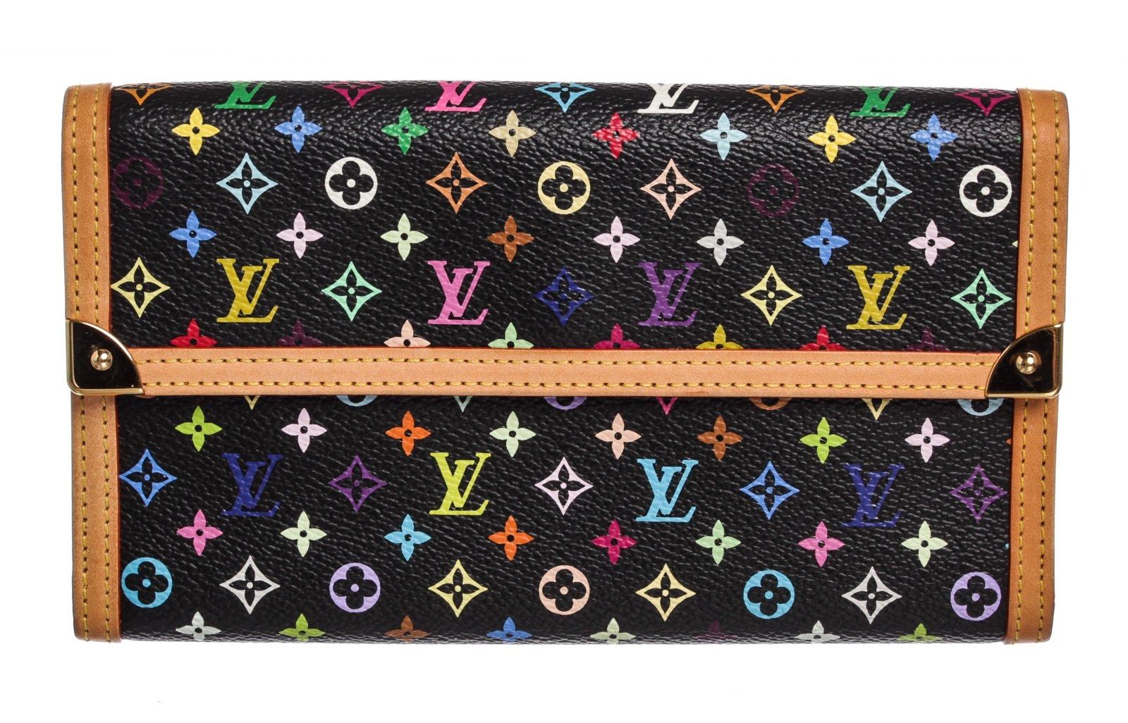 Black multicolore monogram coated canvas Louis Vuitton Porte Tresor wallet with brass hardware, tan vachetta leather trim, tan leather interior lining, four card slots, two bill compartments, single change compartment with snap closure and snap closure at front.