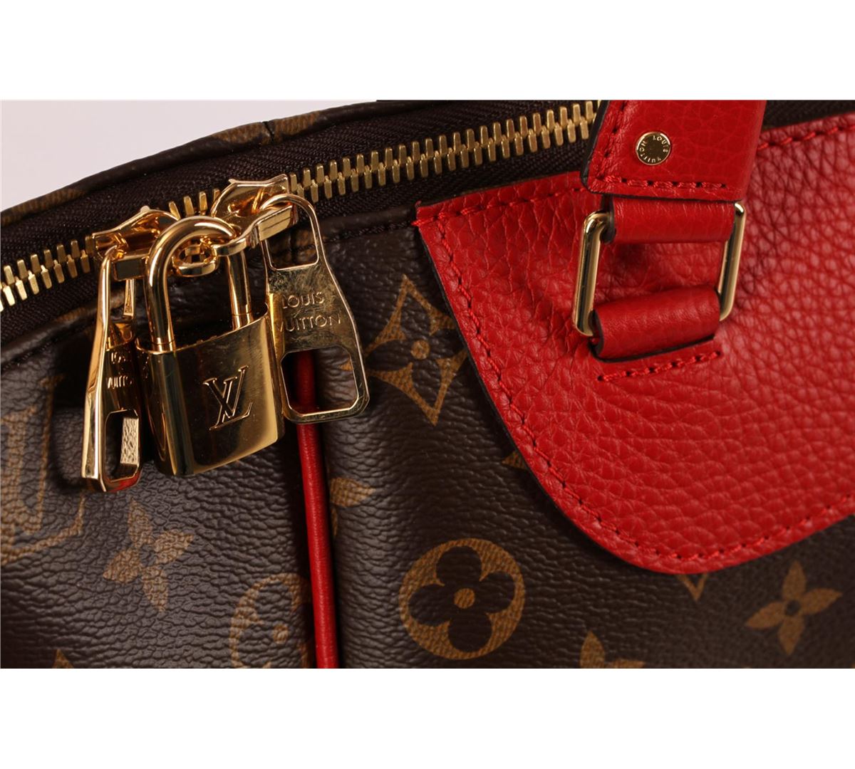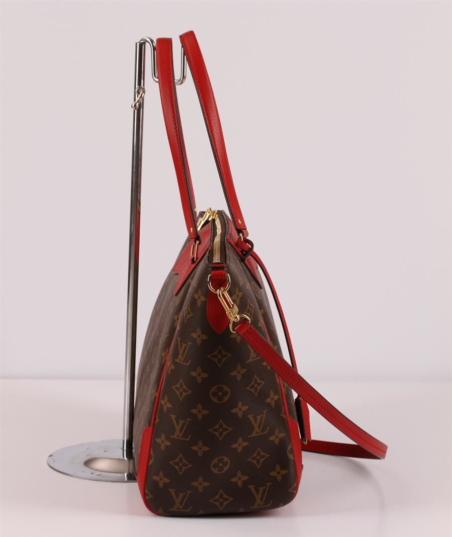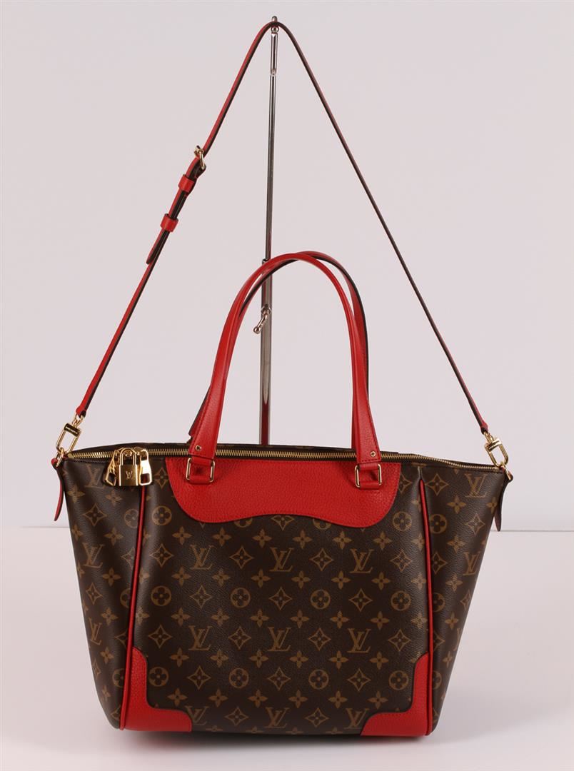 100% Authentic Louis Vuitton Monogram Red Cerise Estrela NM Bag. This new in box bag is an instant classic! The Estrela NM is great way to add a bit of Louis Vuitton luxury to your everyday with its iconic Louis Vuitton brown monogram canvas and timeless shape. Trimmed in vibrant red cowhide leather, this bag stands out in all the right ways! Interior is lined with matching microfiber lining and boasts one large open pocket and two smaller open pockets opposite. Comes complete with removable and adjustable cross-body strap, matching pochette with Louis Vuitton padlock and keys, original dust bag, box with corded ribbon, shopping bag and card. Condition is in great pre-loved condition. Approximate dimensions: length 18.1" x width 6.7" x height 11".