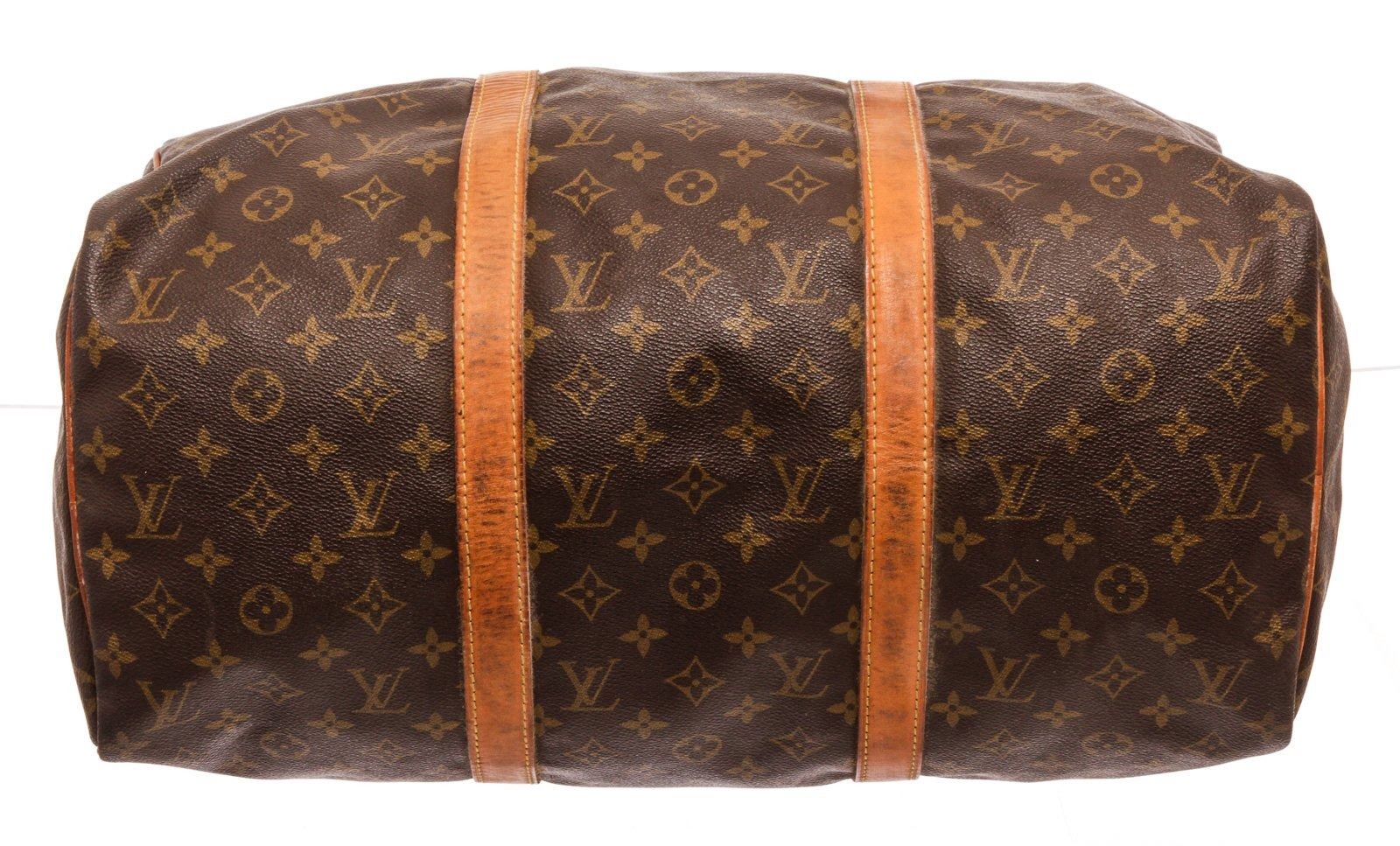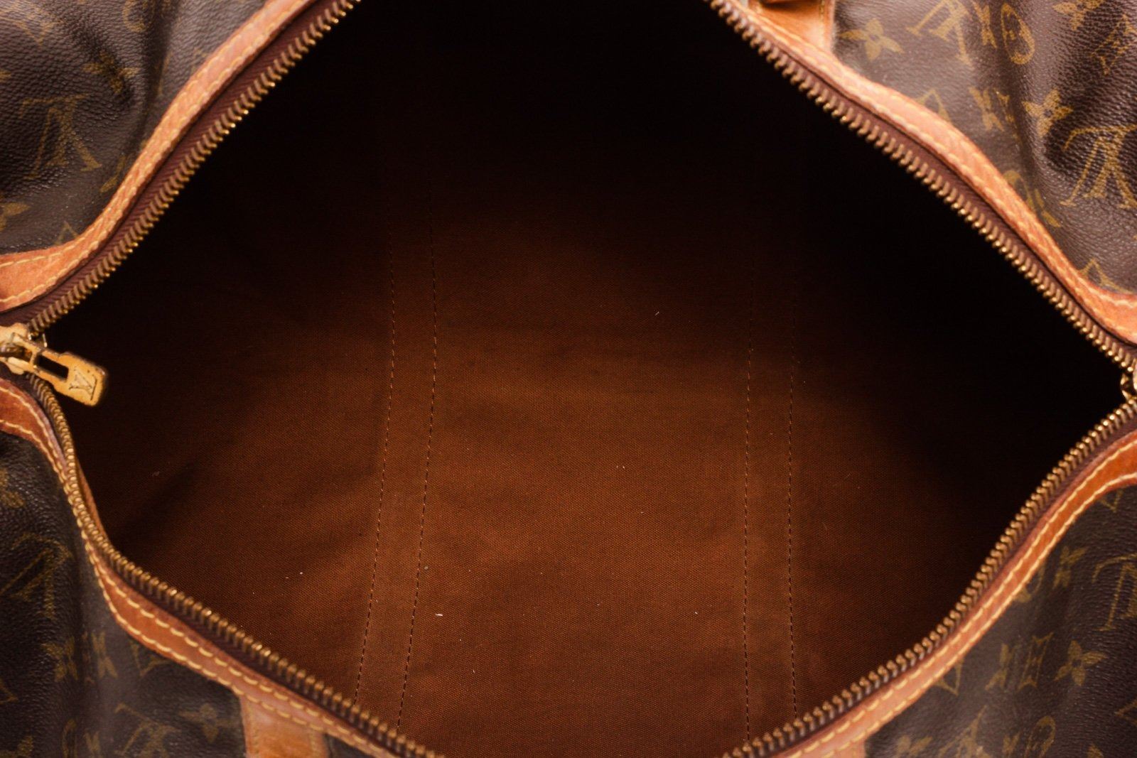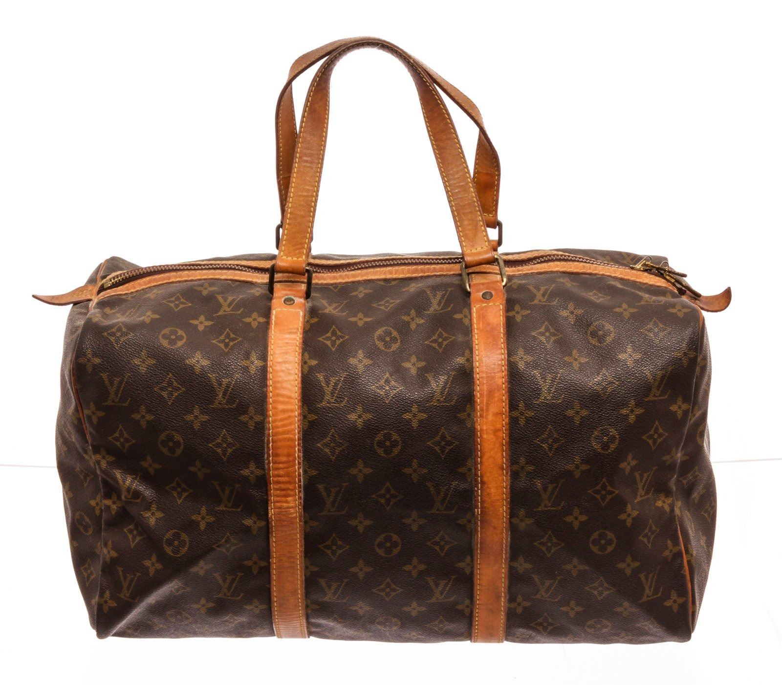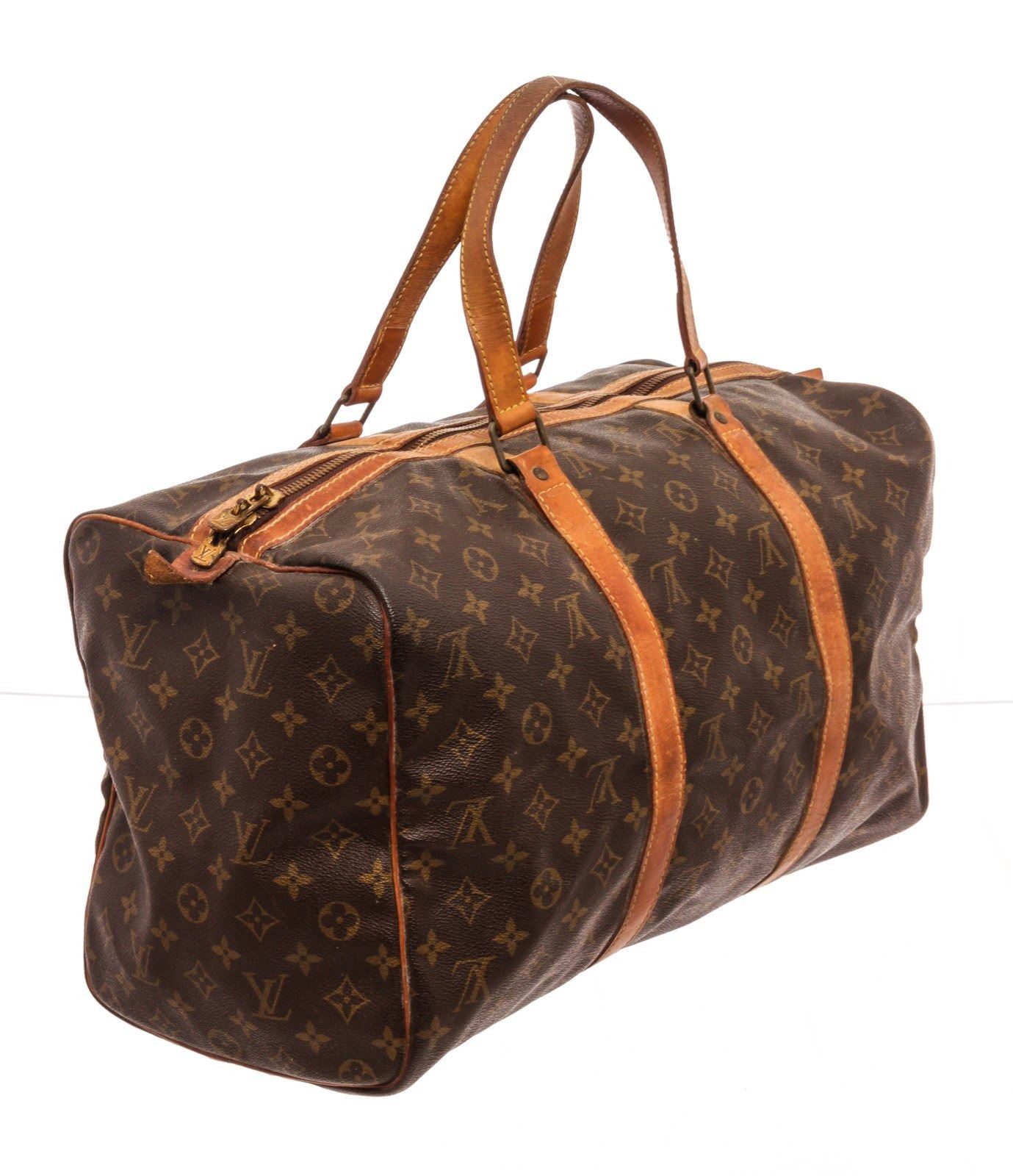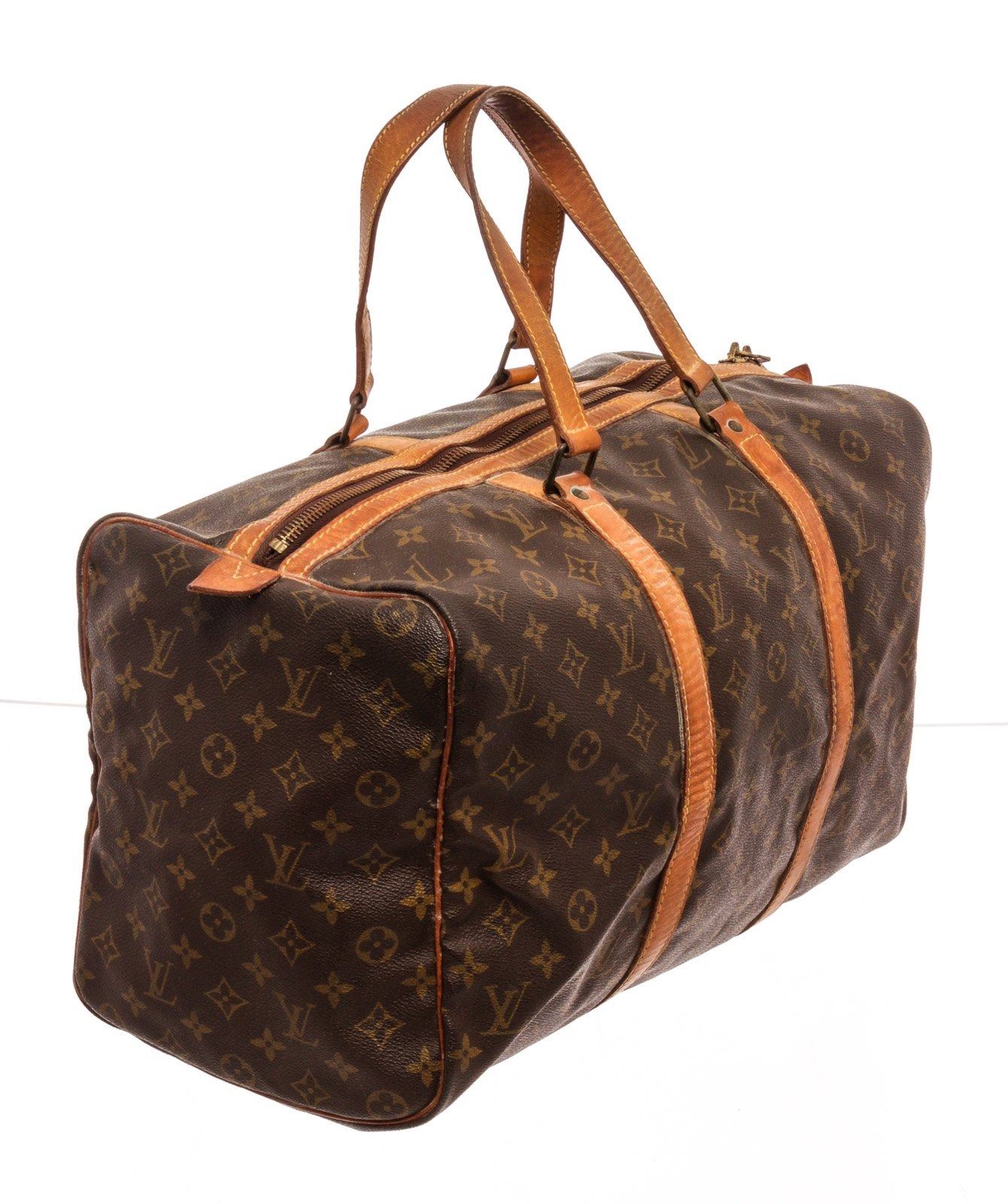 Louis Vuitton Brown Monogram Sac Souple 50cm Travel Bag with material monogram canvas, gold-tone hardware, interior zip pockets, dual top handles handle, and zip closure.