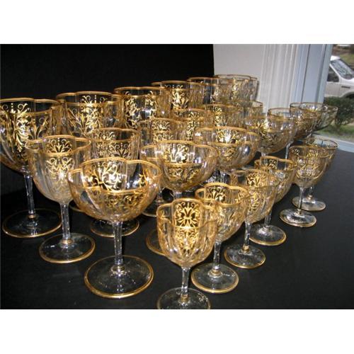 Is a set of 4 different glasses in crystal,Water, wine, liquor, champagne, from each one is 16 glasses.In excellent condition, very fine crystal engraved with flowers design and in real gold inside.64 Pieces in total.