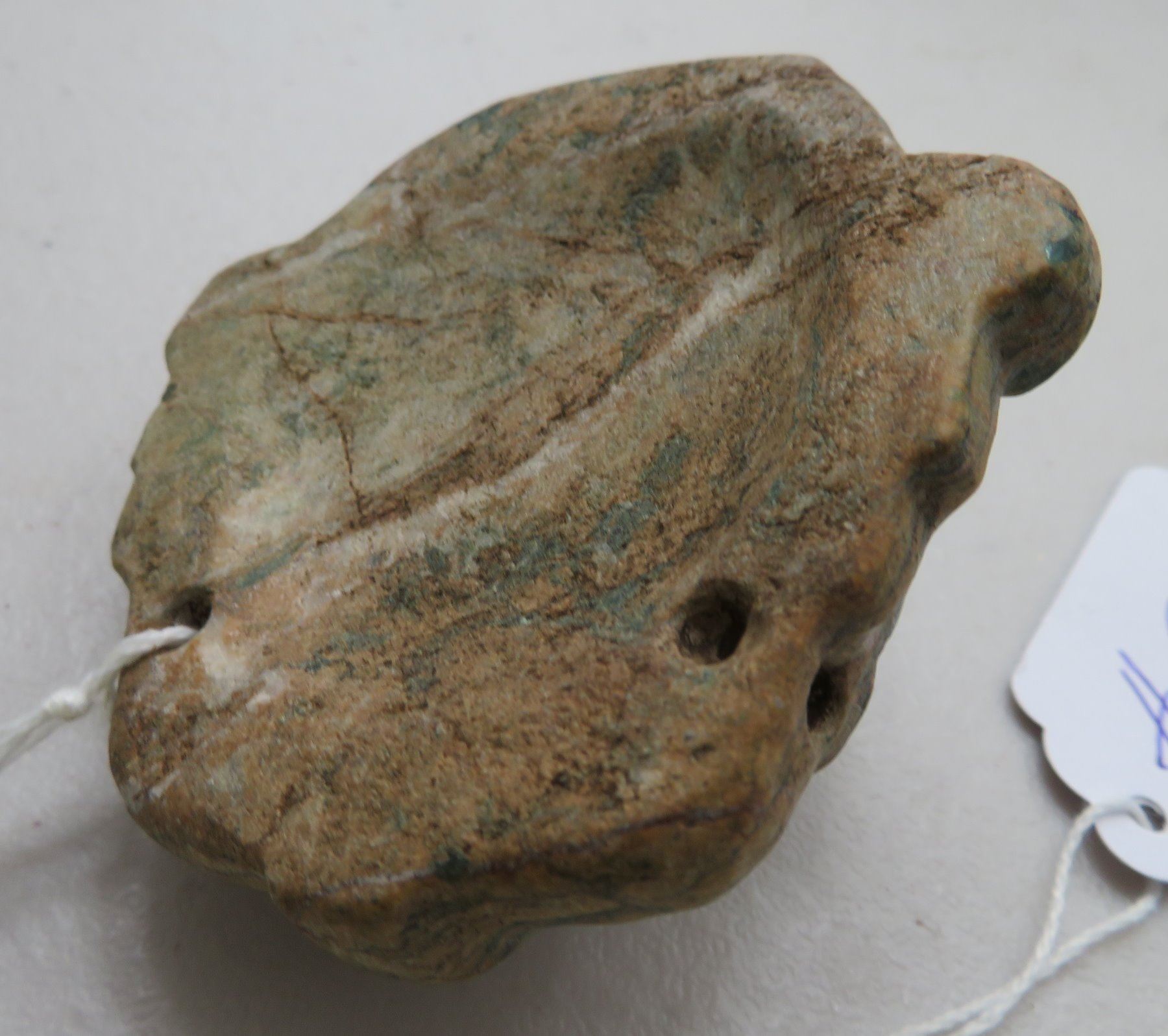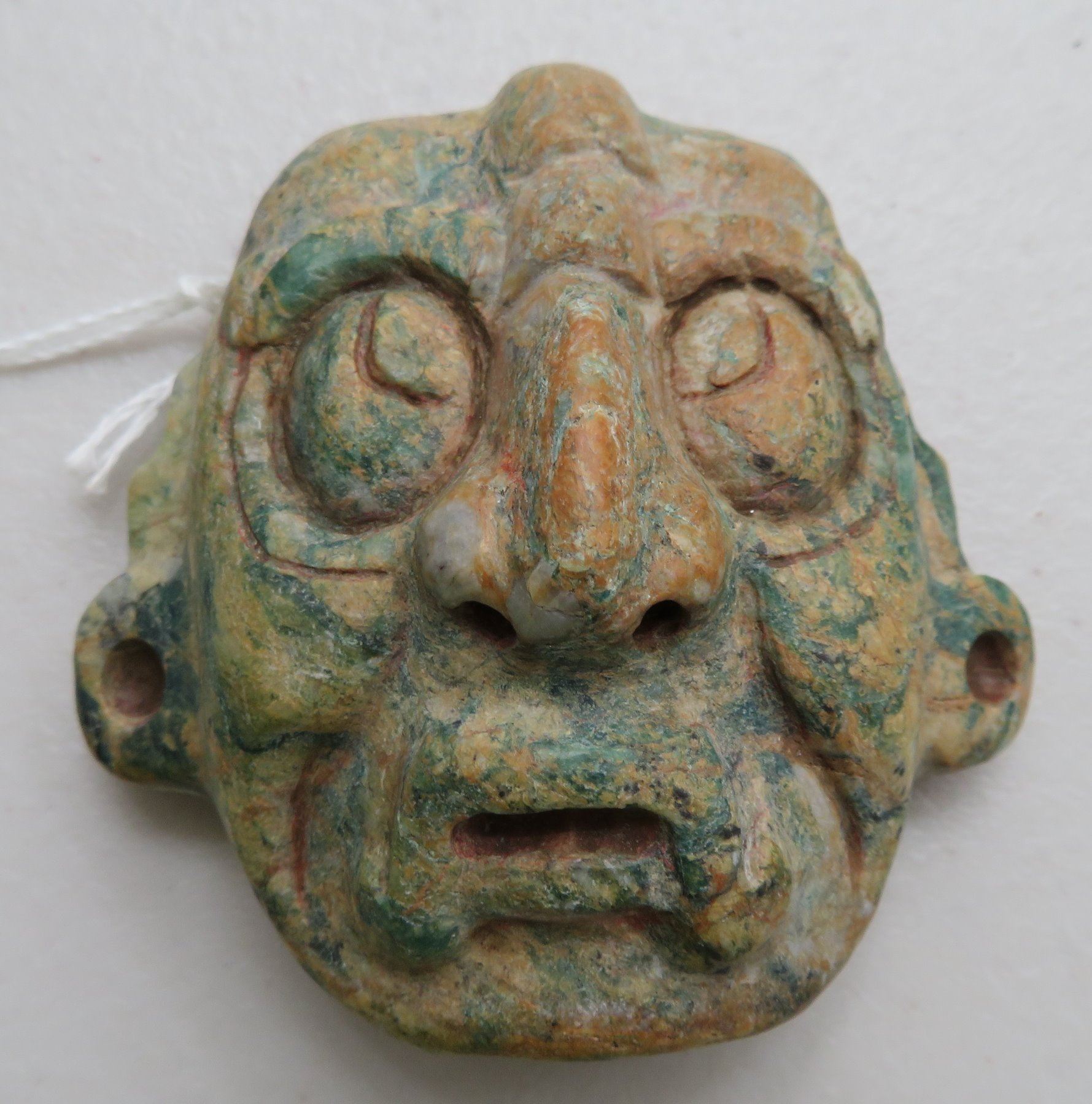 Authentic Mayan Stone Mask, c. 2000 years old. Made of green jadeite, the item measures 2 1/2" x 2 1/2" x 1". Guatemala. The deity Chacmool, from an old, California collection. Condition: Good, see images. Shipping: $30.00 w/insurance and signature, due to value.