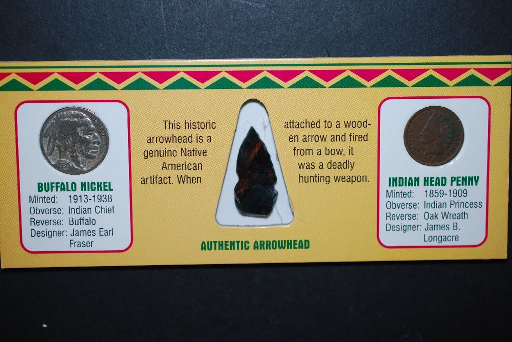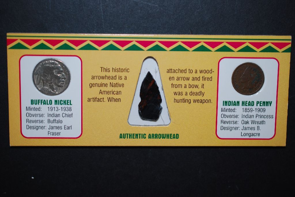 Authentic Native American Arrowhead & Coin Collection Set In Display Case With COA Included; 1930 Buffalo Nickel, Arrowhead & 1906 Indian Head One Cent; EST. $10-20