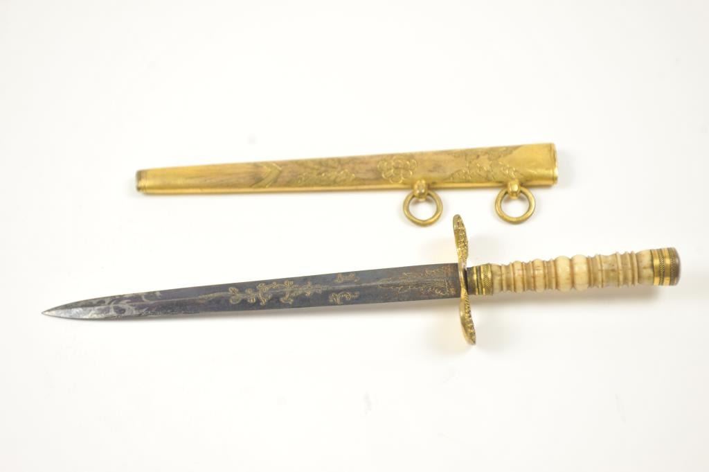 Authentic Naval dirk with bone grips and gold gilt scabbard and mounts from the Georgian era. 9 ½” in overall length with 80% blue with traces of gilt on the blade. The mounts and scabbard show most of the gilt. Thegrips and the knife are overall in very good plus condition. From the Revolutionary War to Napoleonic era or shortly after in our opinion. Of American or British origin. Est.: $600-$1,200.