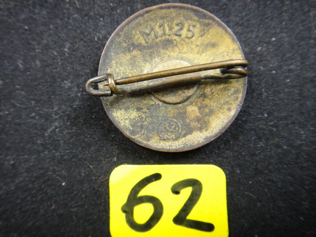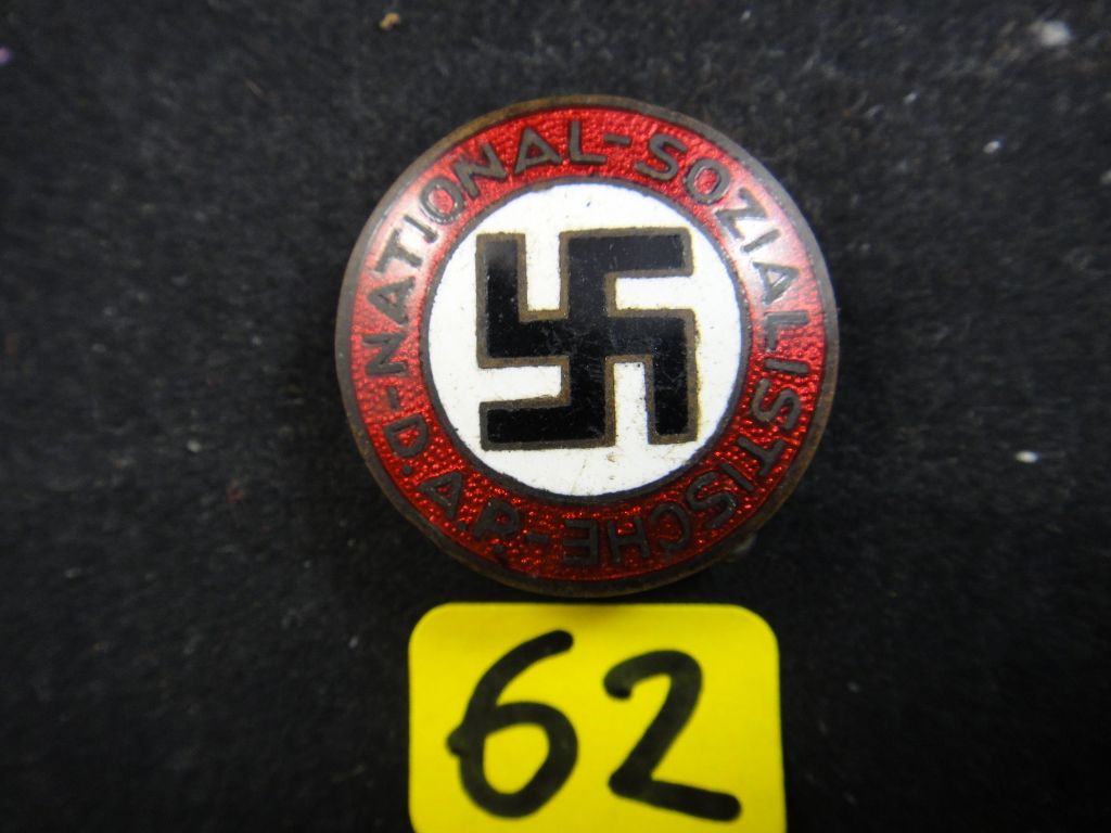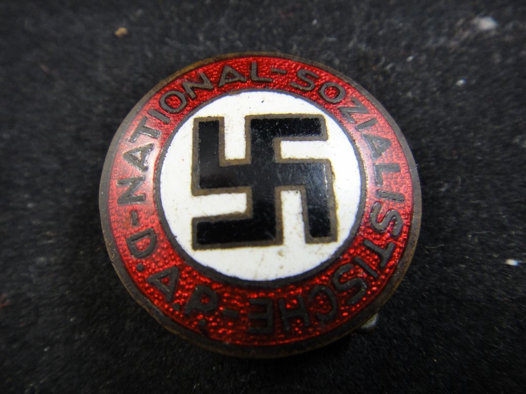Very good condition, complete WWII era National - Sozialistische - D.A.P. pin. Swastika in black enamel with white enamel background and red enamel border. Copper or brass construction. Back has makers mark as well as M.1.25