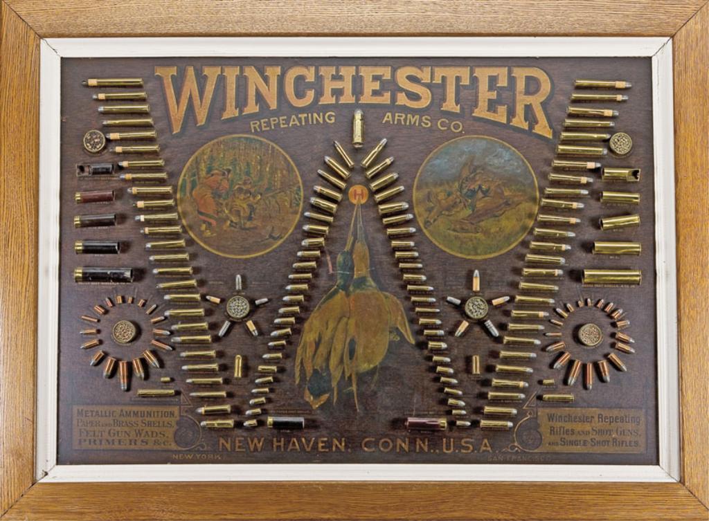 Authentic Oak framed Winchester 1890 “Big W” cartridge display board, approx. 38” x 51” in overall very good to excellent condition with all cartridges and shell present including the big .70-150. The color artwork on the board is in excellent condition overall with a couple scattered light scratches and mars to the finish; the back of the board still retains its Compliments of Winchester tag and the wire securing the cartridges is exposed. One of the better conditioned Winchester boards we have had to offer and a center piece for any serious gun room. Est.: $4,000-$8,000.