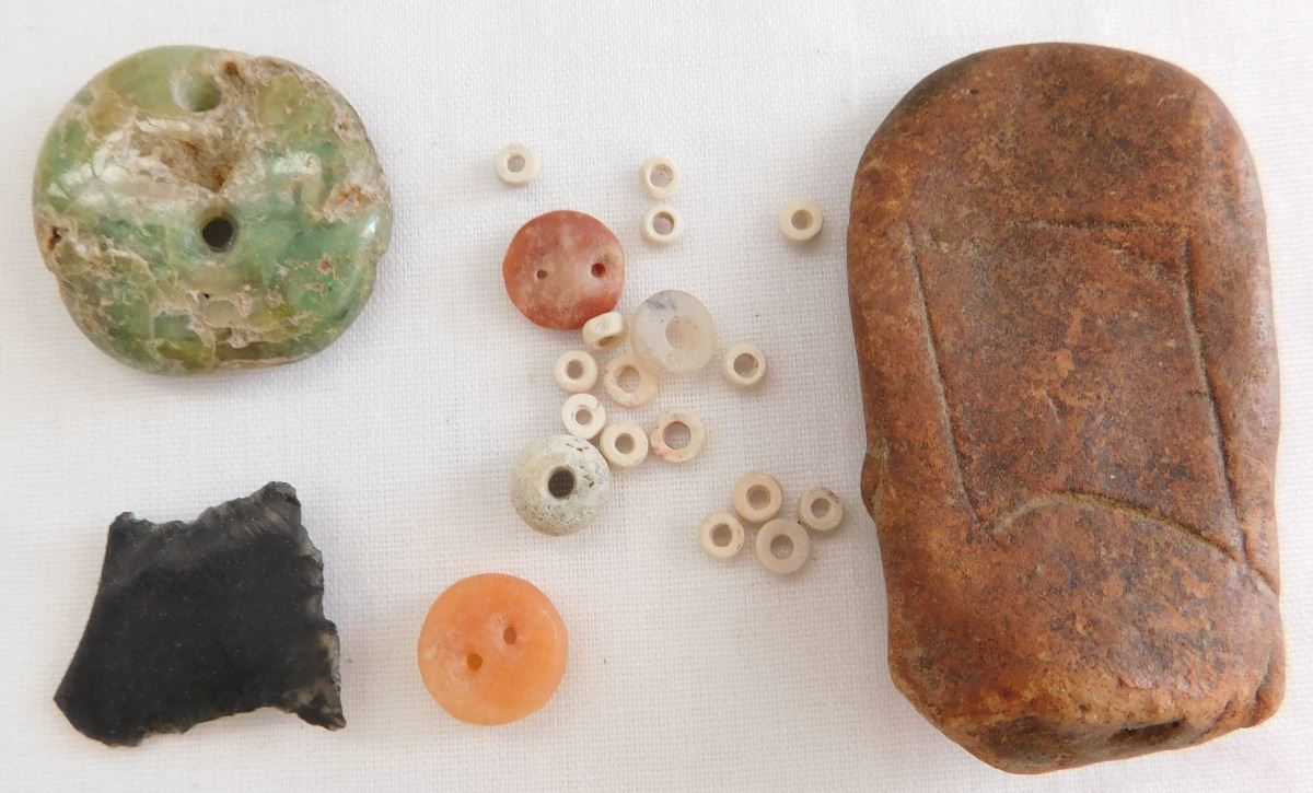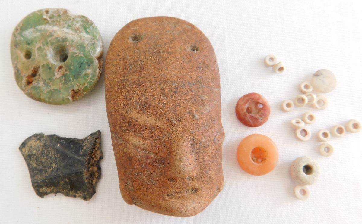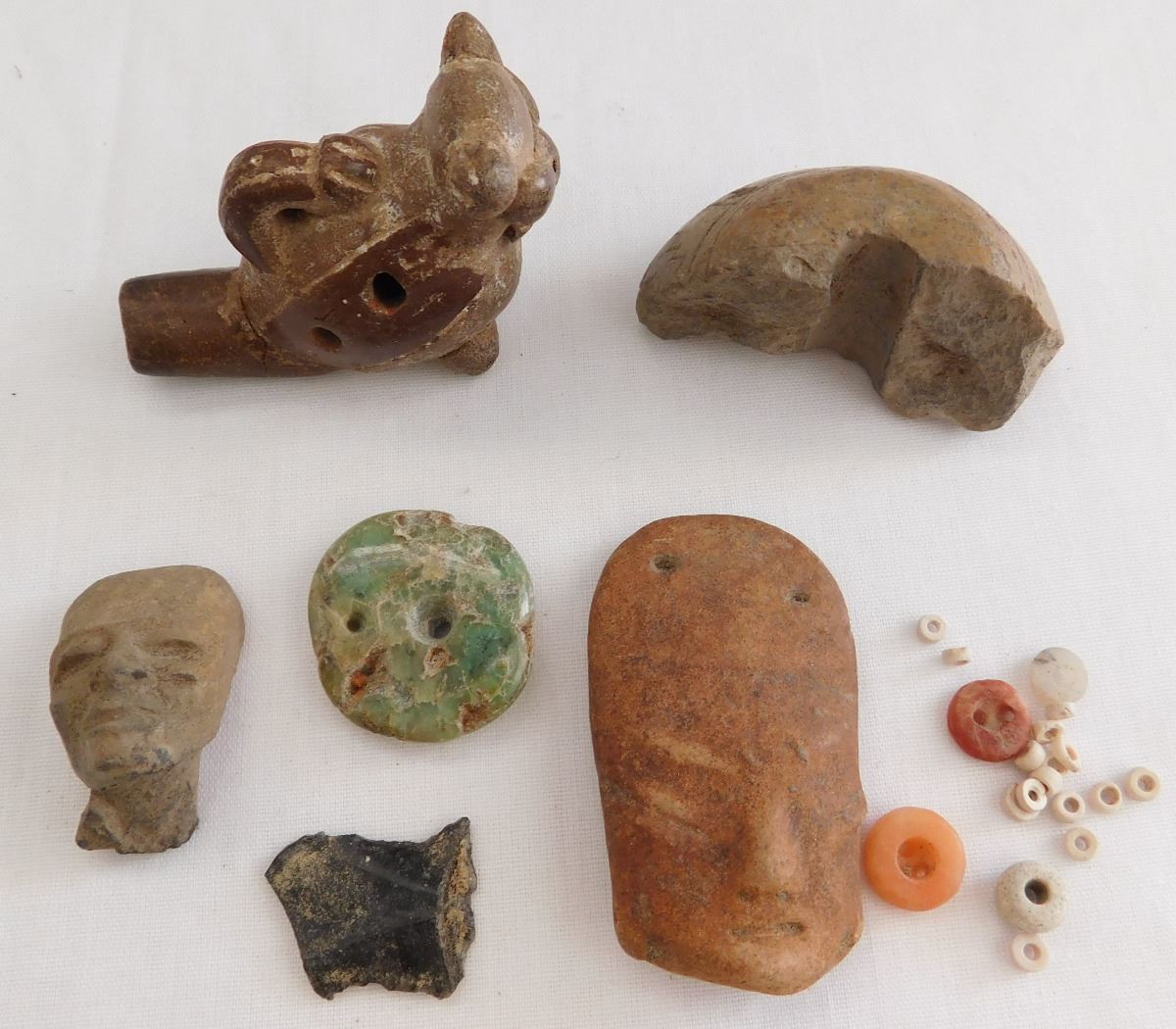 Authentic Pre-Columbian Artifact Collection. Consisting of jade, obsidian, clay, shell and stone, these items are from Central Mexico and measure 2 1/2 x 2 1/4 inches. The highlight of this collection is a 1 1/8" jade pendant. Condition: All items are as found, see images. Shipping: $19.50.