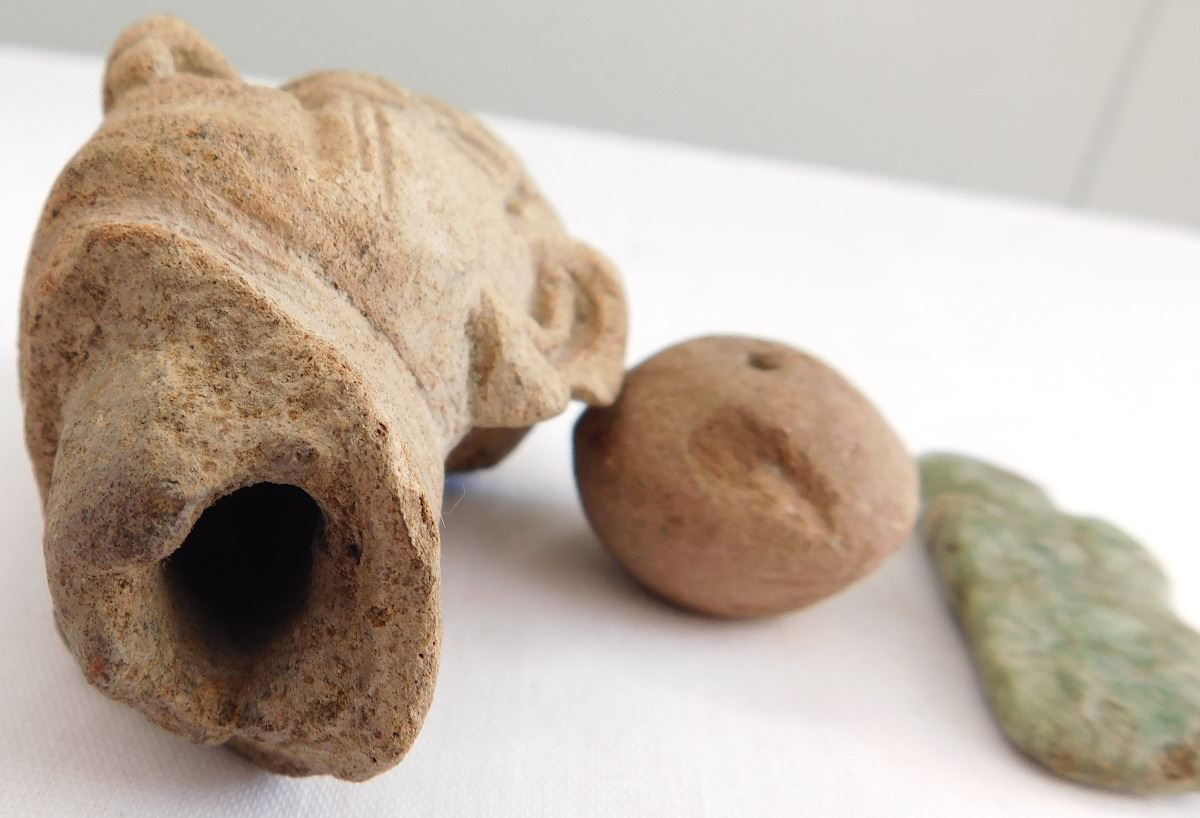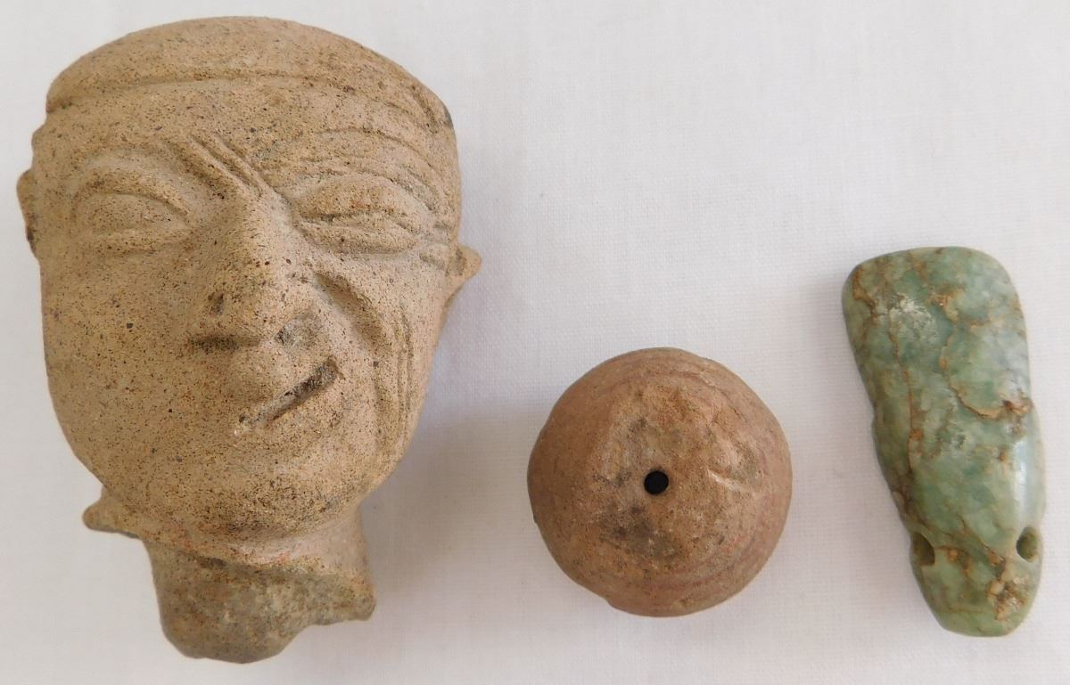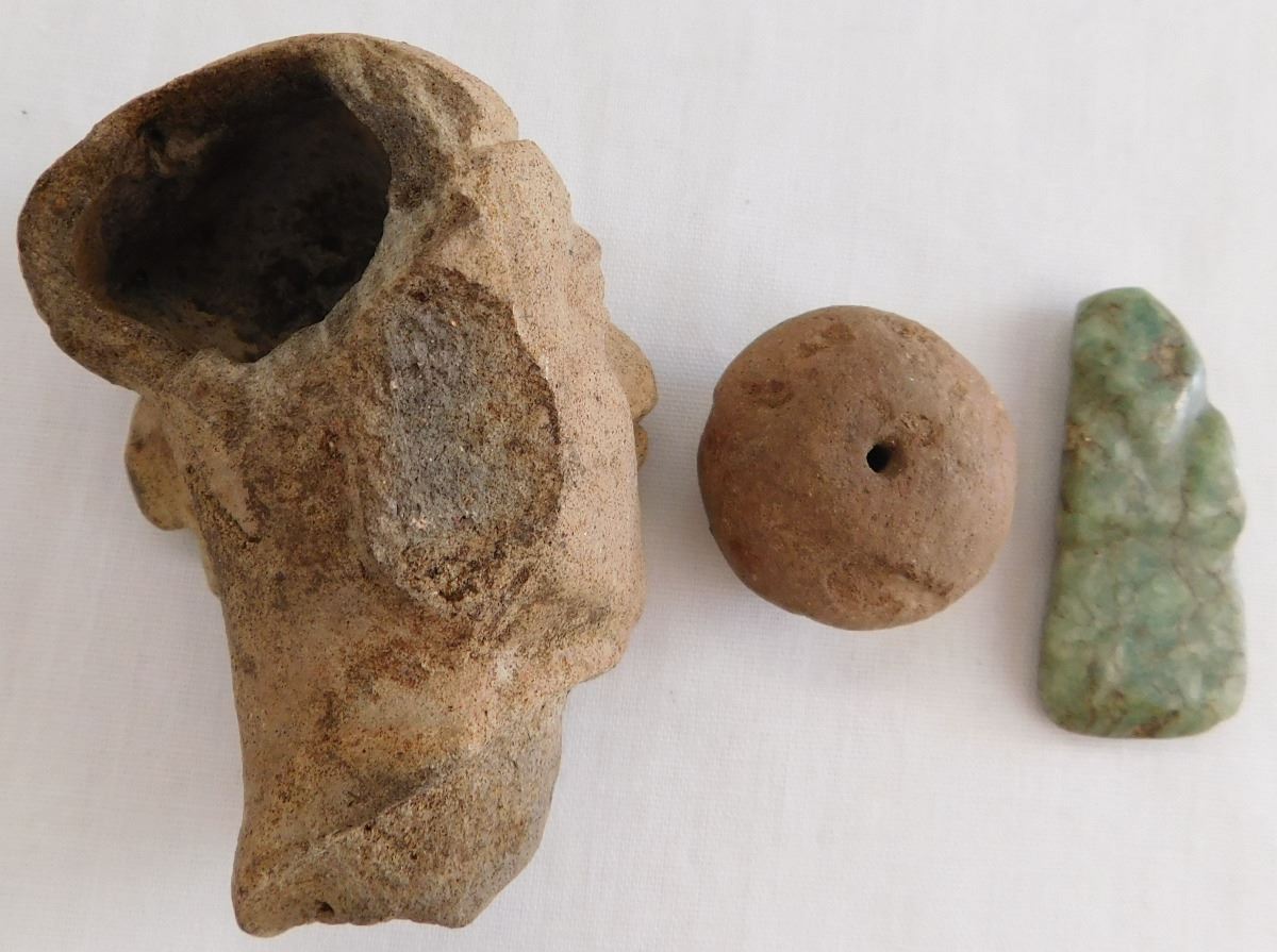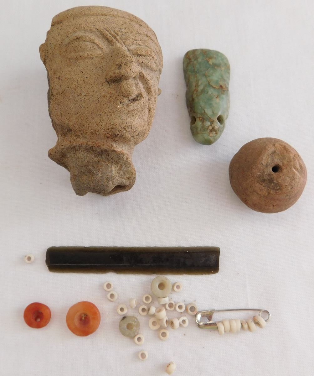 Authentic Pre-Columbian Artifact Collection. Consisting of jade, obsidian, clay, shell and stone, items are from Central Mexico and measure 2 1/2 x 1 1/2 to 1/8 inches. The highlight of this collection is a clay head with slashed face. Condition: All items are as found, see images. Shipping: $18.50.