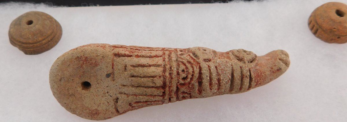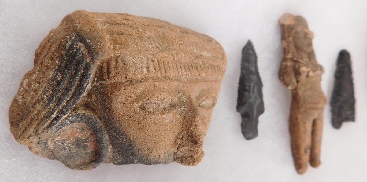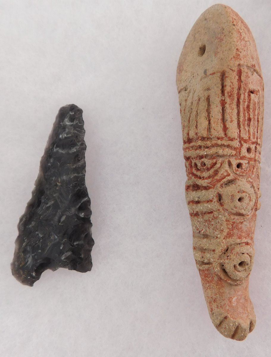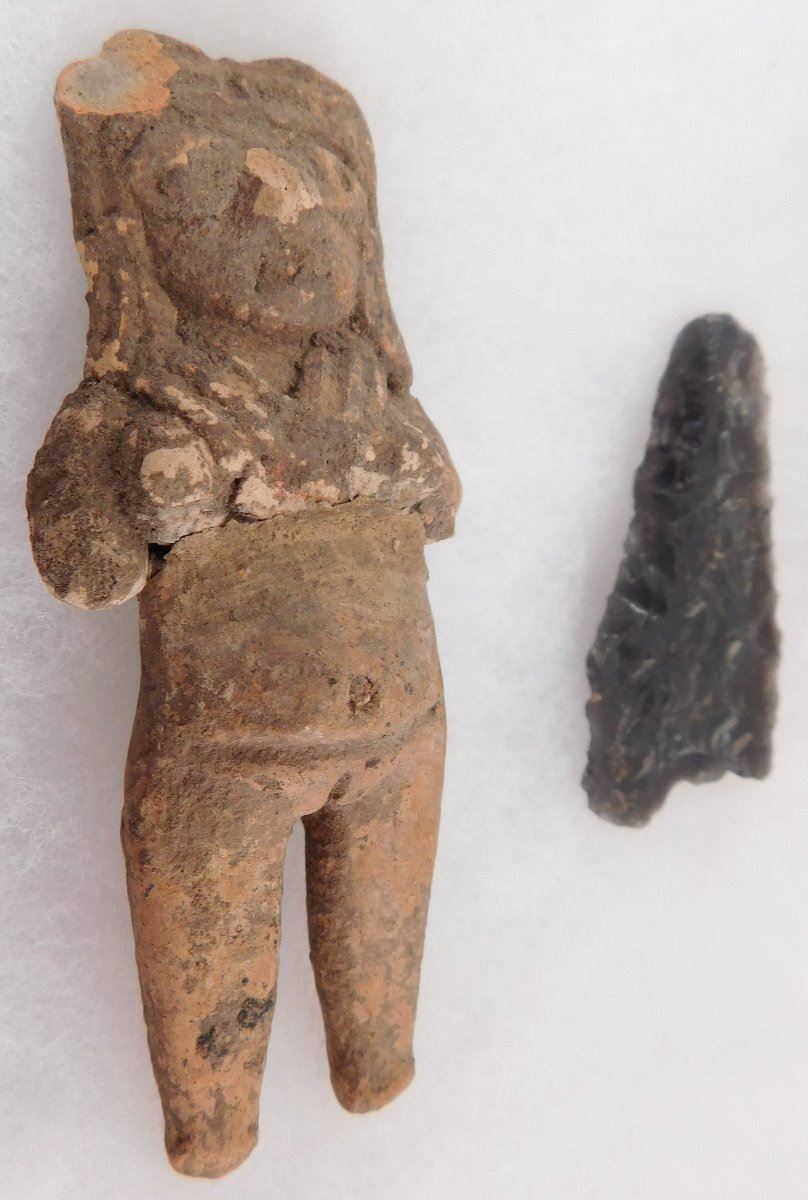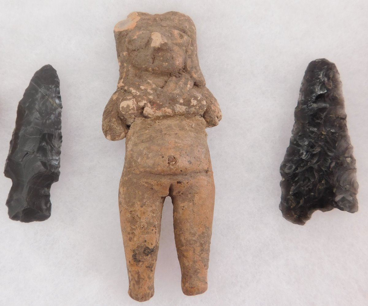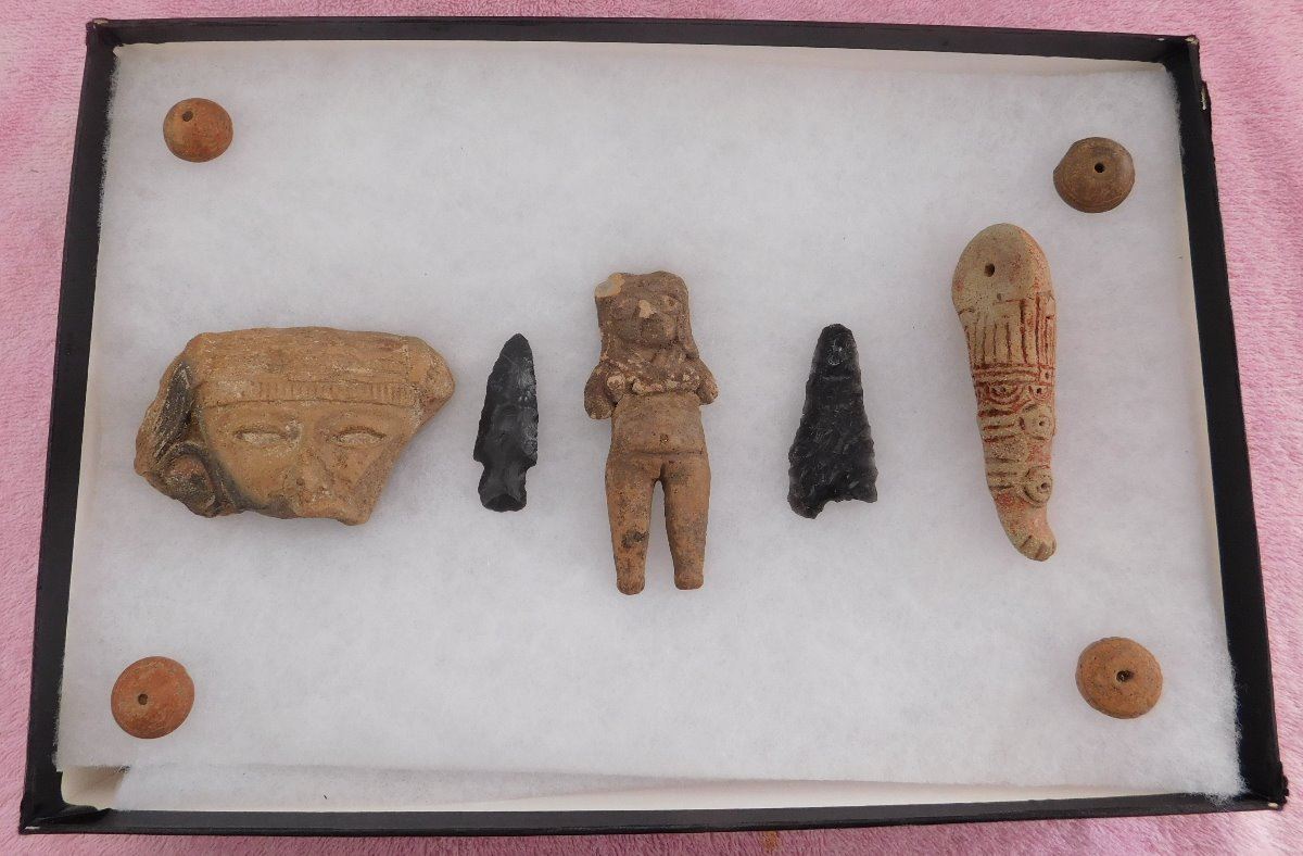 Authentic Pre-Columbian Relics, circa 1500 years old. Made of obsidian and clay, the items are 0.75" to 3.5" long. From central Mexico. Good example of found pre-columbian relics. Frame not included. Condition: As found, see images. Shipping: $25.00 w/insurance and signature.
