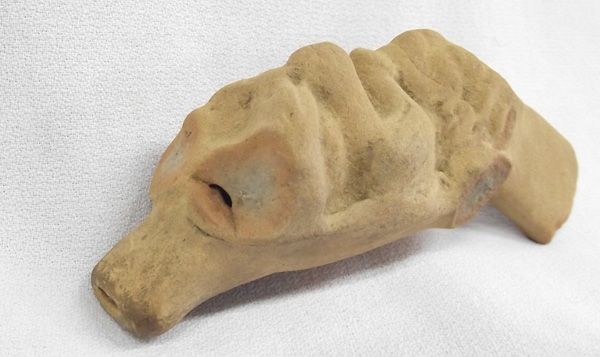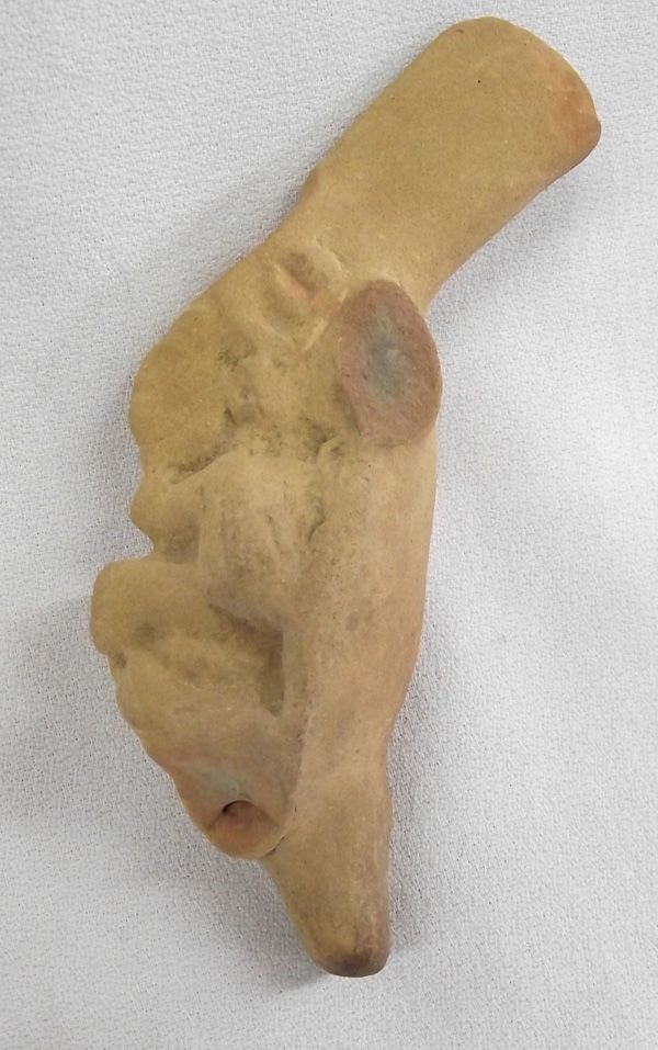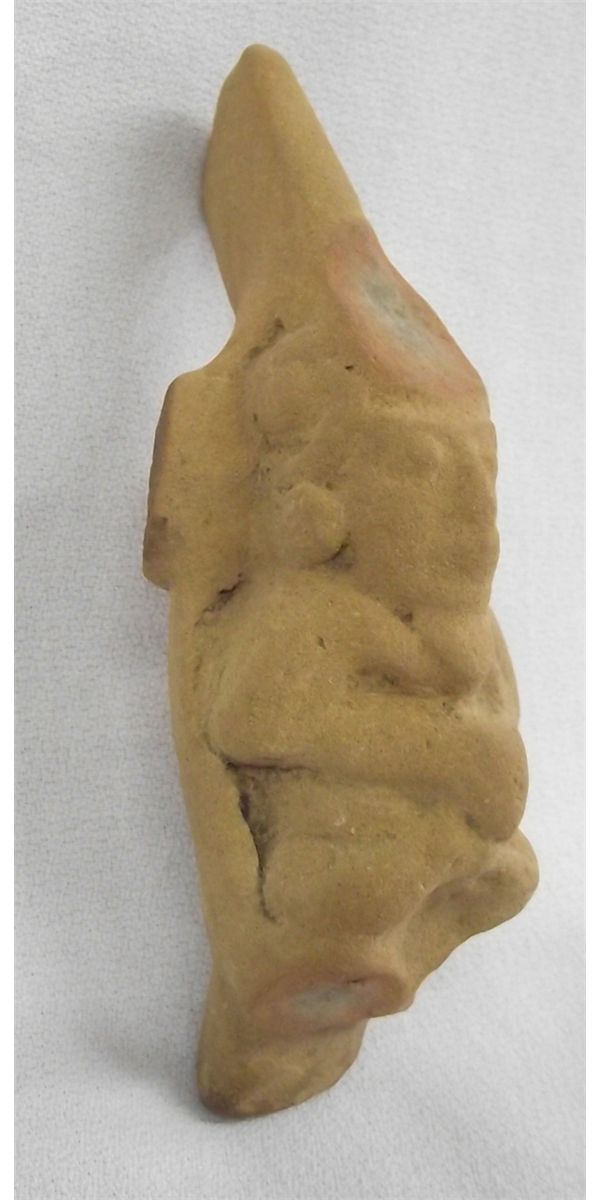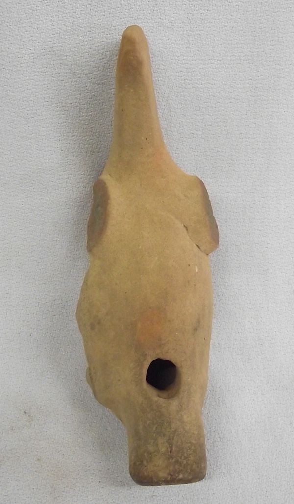 Authentic Precolumbian Pottery Idol Whistle, measures approx. 6''L x 2''W x 1''D. Three broken Embellishments around the head of the Idol.