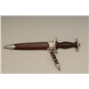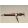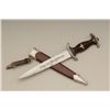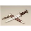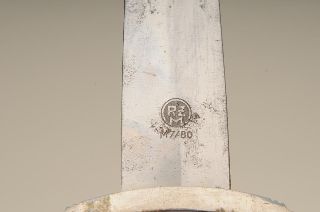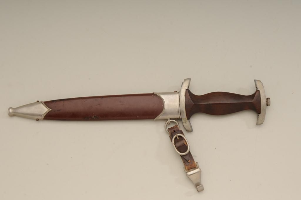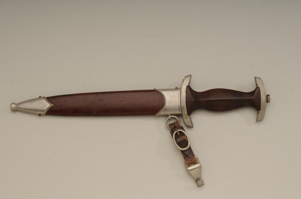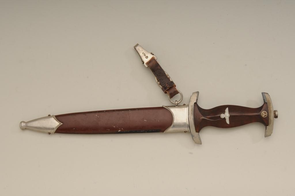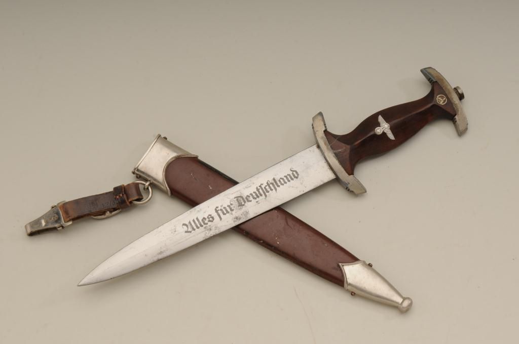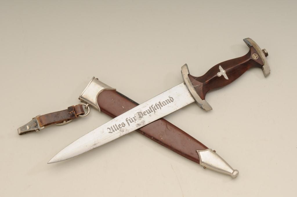 Authentic S.A. dagger with scabbard and hanger. The blade shows RZM marking with and is marked M7/80 and typical Allis for Deutschland inscription. The blade is in good to very good condition with some minorerosion and pinprick printing with some slight scratches. The handle is very good plus and the exterior mounts show some oxidation and normal aging. The brown paint on the scabbard remains 75% to 85%. From oneof San Diego’s oldest collections. Est.: $300-$600.